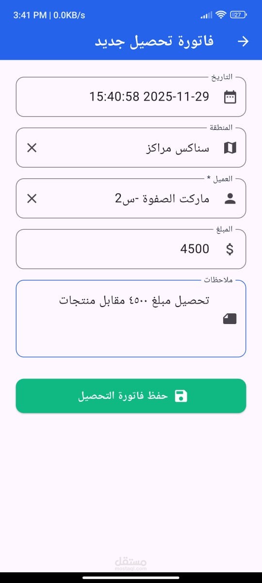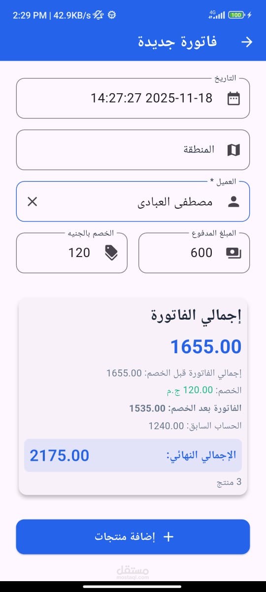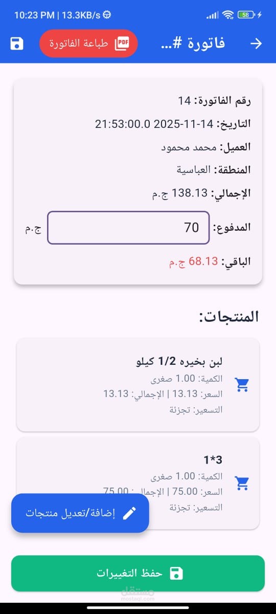 يتيح التطبيق إنشاء الفواتير الجديدة بسهولة، مع إمكانية تعديلها ومراجعتها في أي وقت، إضافة إلى خيار طباعتها مباشرة بصيغة PDF.
