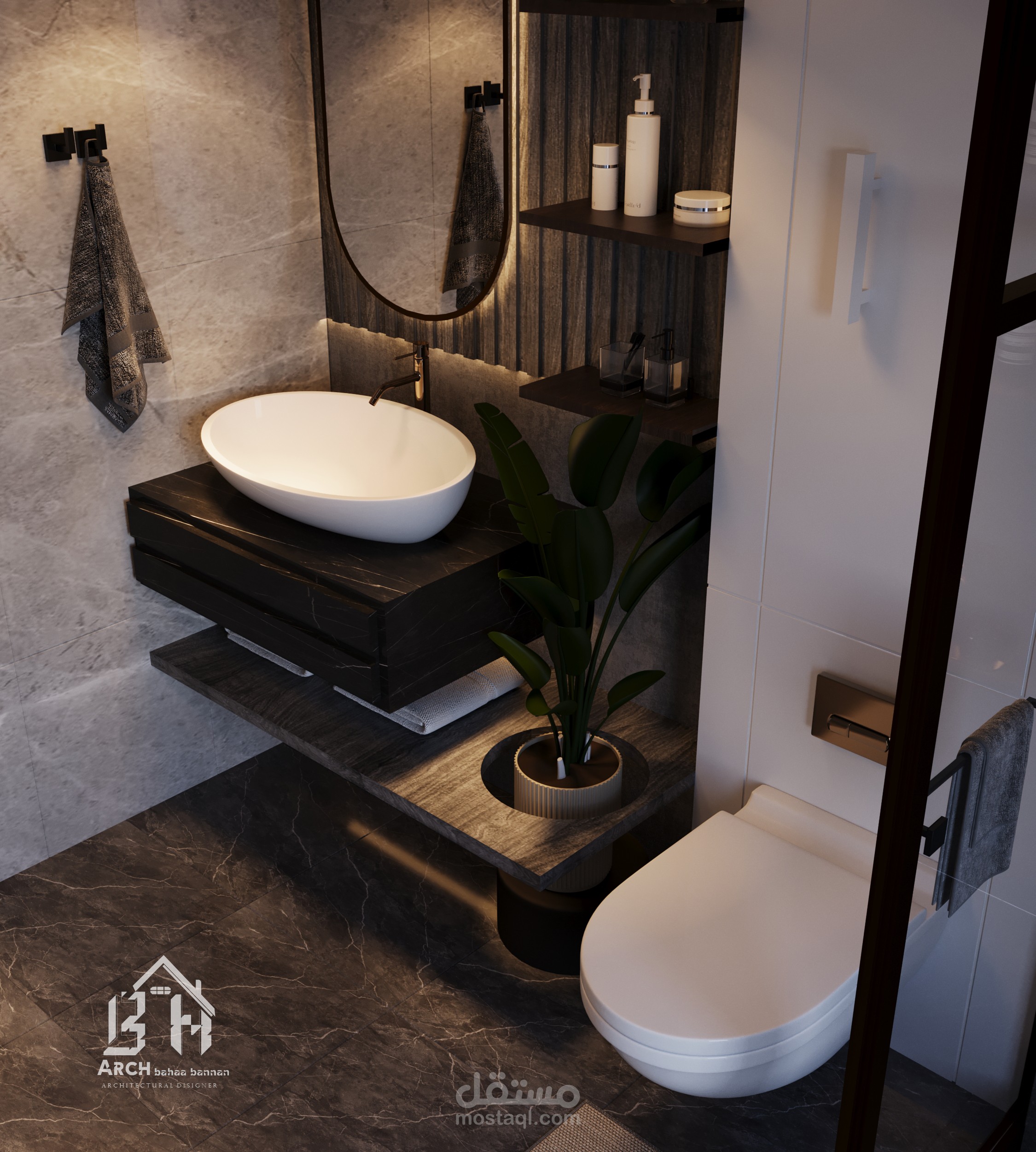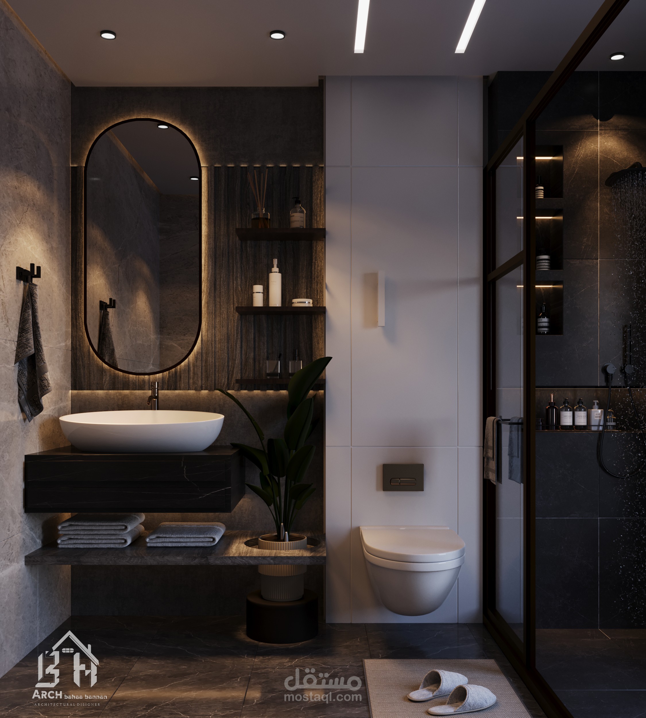 تصميم حمام مورن يجمع بين الجمال والوظيفة تم الاعتماد على الغاء البانيو واستبداله في غرفة دوش خاصة وتم الاعتماد على الاضائة الصناعية الحديثة التي تحقق التوازن الحراري للمكان