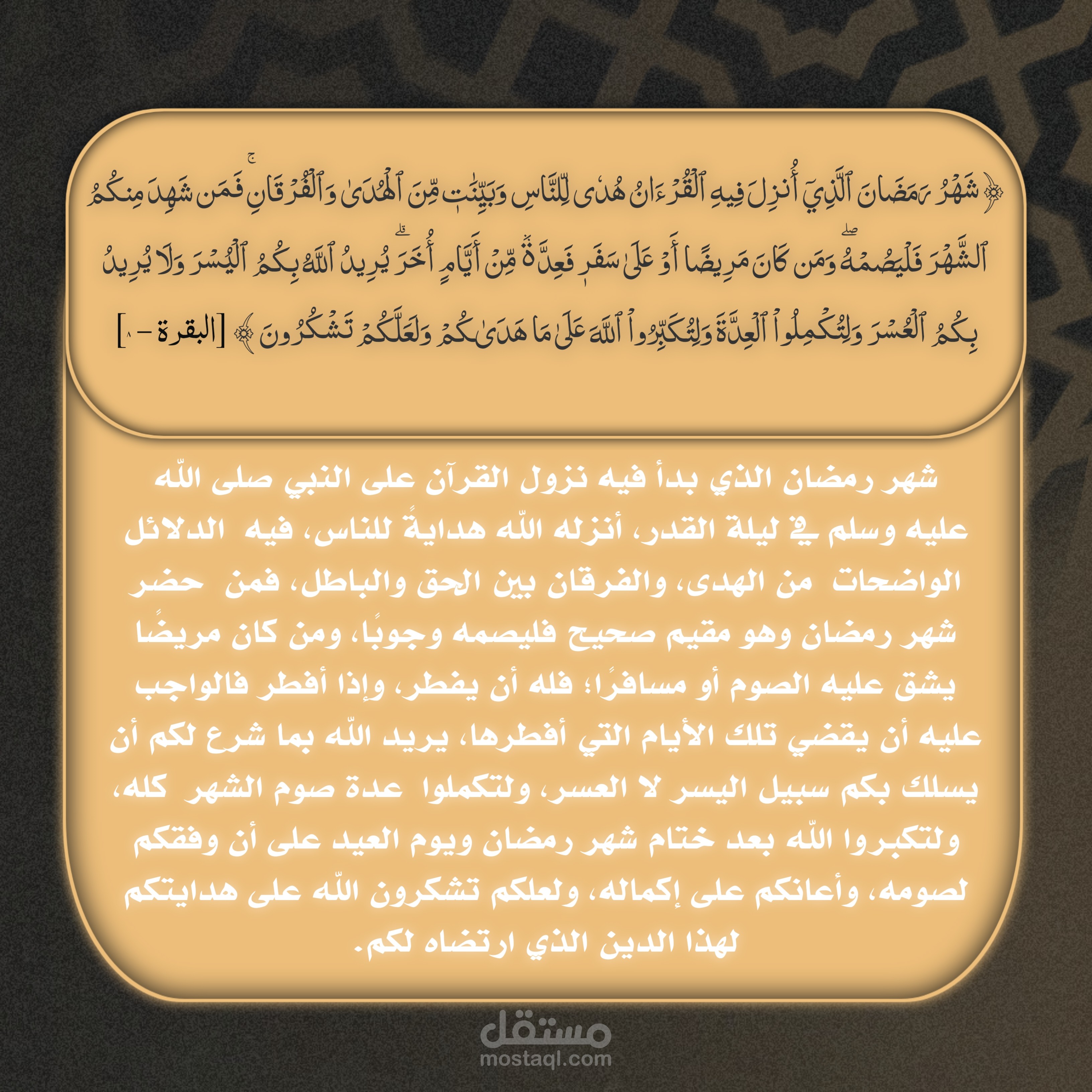 منشور رمضاني بتصميم أنيق وهادئ، أسلوب التصميم بسيط وواضح، يعكس جوّ الشهر الكريم ويضيف لمسة روحانية مناسبة للمحتوى التوعوي والإيماني.