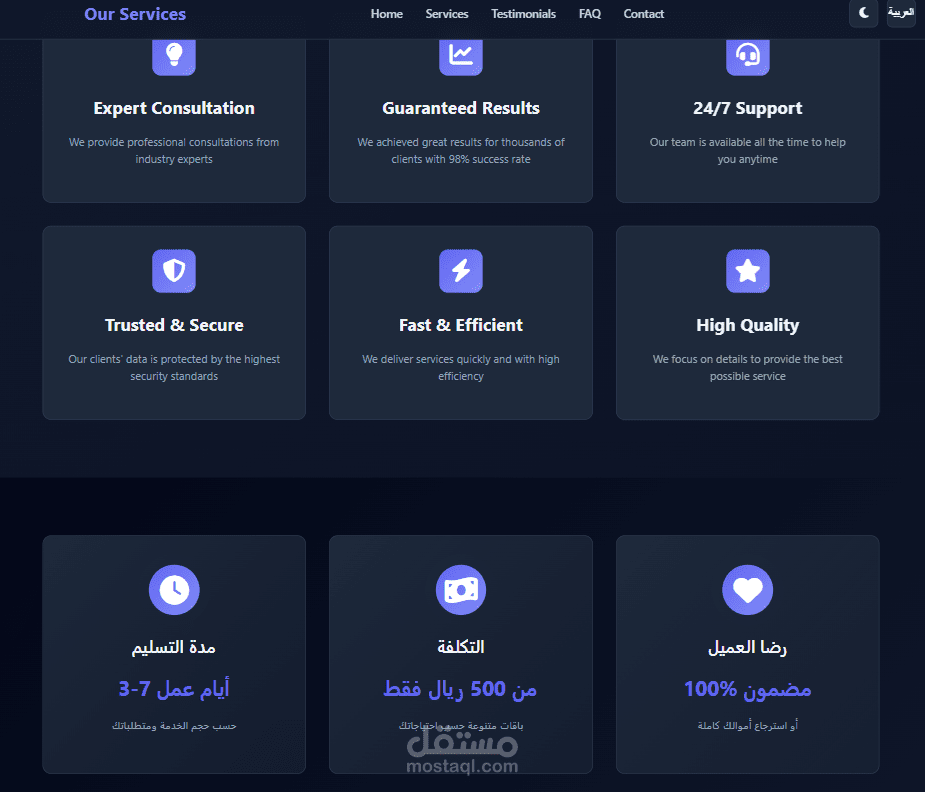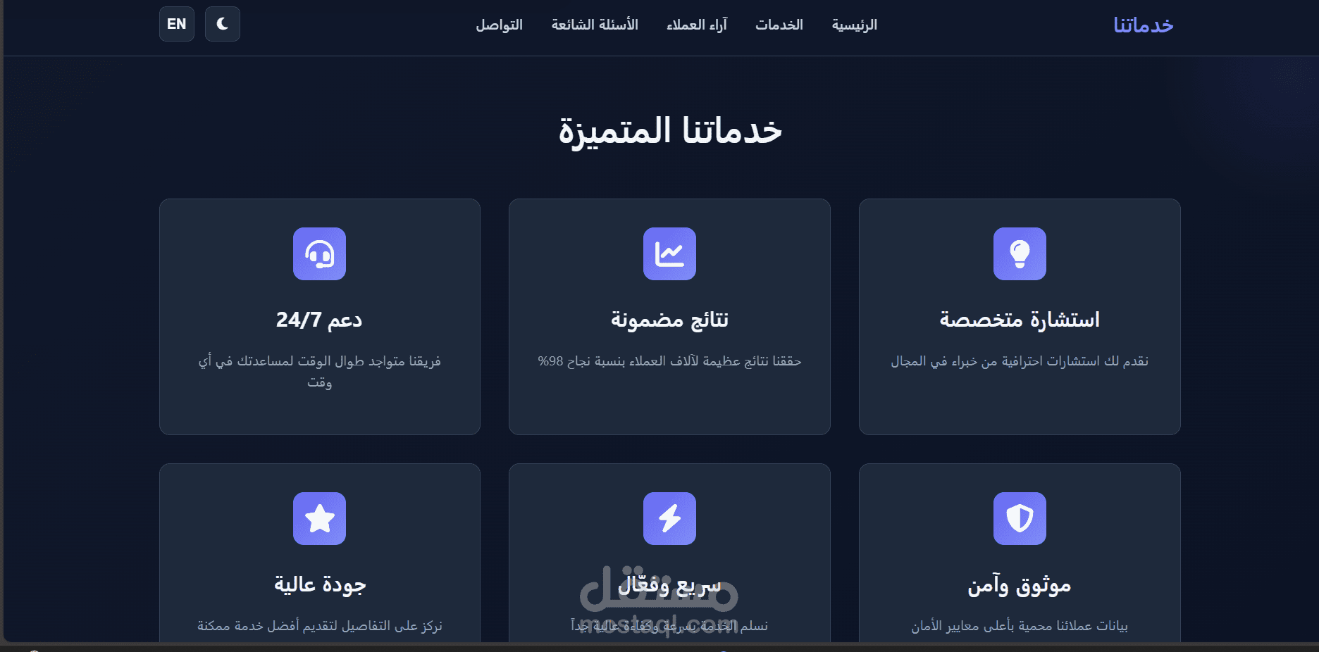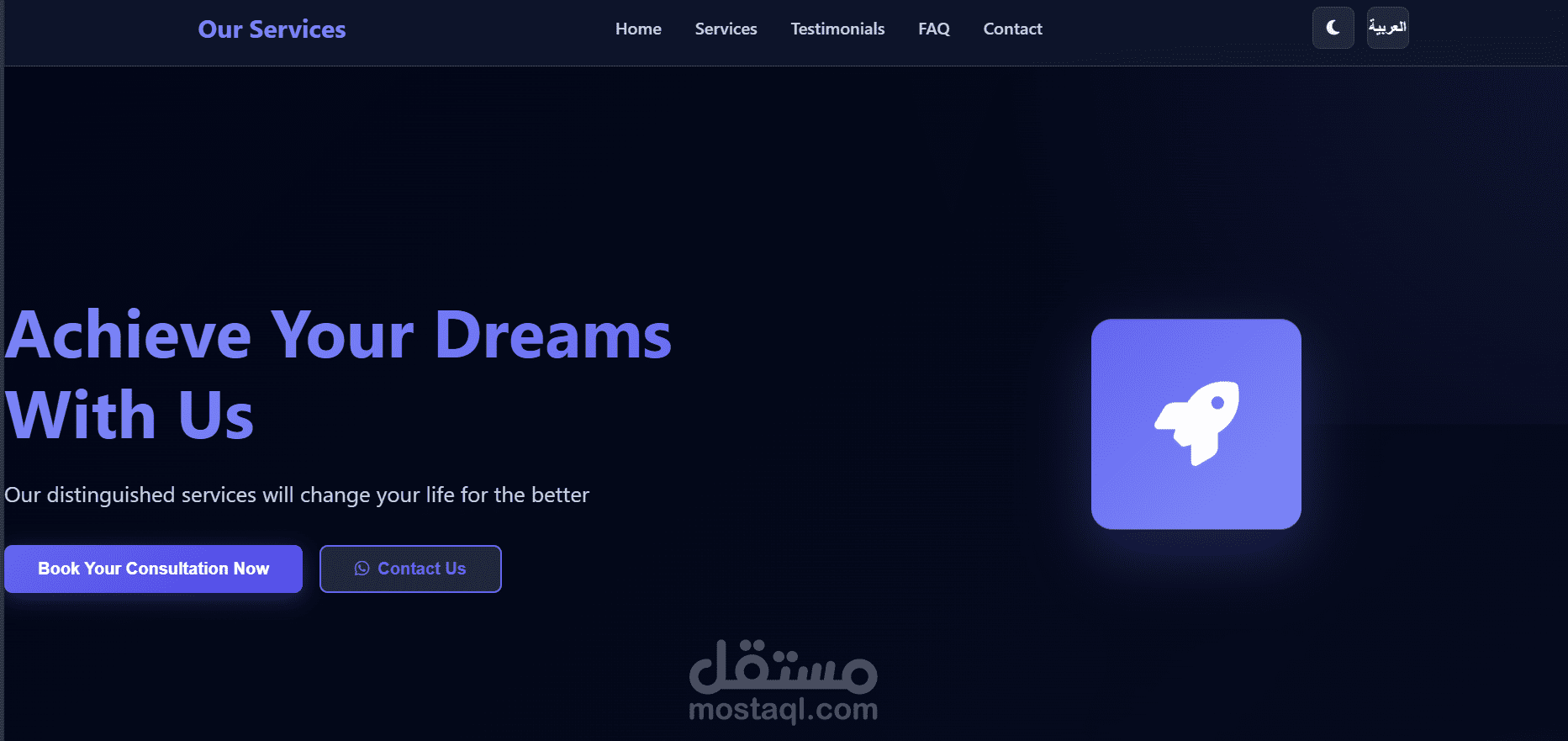 صفحة هبوط حديثة وجذابة مع تصميم داكن وأنيميشنات سلسة. صفحة واحدة فقط تركز على تحويل الزوار إلى عملاء.