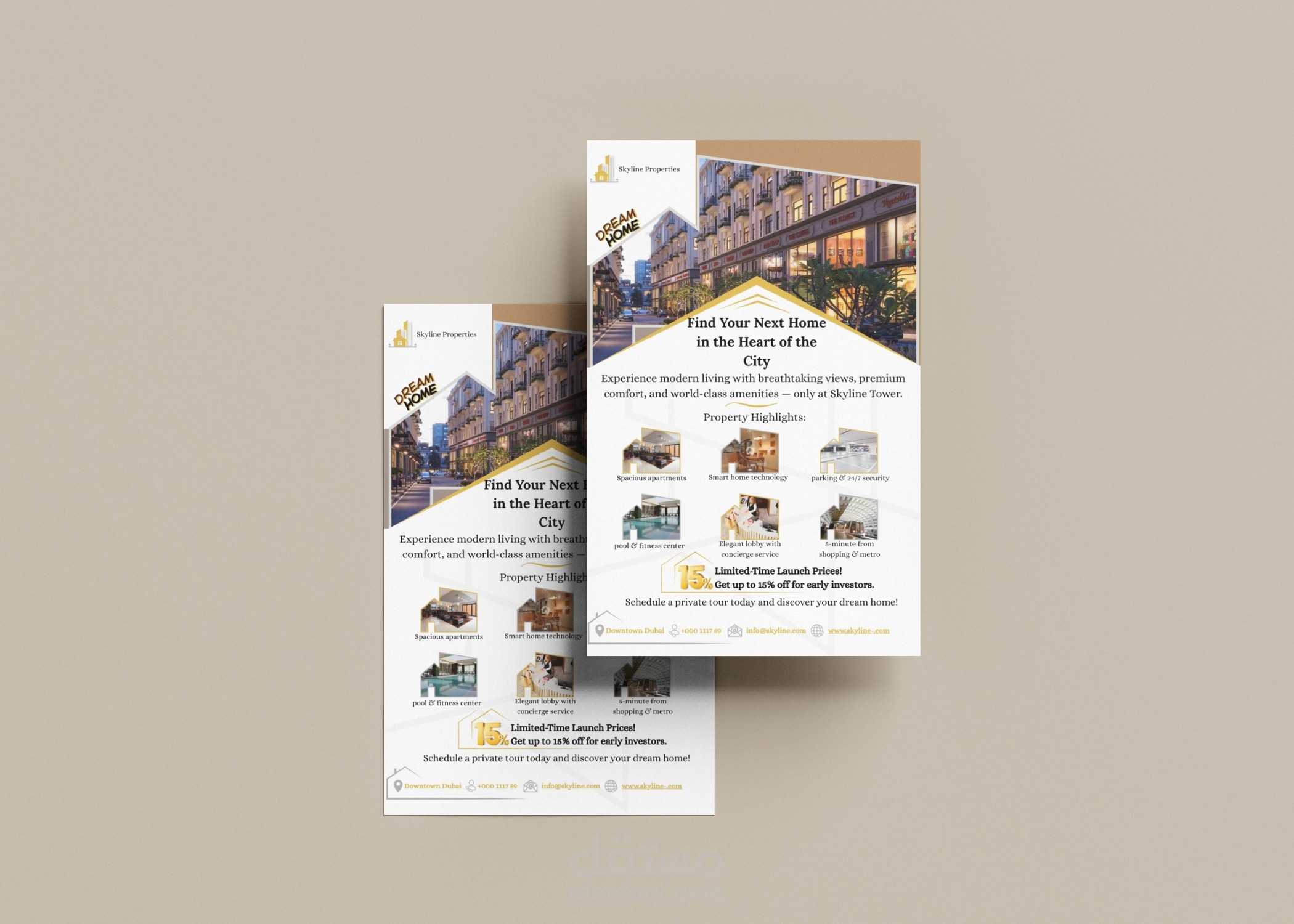 The design combines structured layout, premium typography, and balanced imagery to highlight real estate offerings in a polished and professional way.