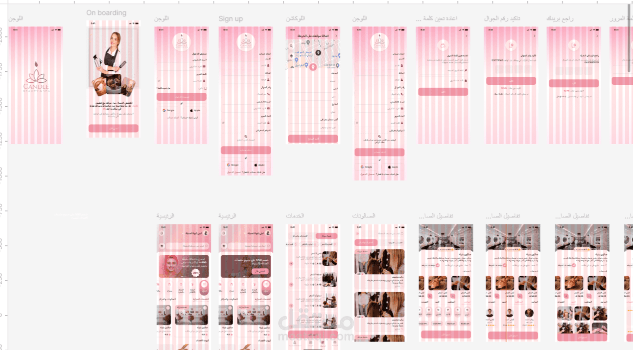 يشمل التصميم شاشات: تسجيل الدخول، إنشاء حساب، الصفحة الرئيسية، الخدمات، تفاصيل الخدمة، الحجز، الدفع،كروت الاهداء ، والملف الشخصي.
