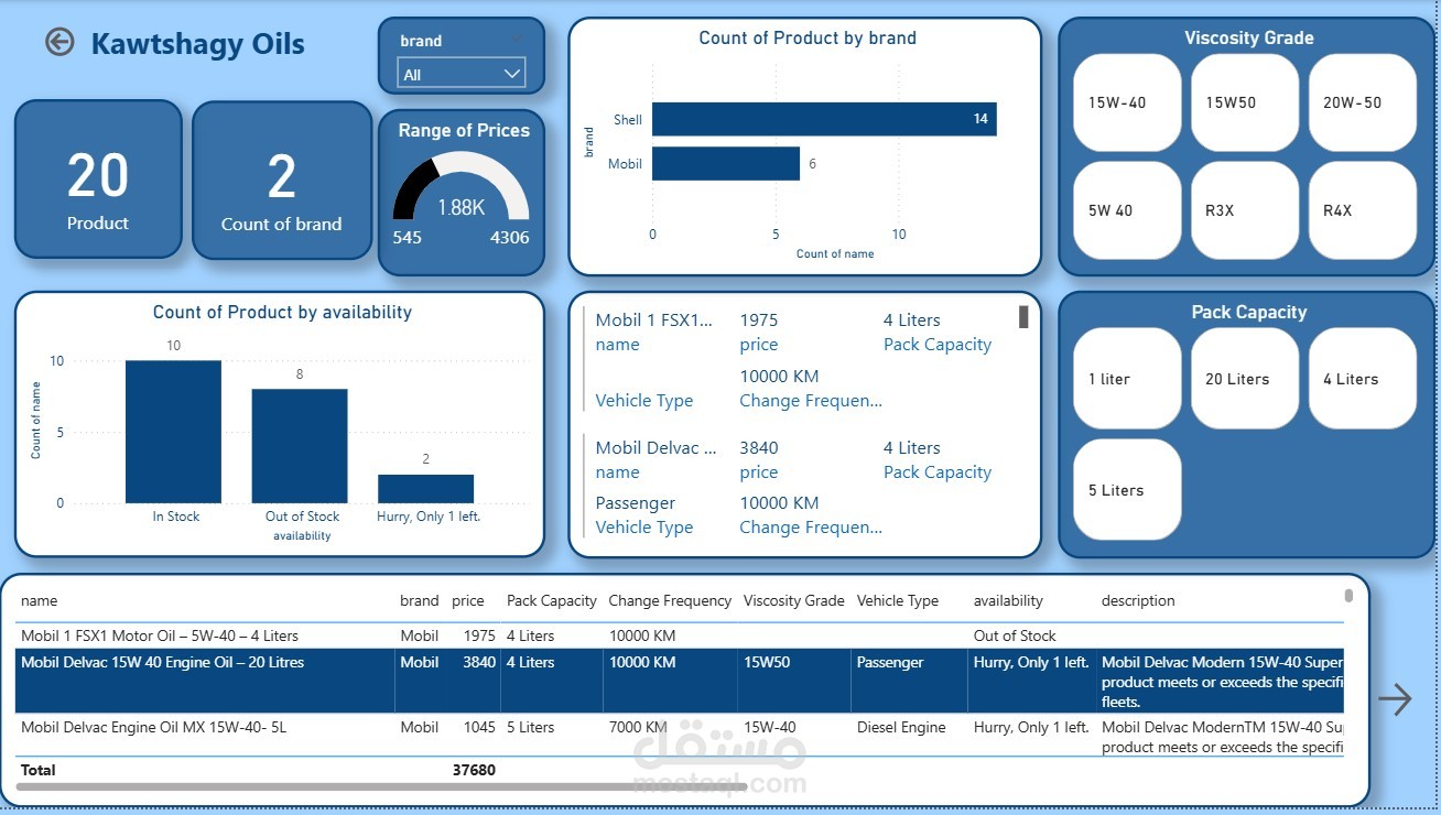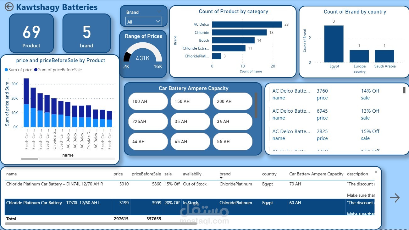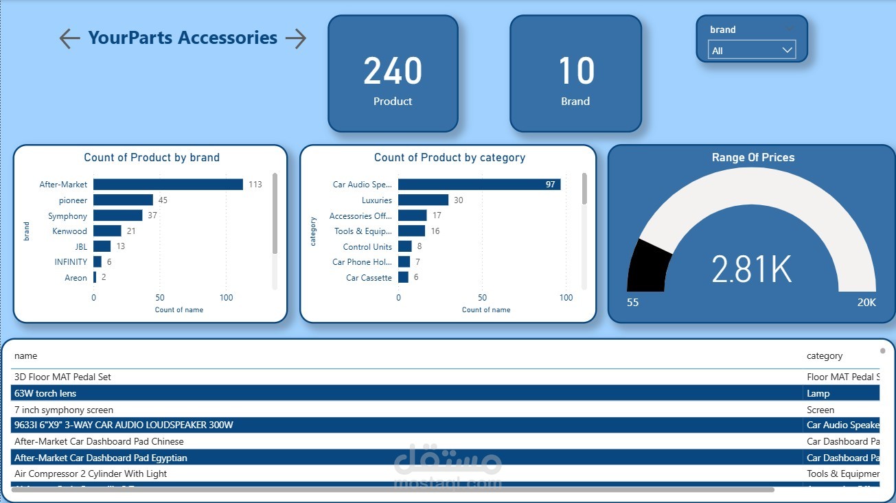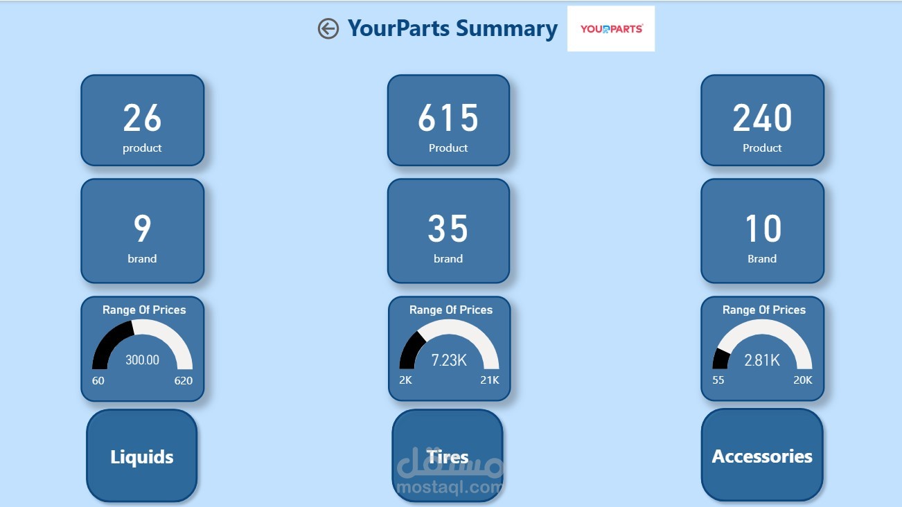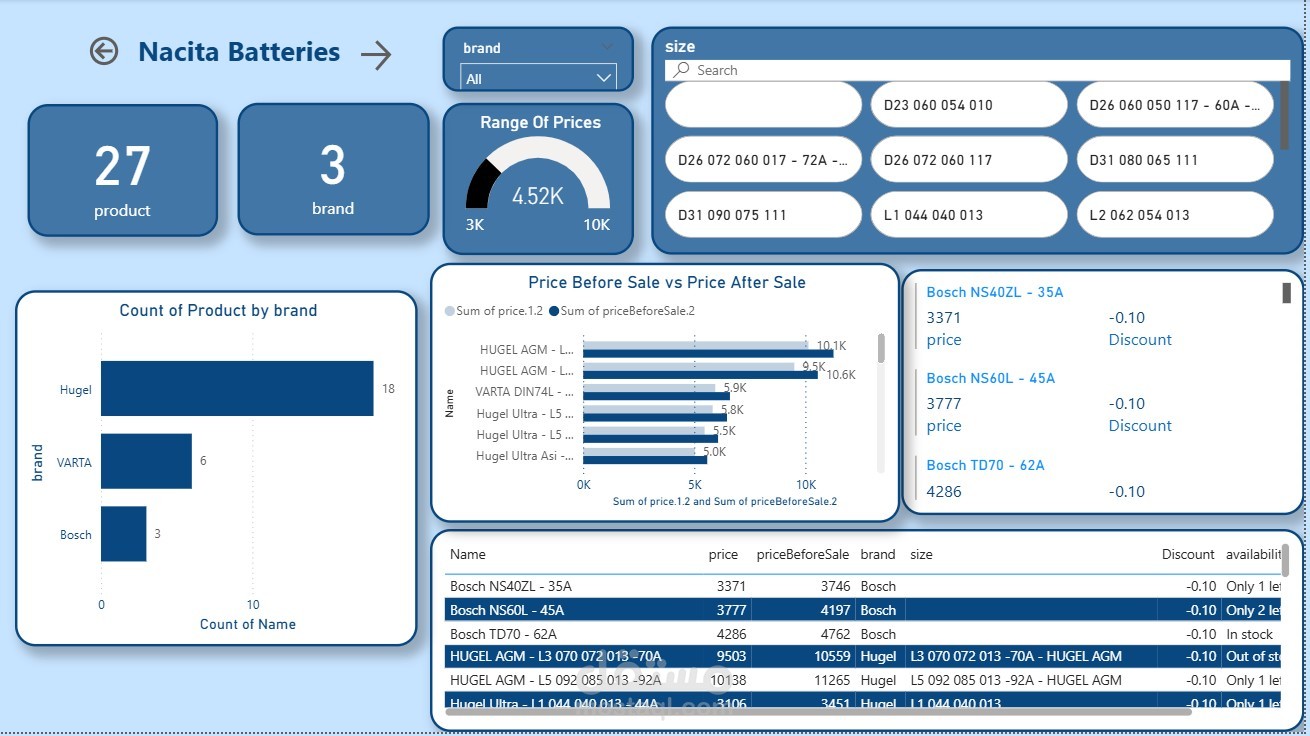 قمت بتطوير داشبورد تفاعلية متكاملة باستخدام Power BI بهدف تحليل أسعار قطع غيار السيارات المجمّعة من عدة مواقع ومنصات بيع مختلفة. تعتمد الداشبورد على بيانات تم جمعها من خلال Web Scraping ثم تنظيفها ومعالجتها لعرض رؤية واضحة عن اختلافات الأسعار واتجاهات السوق.