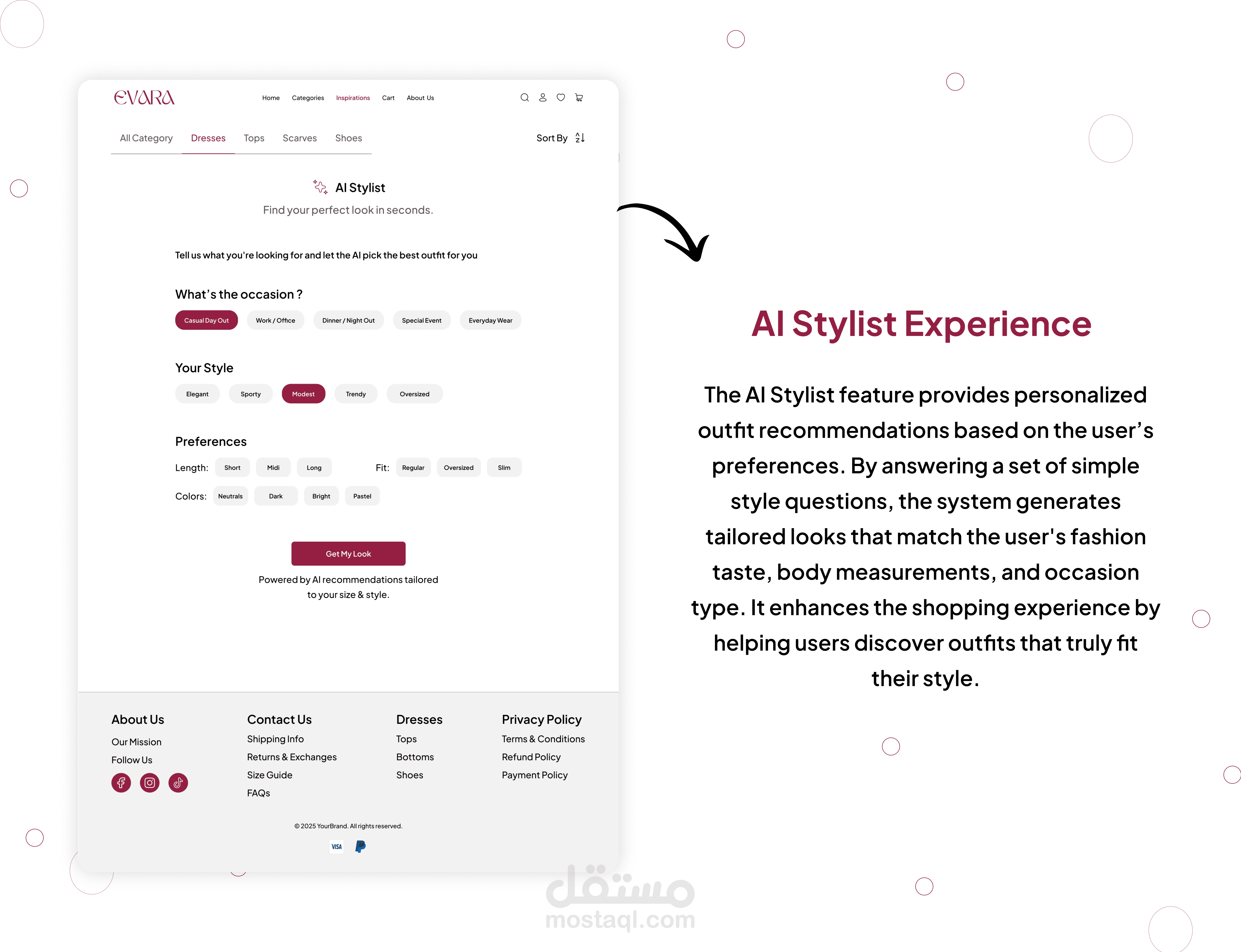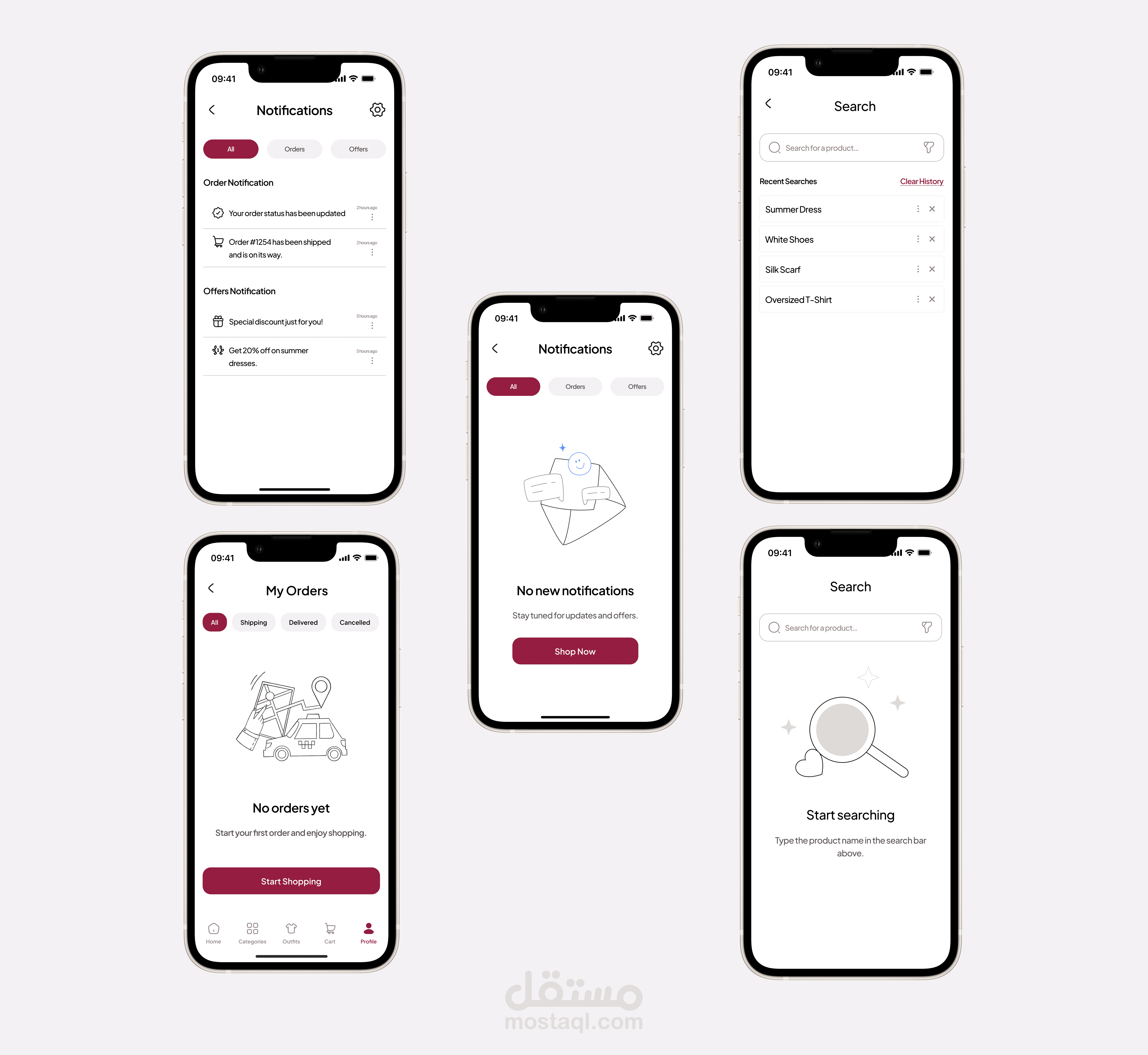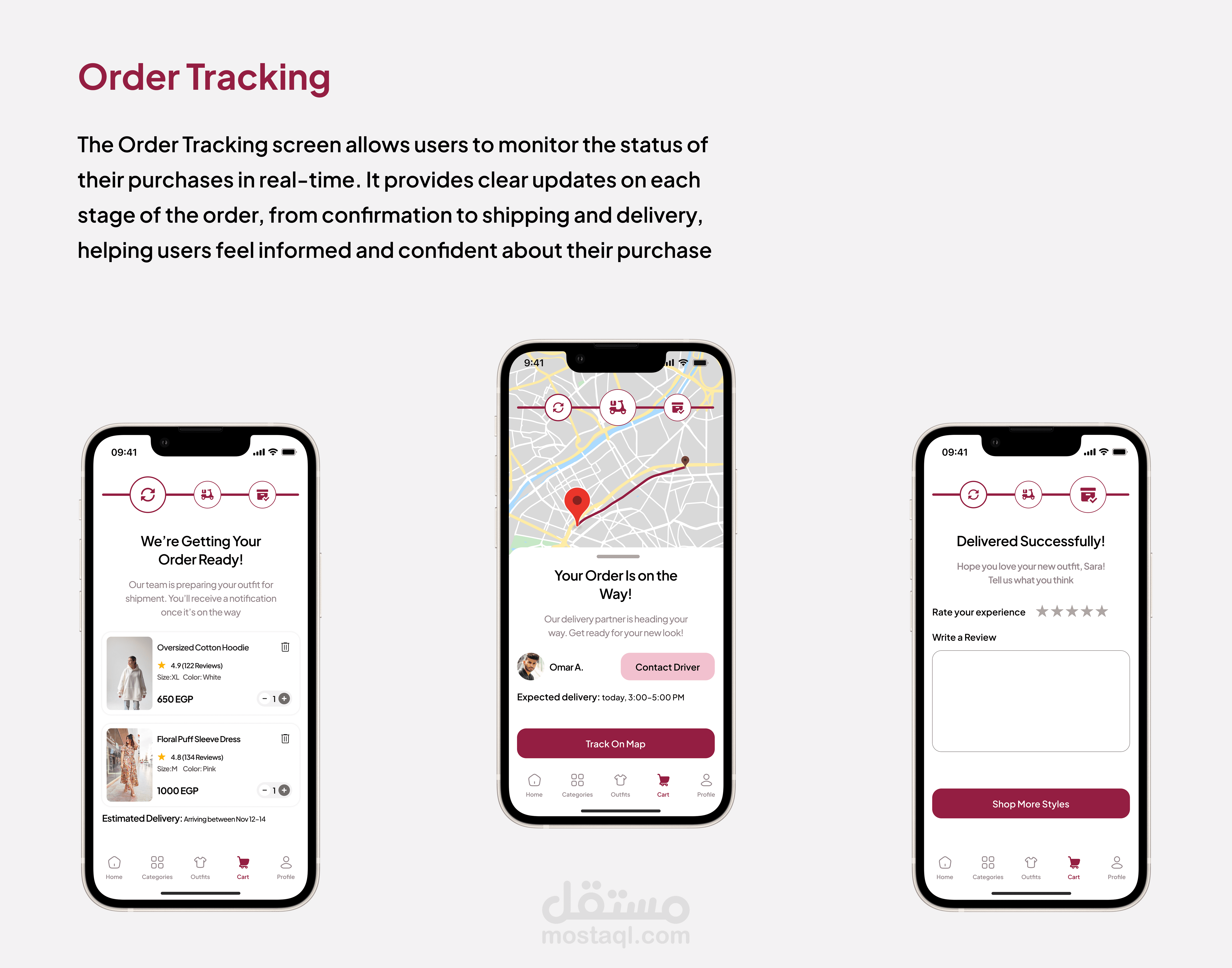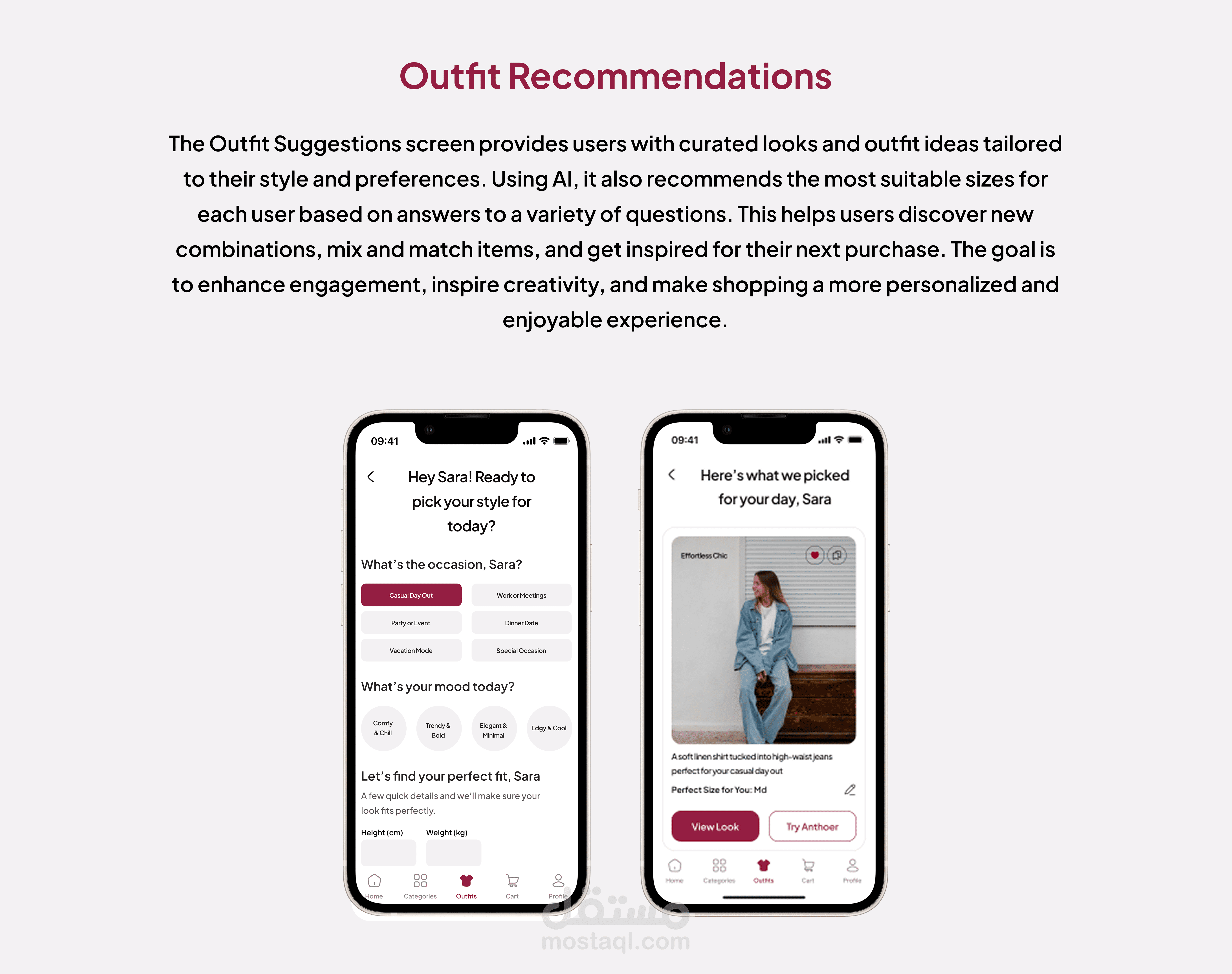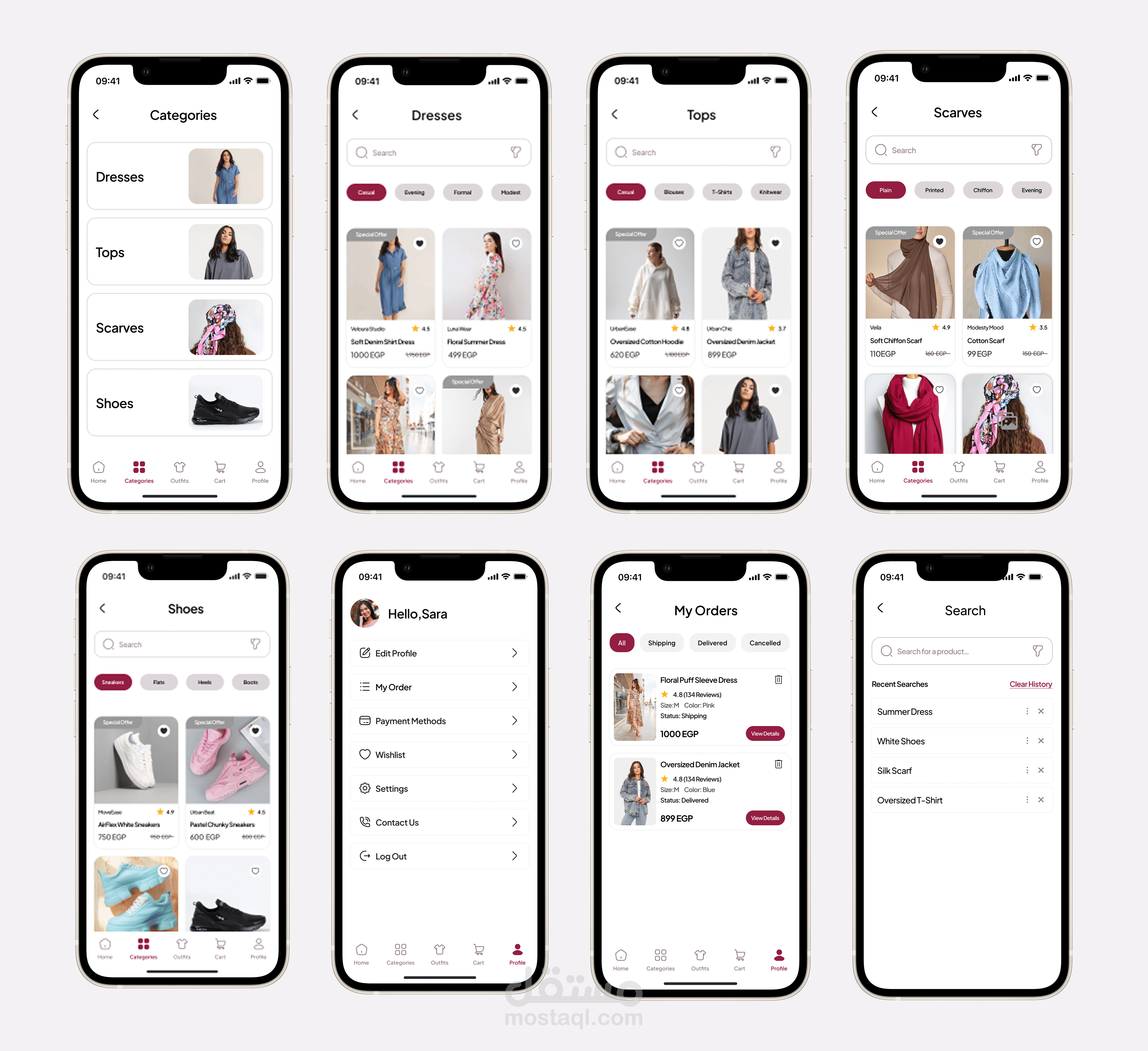 إضافة خصائص زي الإلهام (Outfit Ideas)، المفضلة، وتتبع الطلبات.