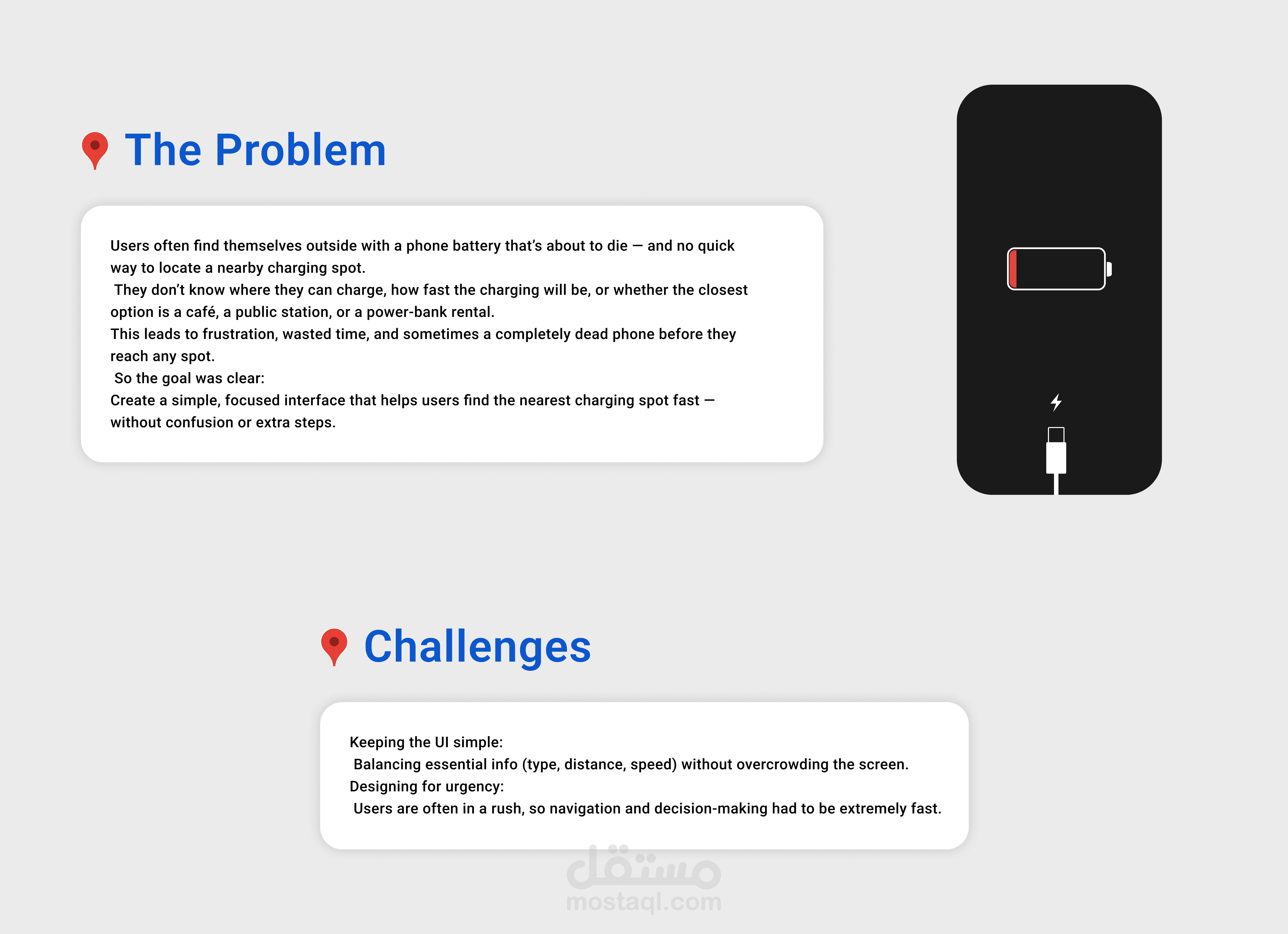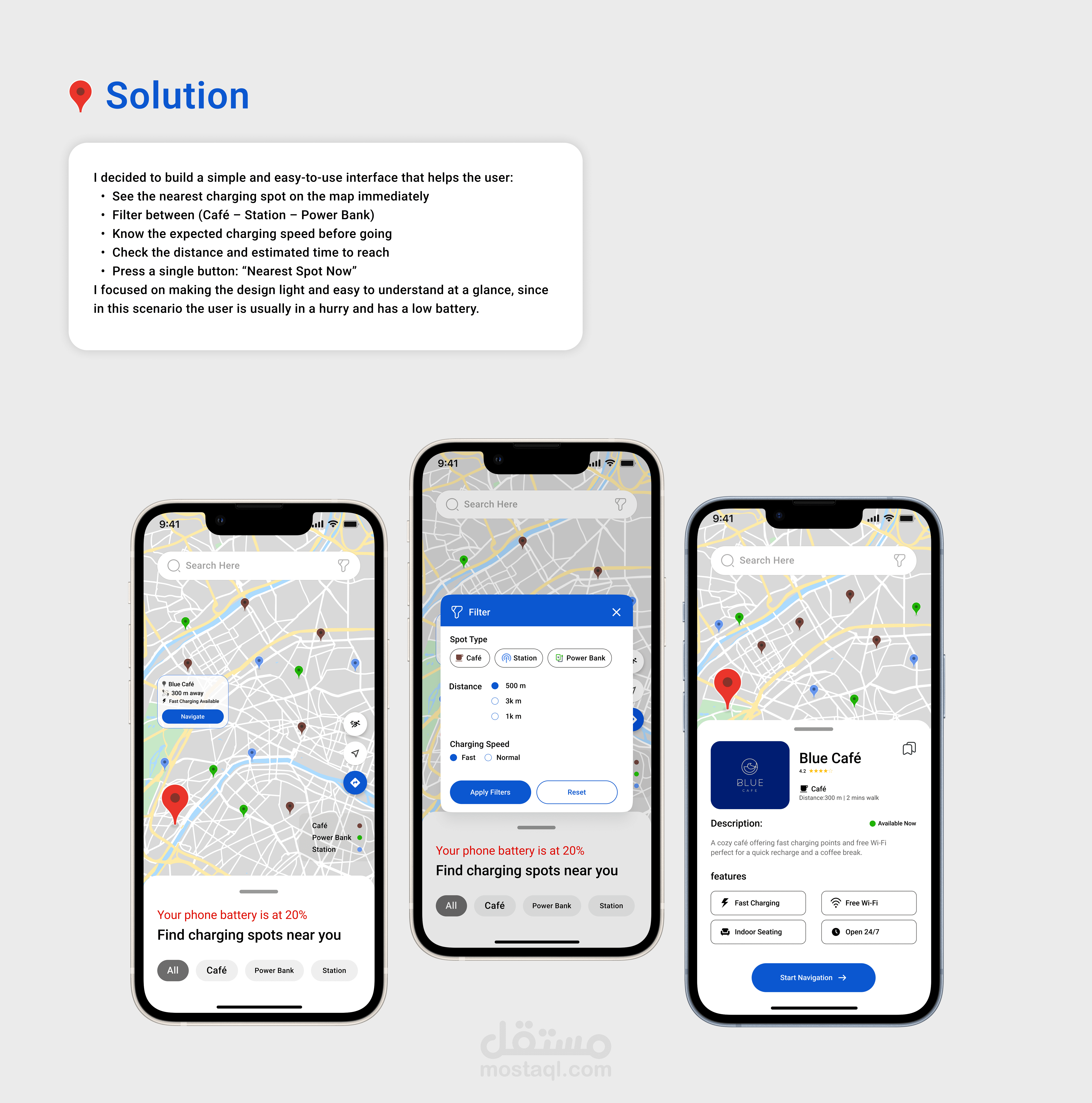 ChargeSpot هو مشروع تصميم واجهات تطبيق يهدف إلى مساعدة المستخدمين في إيجاد أقرب مكان لشحن هواتفهم بسرعة وسهولة. يركز التصميم على تجربة المستخدم البسيطة والواضحة، مع توفير إمكانية التصفية بين كافيه، محطة، أو باور بانك، ومعرفة سرعة الشحن والمسافة المتوقعة للوصول.