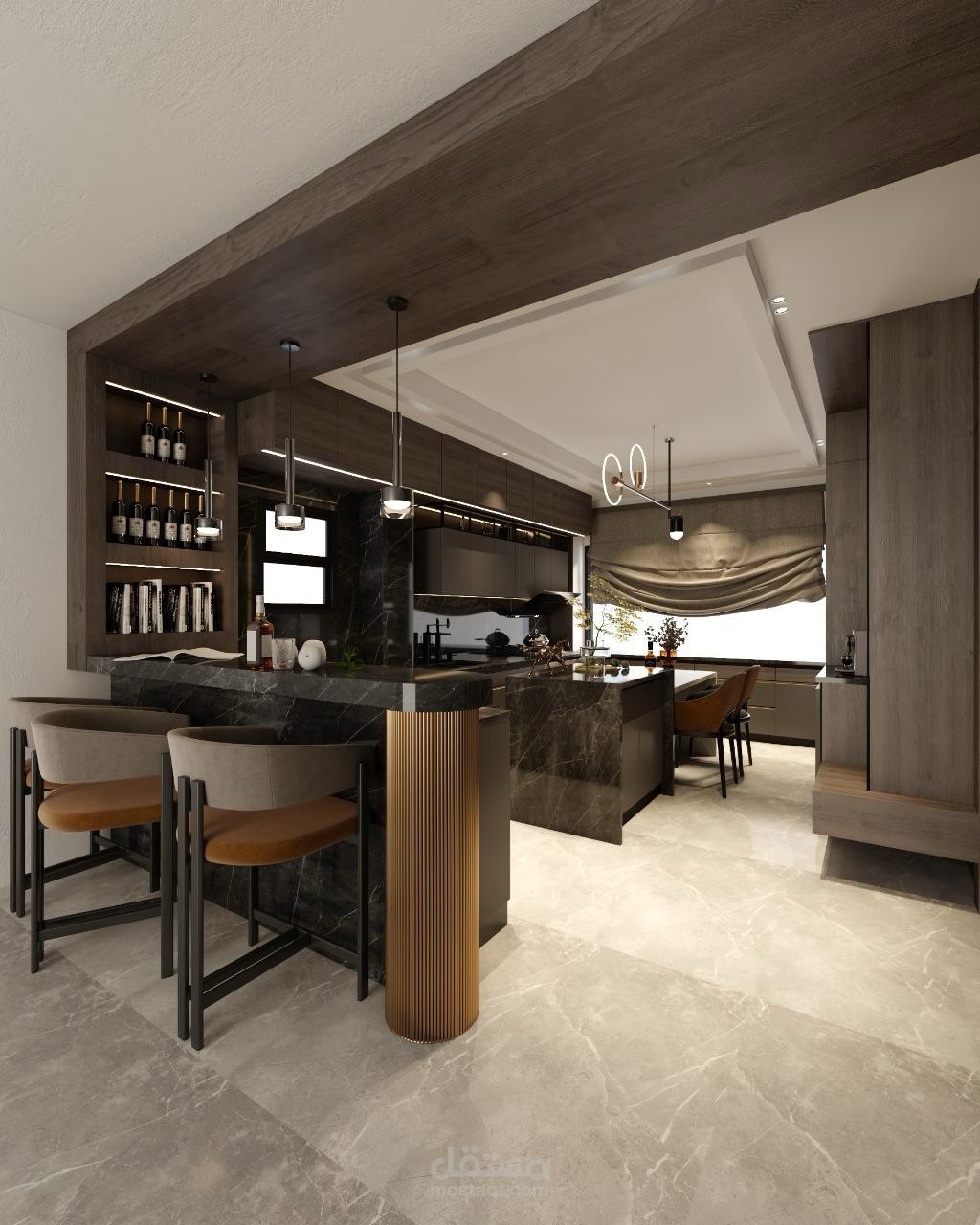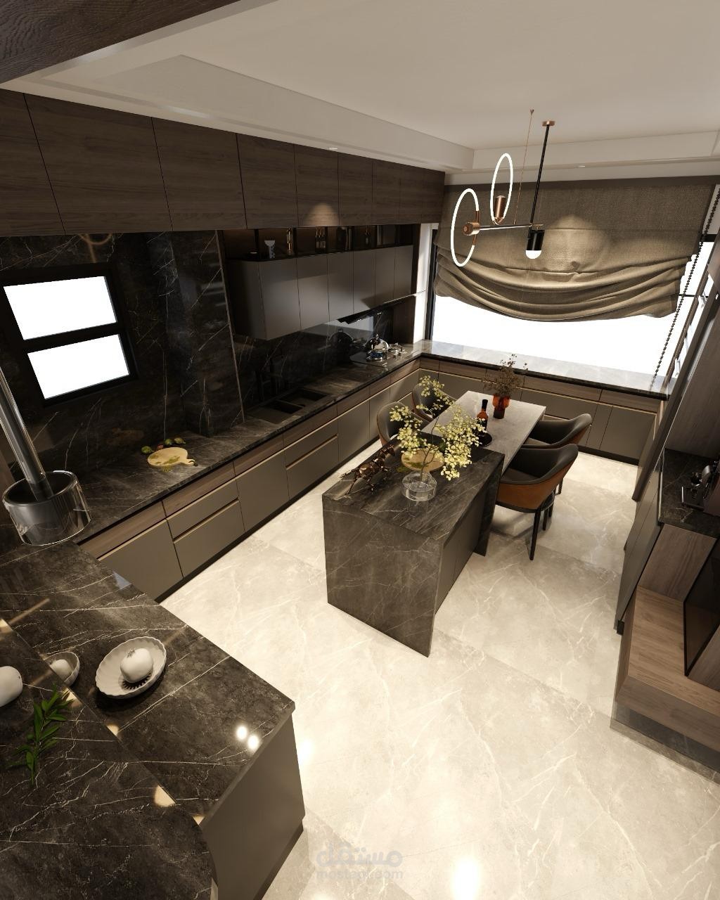 A modern kitchen interior designed and rendered using 3ds Max with realistic lighting, accurate materials, and clean detailing. The design focuses on balanced colors, functional layout, and a high-quality visual finish that highlights the overall atmosphere of the space.