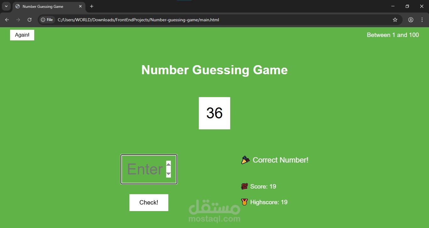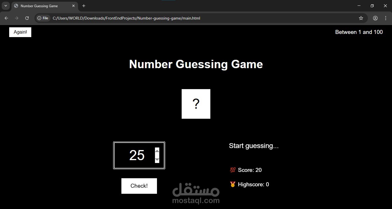 لعبة بسيطة ومسلية يقوم فيها المستخدم بمحاولة تخمين رقم عشوائي تختاره المنظومة ضمن نطاق معيّن، مع إعطائه تلميحات مثل (أعلى / أقل) حتى يصل للرقم الصحيح. يهدف المشروع إلى تدريب المنطق والتركيز وتقديم تجربة تفاعلية خفيفة بواجهة سهلة الاستخدام.