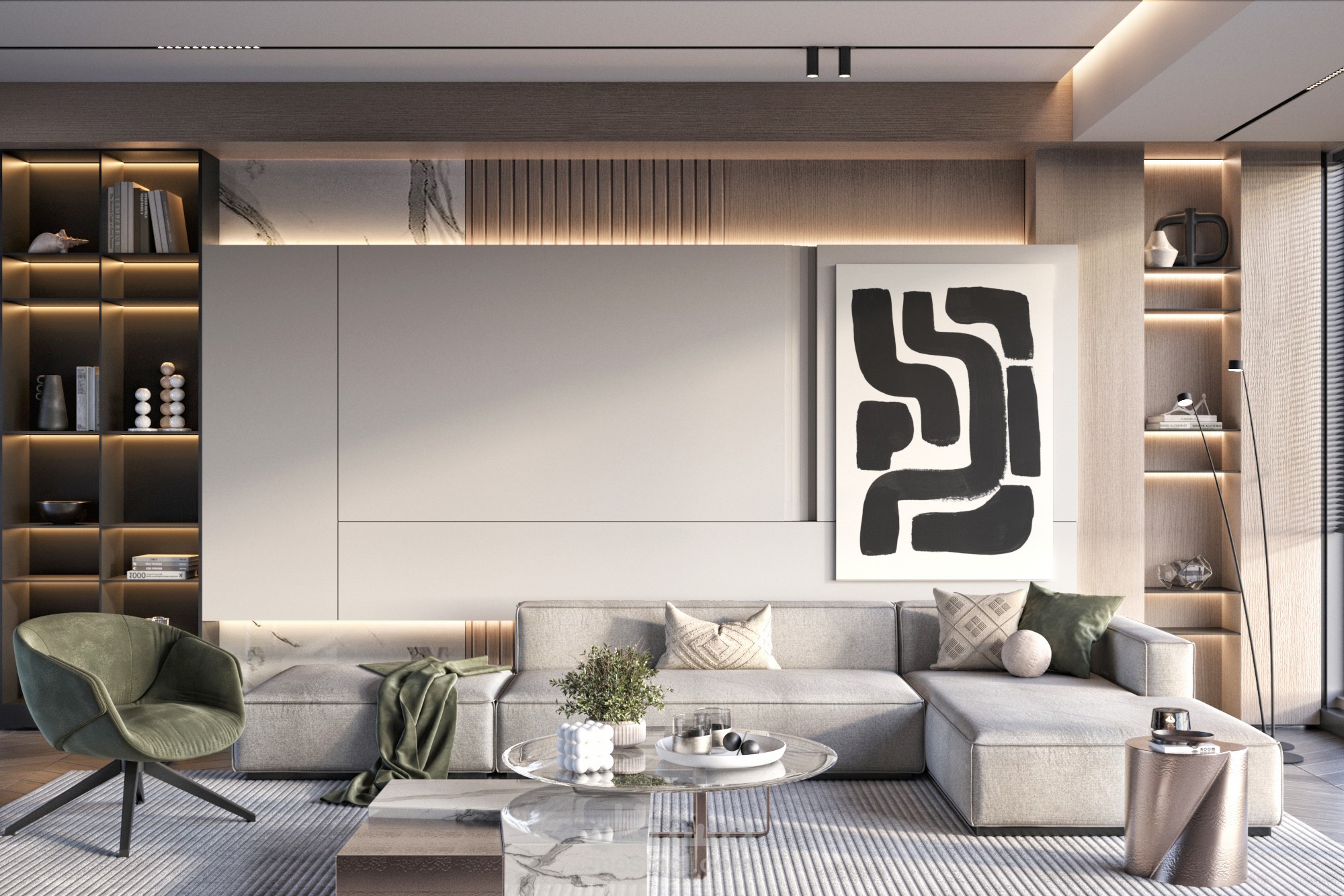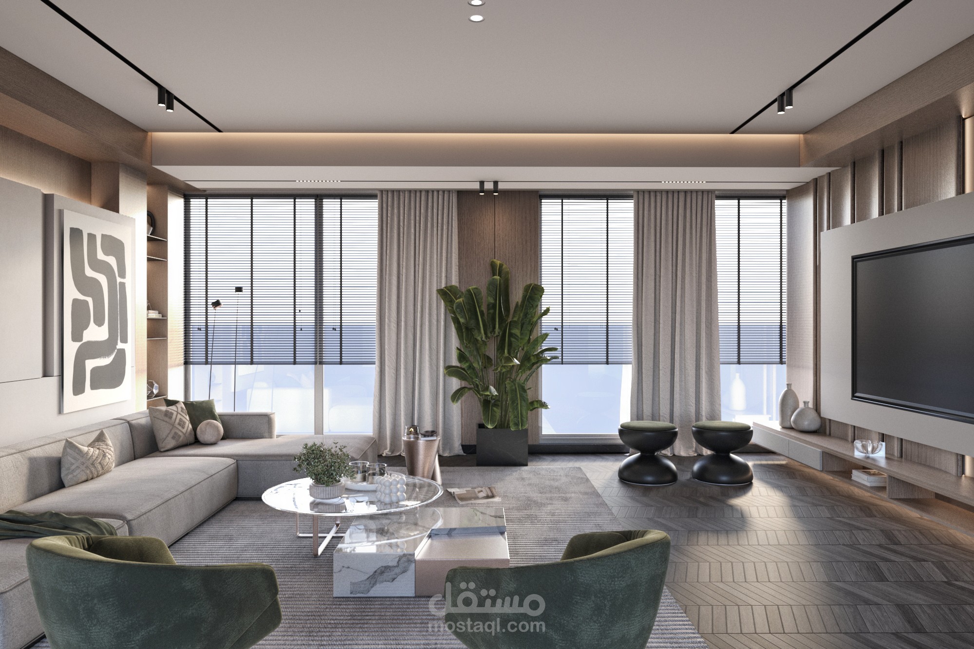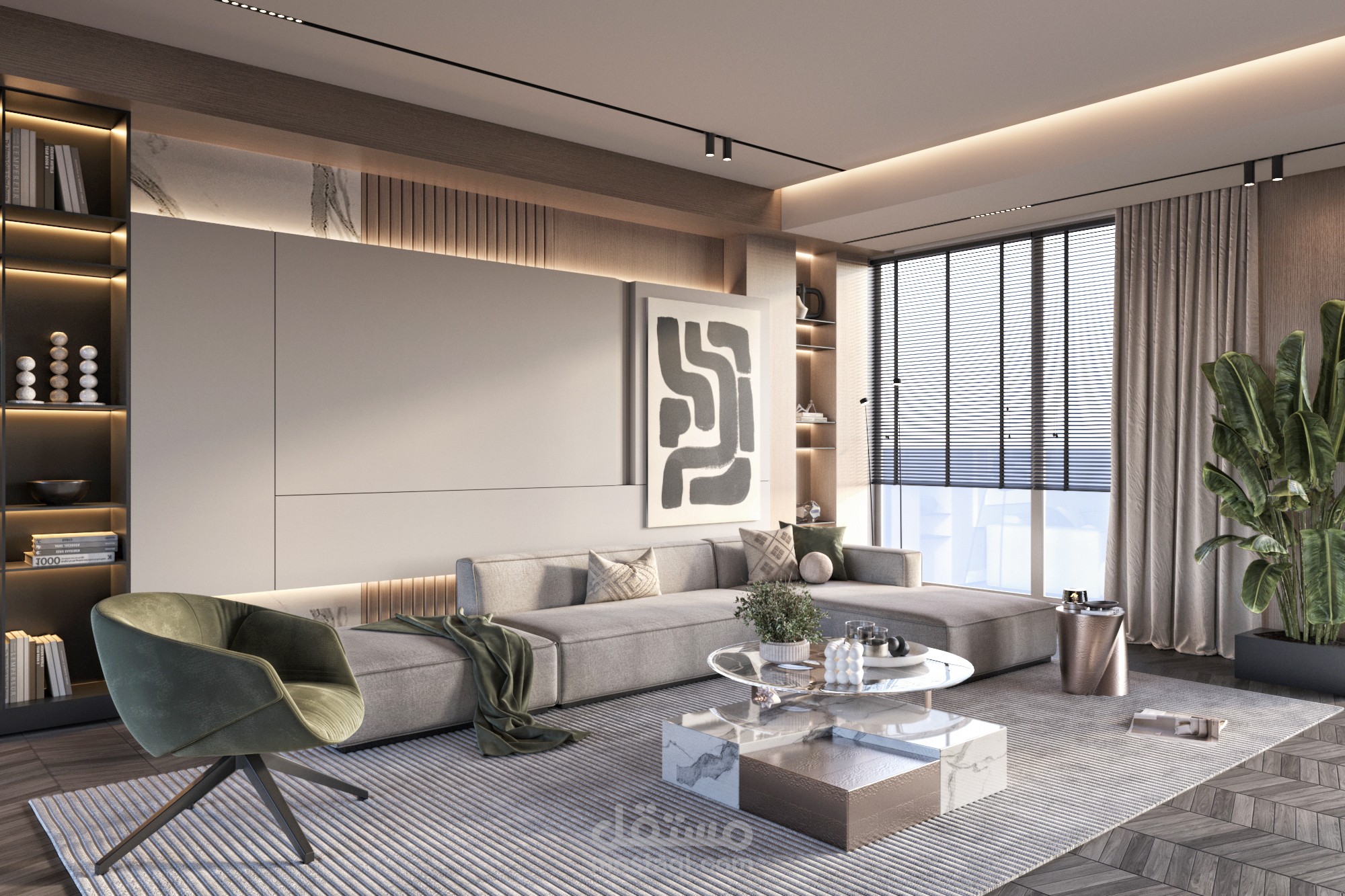 تصميم استقبال أنيق وبسيط، بخطوط نظيفة وألوان هادئة، يعكس أسلوباً حديثاً ويركز على البساطة والوظيفية وأجواء ترحيبية."