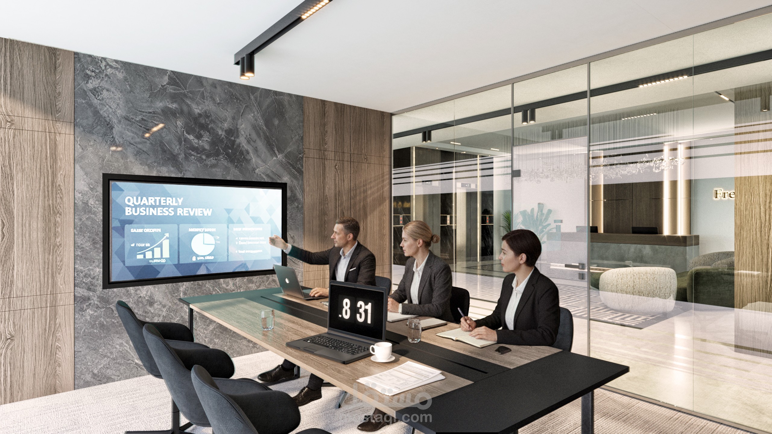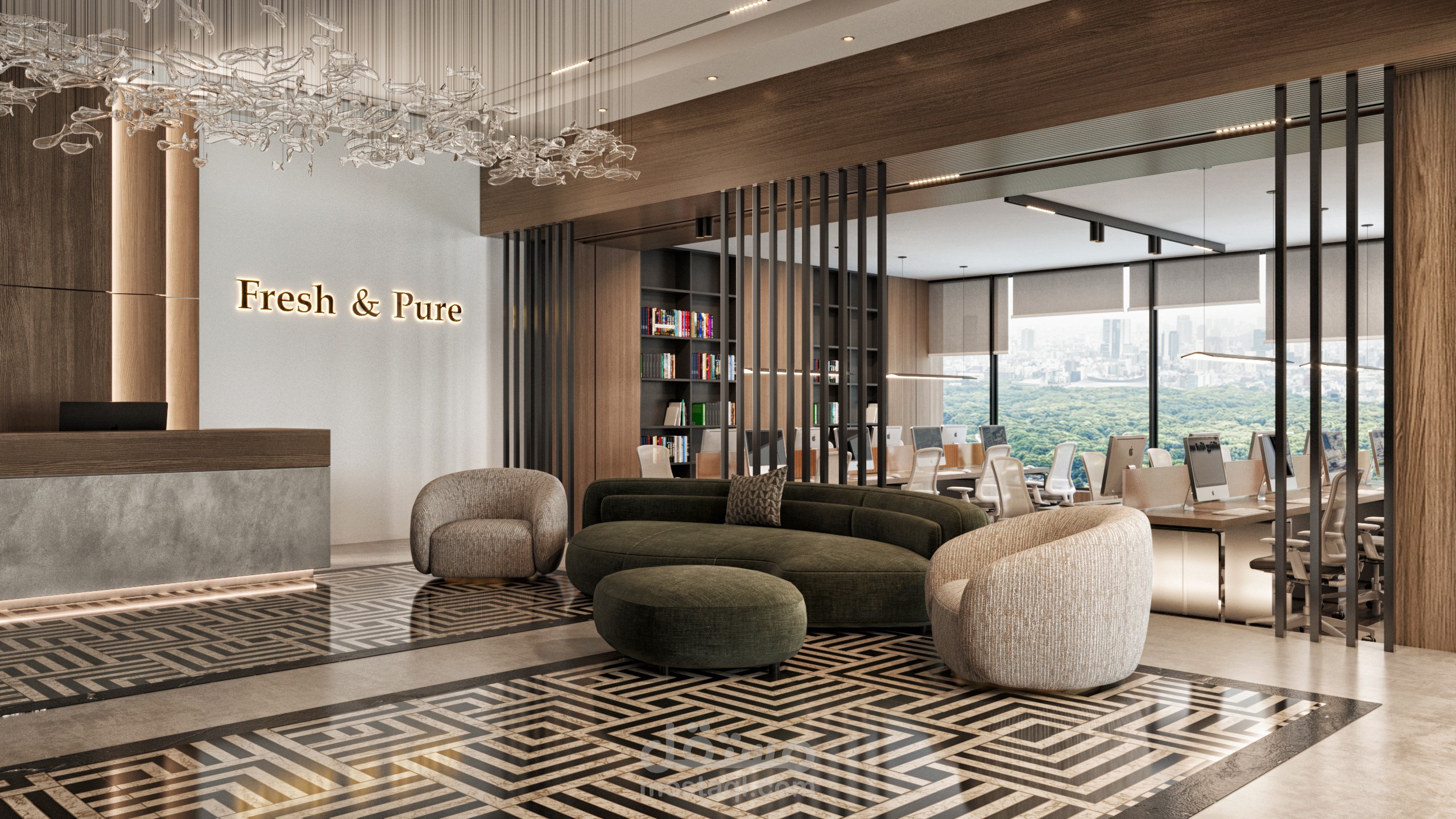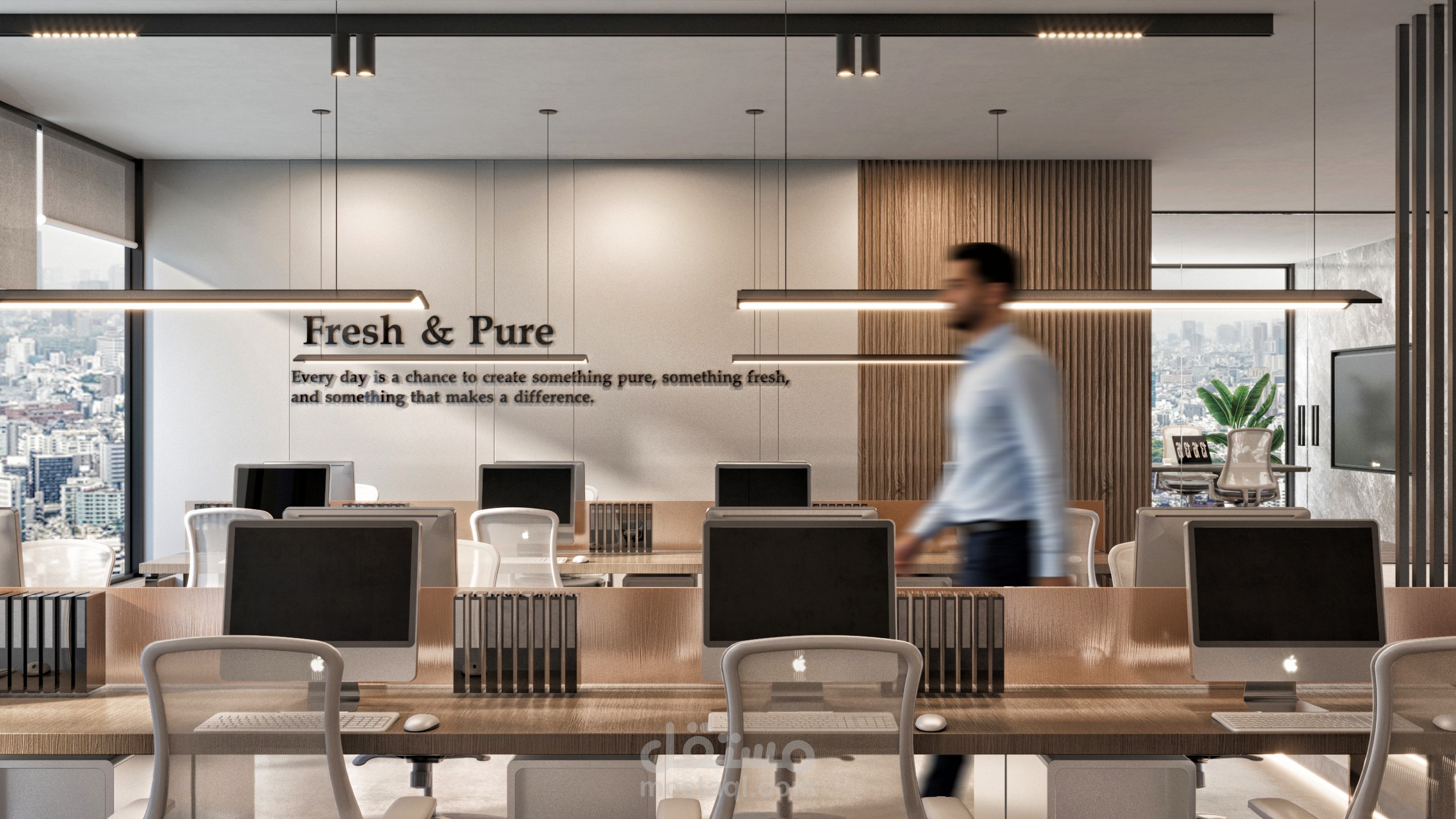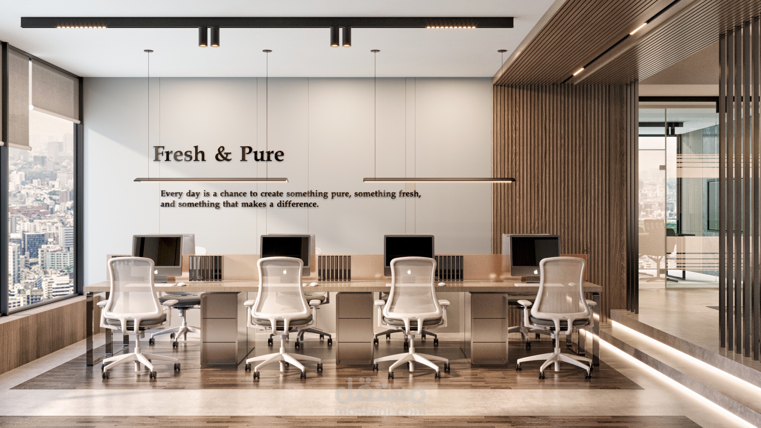 يعكس هذا المكتب الرئيسي هوية الشركة من خلال تصميم داخلي عصري، مساحات عمل منظمة، واستفادة مثلى من الإضاءة الطبيعية لإنشاء بيئة عمل مريحة ومحفزة.
