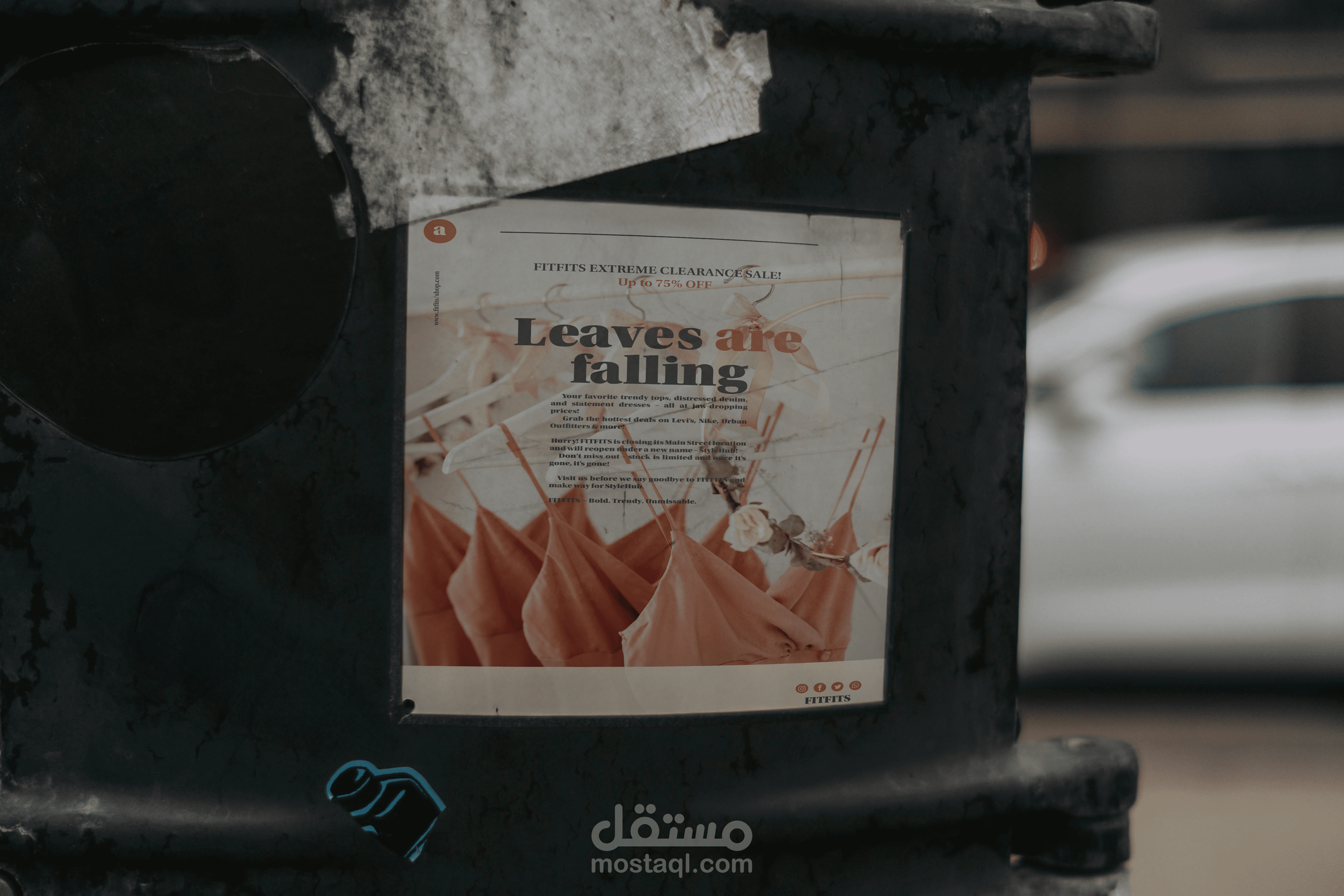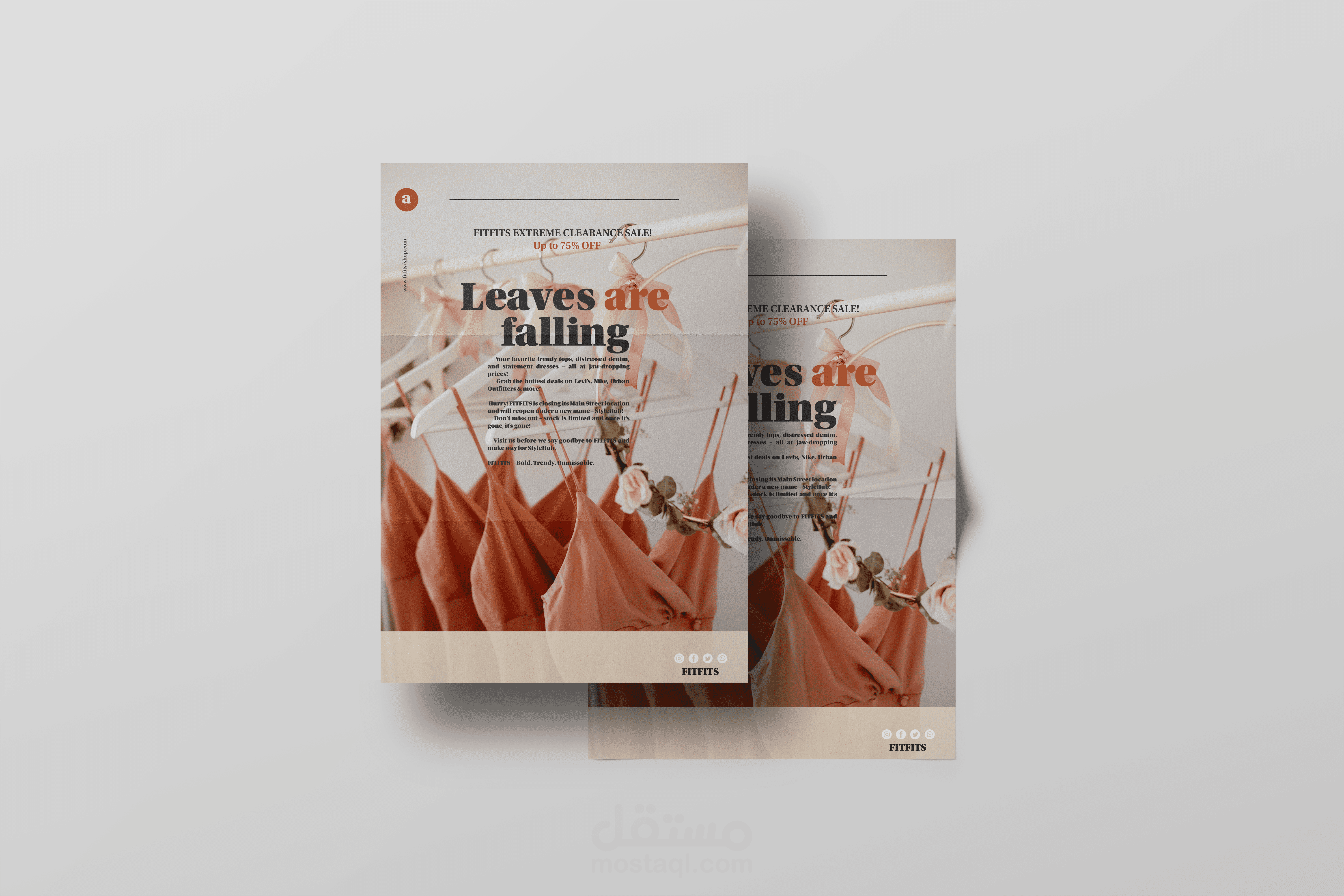 A seasonal promotional poster designed for FITFITS to highlight their extreme clearance sale before rebranding. The visual concept uses warm autumn tones, clean layout, and bold typography to create an elegant yet attention-grabbing design.