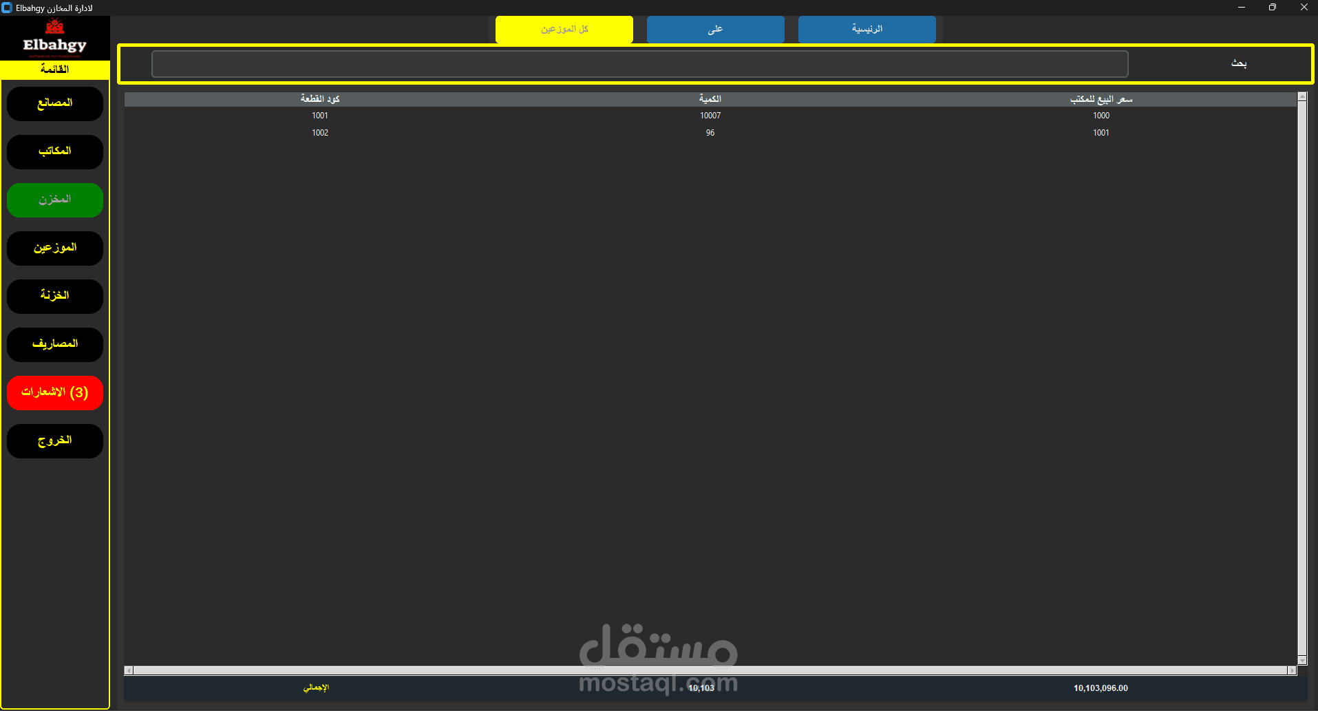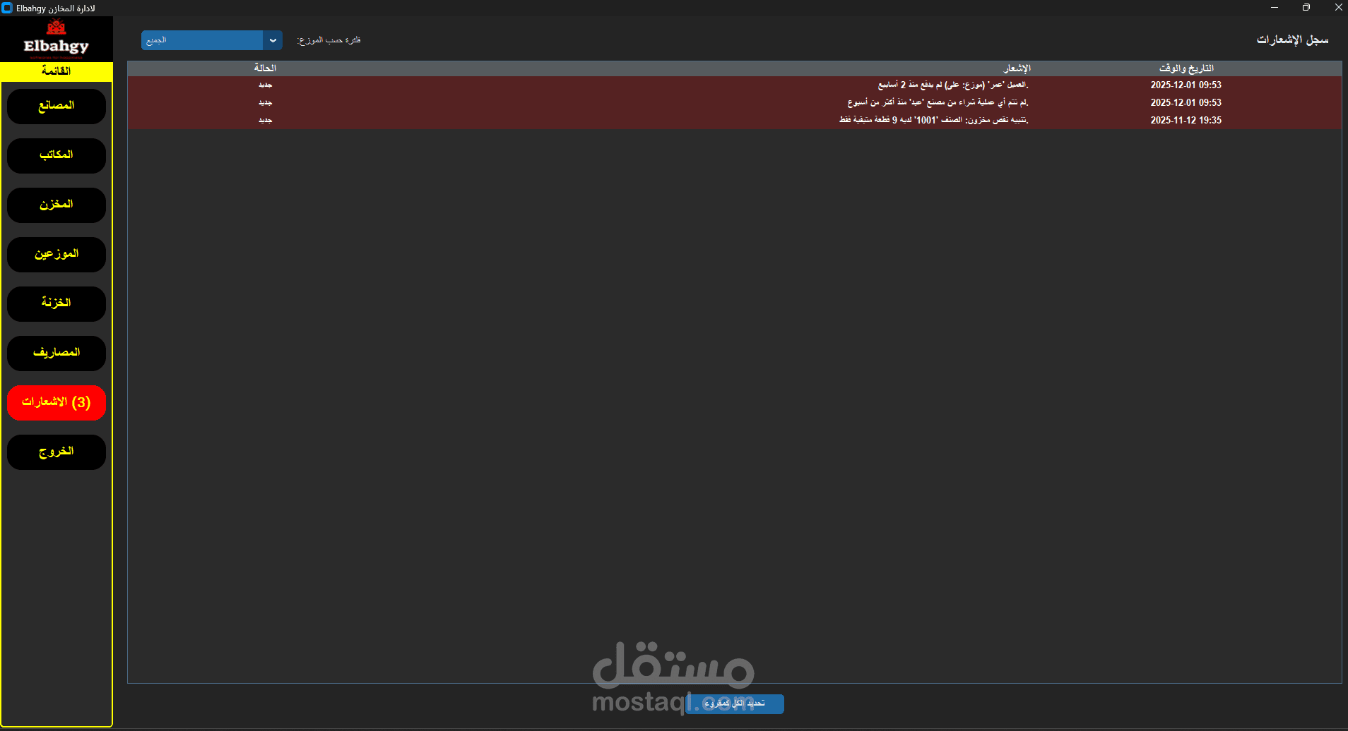 هذا تطبيق مكتبي شامل ومصمم خصيصًا لإدارة المخزون، المبيعات، والعمليات المالية بكفاءة عالية. يتميز بواجهة مستخدم رسومية (GUI) عصرية وجذابة بتصميم داكن (Dark Theme)، وقد تم بناؤه باستخدام مكتبة CustomTkinter المتقدمة، مع اتباع نموذج هيكلة MVC (Model-View-Controller) لضمان سهولة التوسع والصيانة.