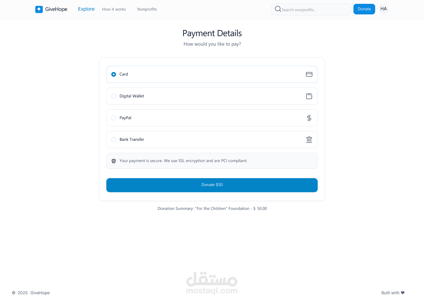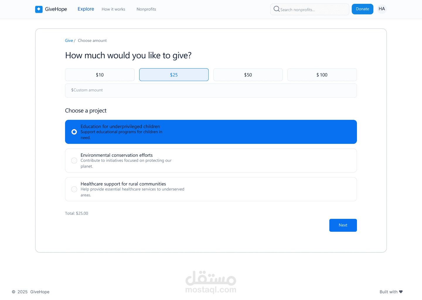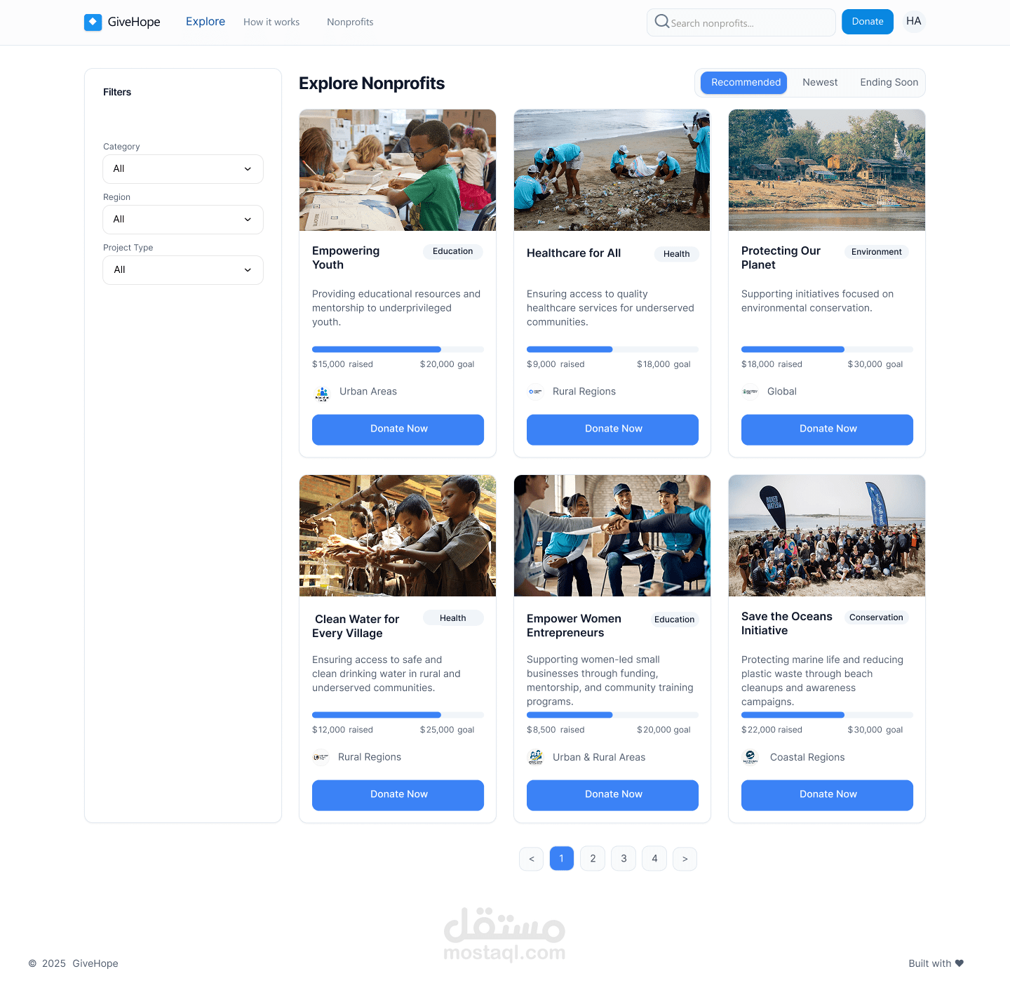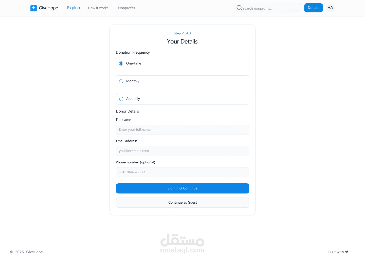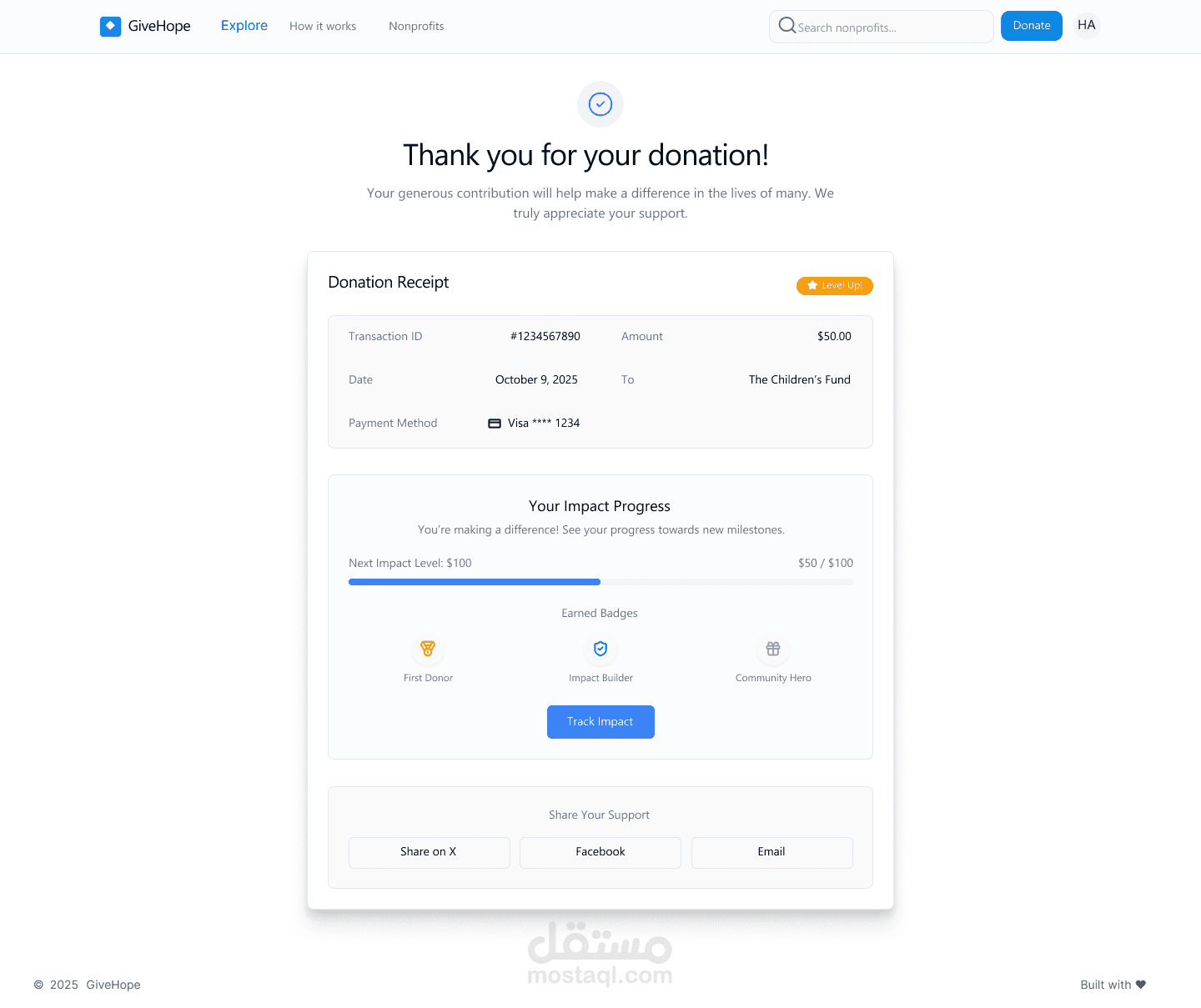 GiveHope هو تصميم واجهة مستخدم لتطبيق خيري يهدف إلى ربط المتبرعين بالمنظمات غير الربحية بطريقة بسيطة وفعّالة. يتيح الموقع للمستخدمين استكشاف الحملات الإنسانية الأكثر إلحاحًا، ودعم المؤسسات التي تصنع تأثيرًا حقيقيًا في المجتمع. ركّزت في التصميم على إنشاء واجهة واضحة وسهلة التصفح، مع إبراز الرسالة الإنسانية للتطبيق من خلال صور واقعية وألوان هادئة تعزز الثقة. تم تطوير هيكل الصفحة بحيث يوجه المستخدم نحو اتخاذ إجراء فوري مثل الاستكشاف أو التبرع، مع توفير تجربة استخدام سلسة ومتجاوبة على جميع الأجهزة. يمنح التصميم إحساسًا بالدفء والتعاون، ويعكس هوية منصة تهدف لتمكين التغيير من خلال العطاء.