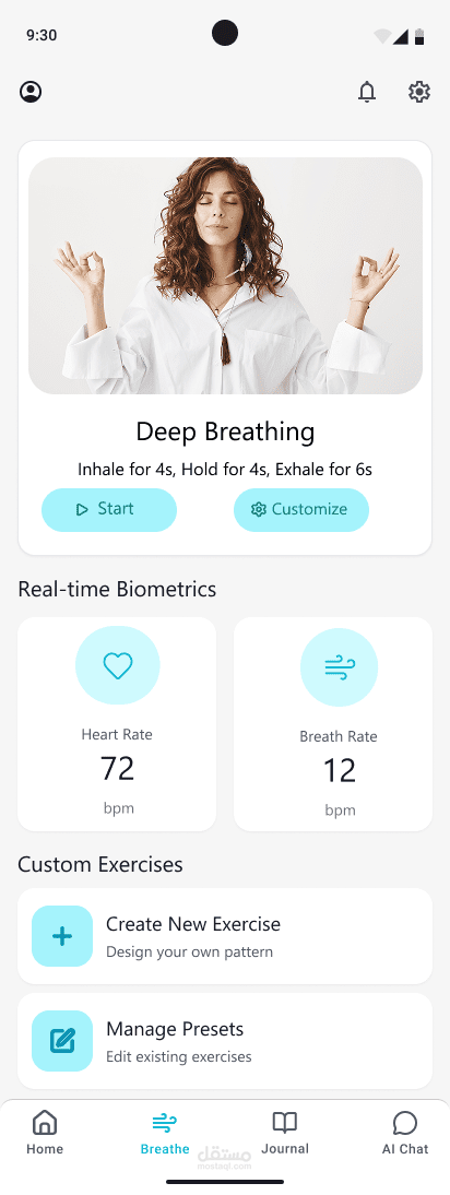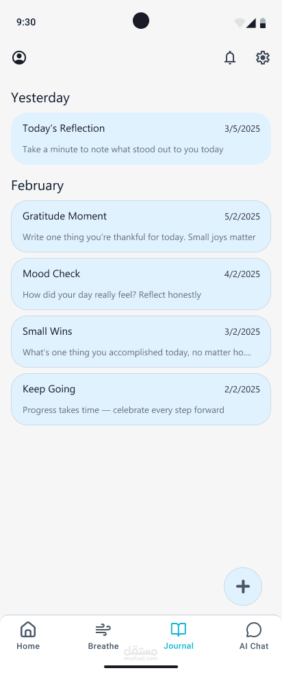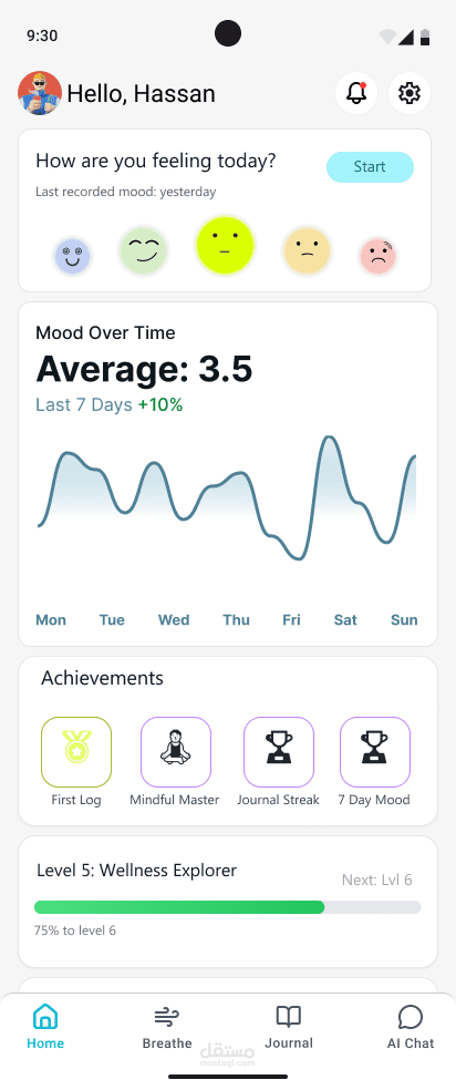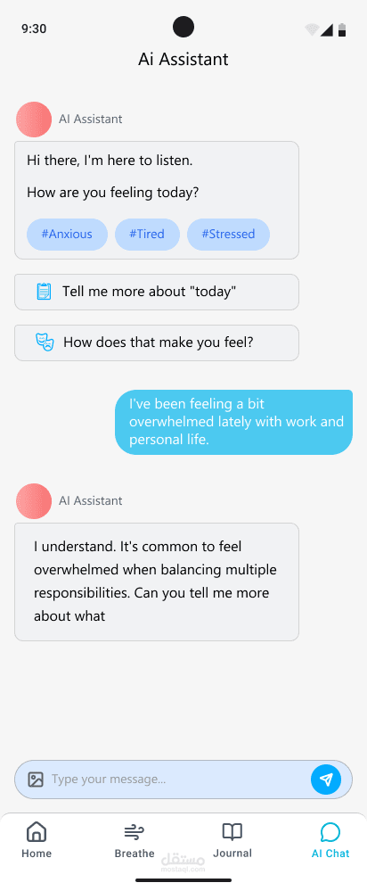 MindEase هو تطبيق مخصص لدعم الصحة النفسية بطريقة بسيطة ومريحة، من خلال تتبع الحالة المزاجية، وتدوين اليوميات، وممارسة تمارين التنفس الواعي، بالإضافة إلى محادثات موجهة بالذكاء الاصطناعي تساعد المستخدم على فهم مشاعره بشكل أعمق.