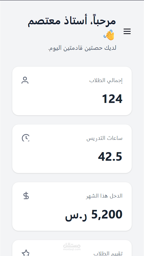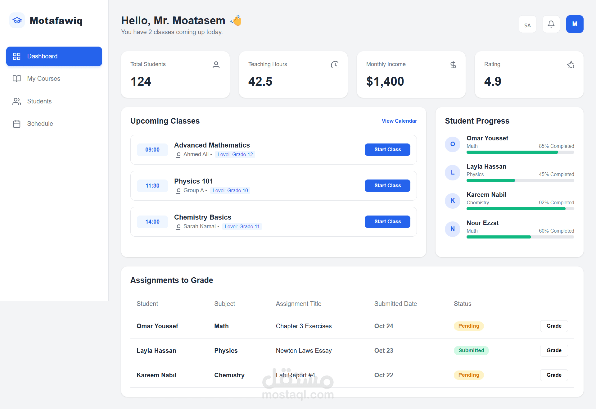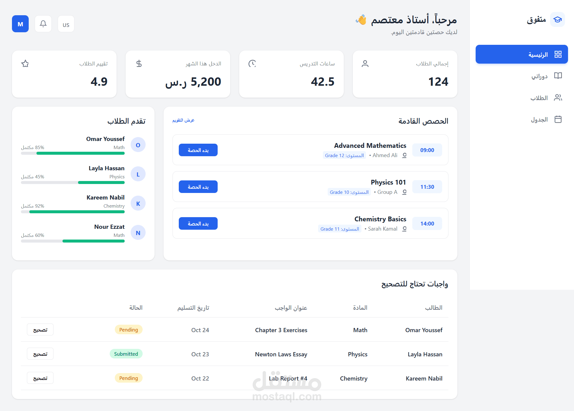 لوحة القيادة (Dashboard): عرض حيّ للإحصائيات الحيوية (عدد الطلاب، الدخل الشهري، والمهام المعلقة).