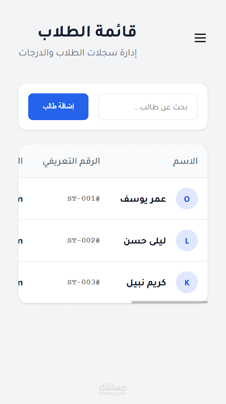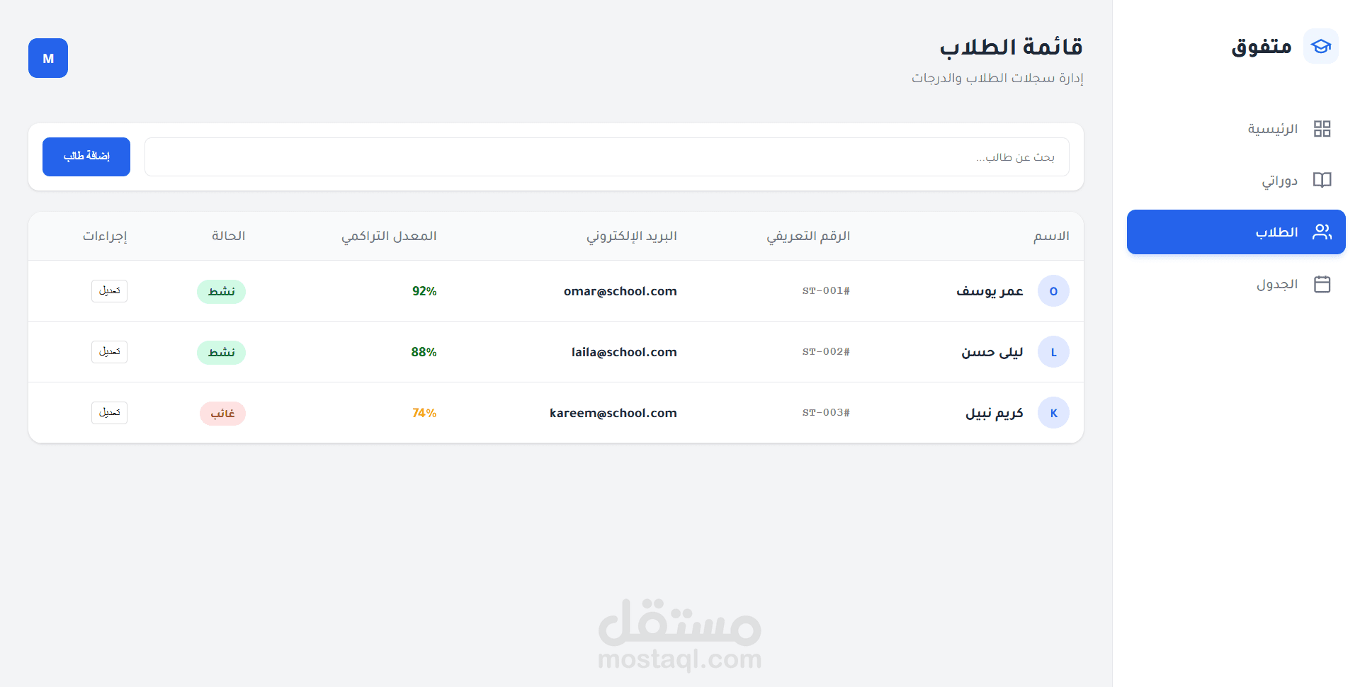 سجلات الطلاب: جداول بيانات متطورة تتيح البحث عن الطلاب ومتابعة حالات الغياب والدرجات بدقة.