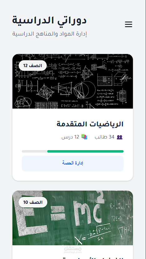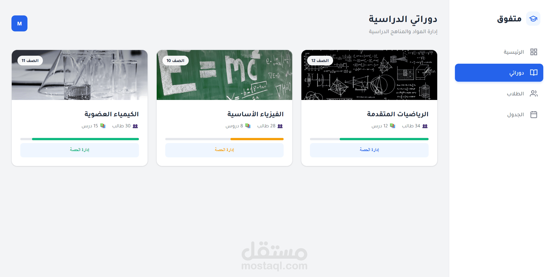 الدورات : استعراض المواد الدراسية عبر بطاقات تفاعلية توضح نسب الإنجاز وصور المواد.