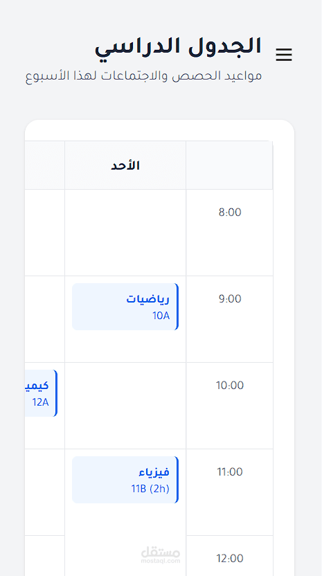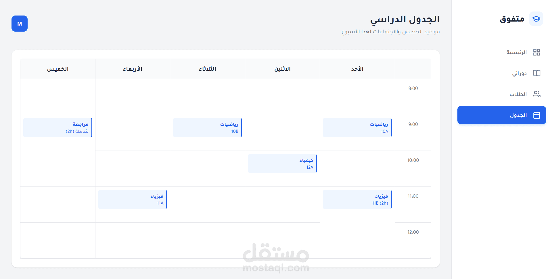 الجدول الزمني: تقويم أسبوعي مبني بنظام (CSS Grid) لتنظيم الحصص الدراسية بصرياً.