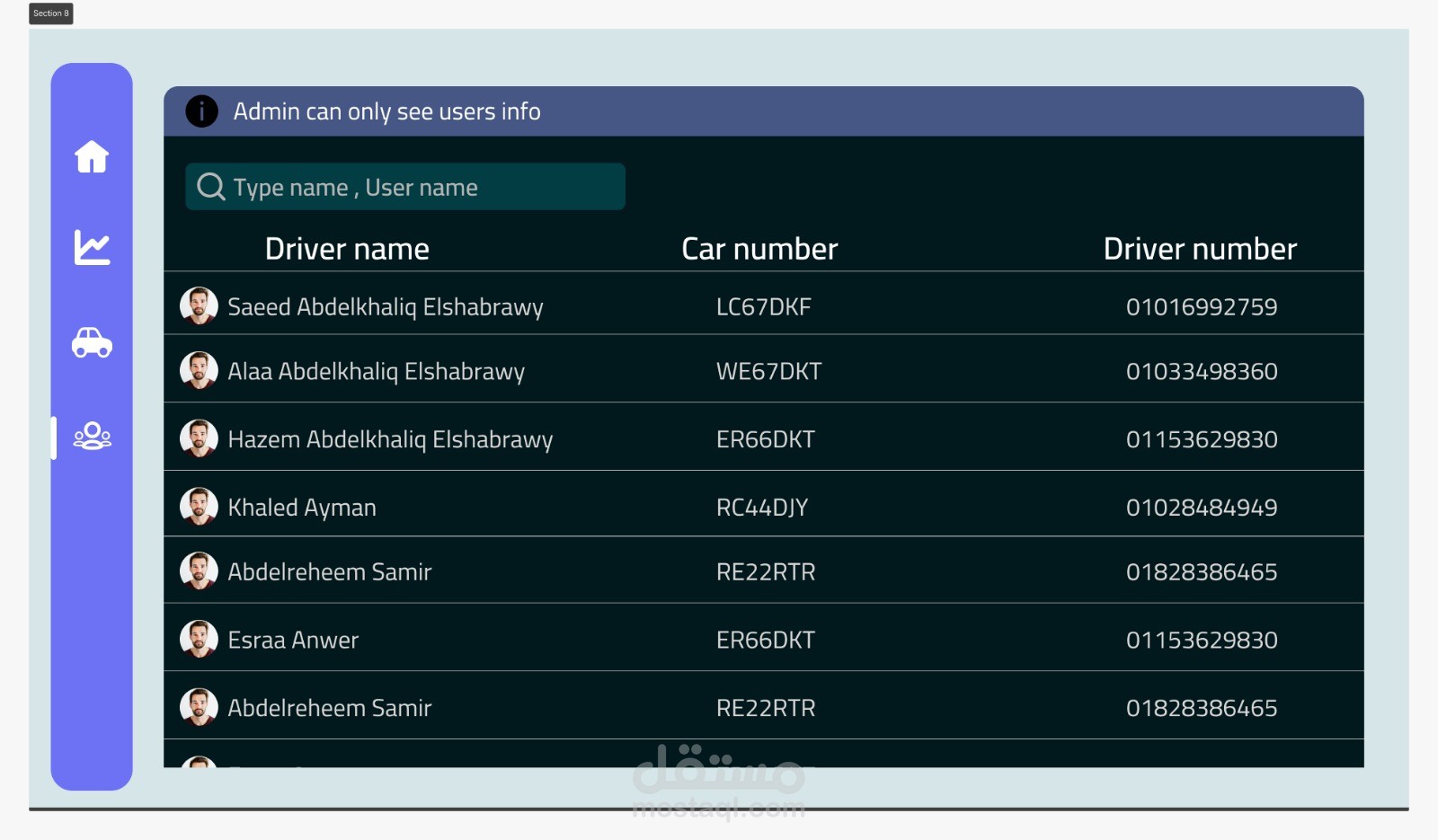 تم تصميم وتطوير لوحة تحكم احترافية موجهة للمديرين والمشرفين لسهولة إدارة النظام والتحكم الكامل في كافة العمليات. النظام يتمتع بواجهة استخدام بسيطة وسهلة، مبنية على مبادئ الـ UI/UX لضمان تجربة مستخدم سلسة ومنظمة.