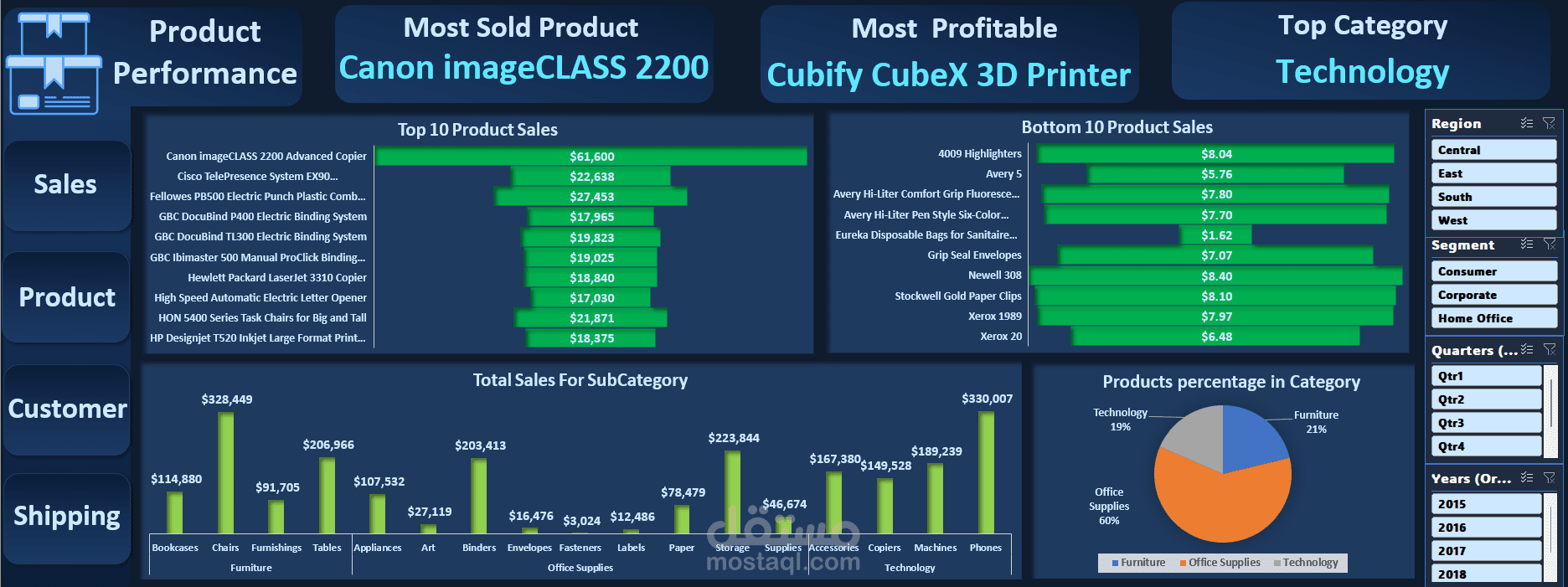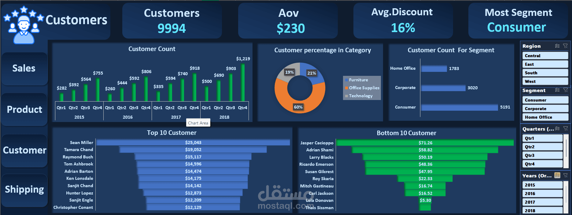 تتميز هذه الداشبورد بأنها تفاعلية بالكامل، حيث يمكن التنقل بين الأقسام بسهولة عبر الأزرار الجانبية، مع إمكانية تصفية البيانات حسب المنطقة، الشريحة، الربع السنوي، وسنة الطلب.
