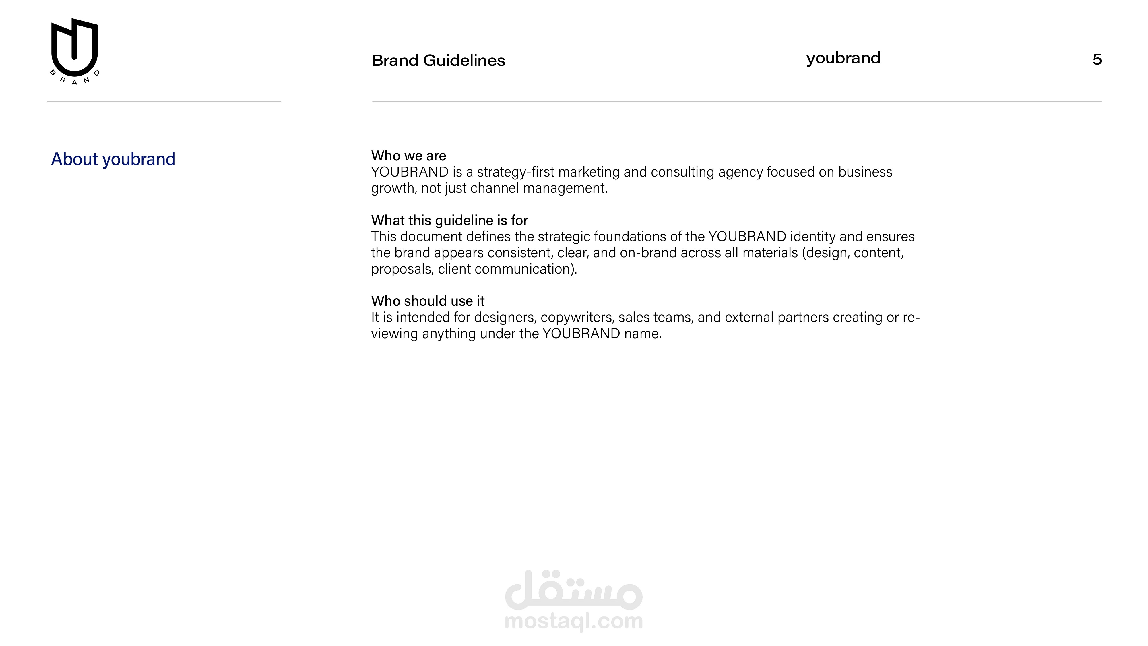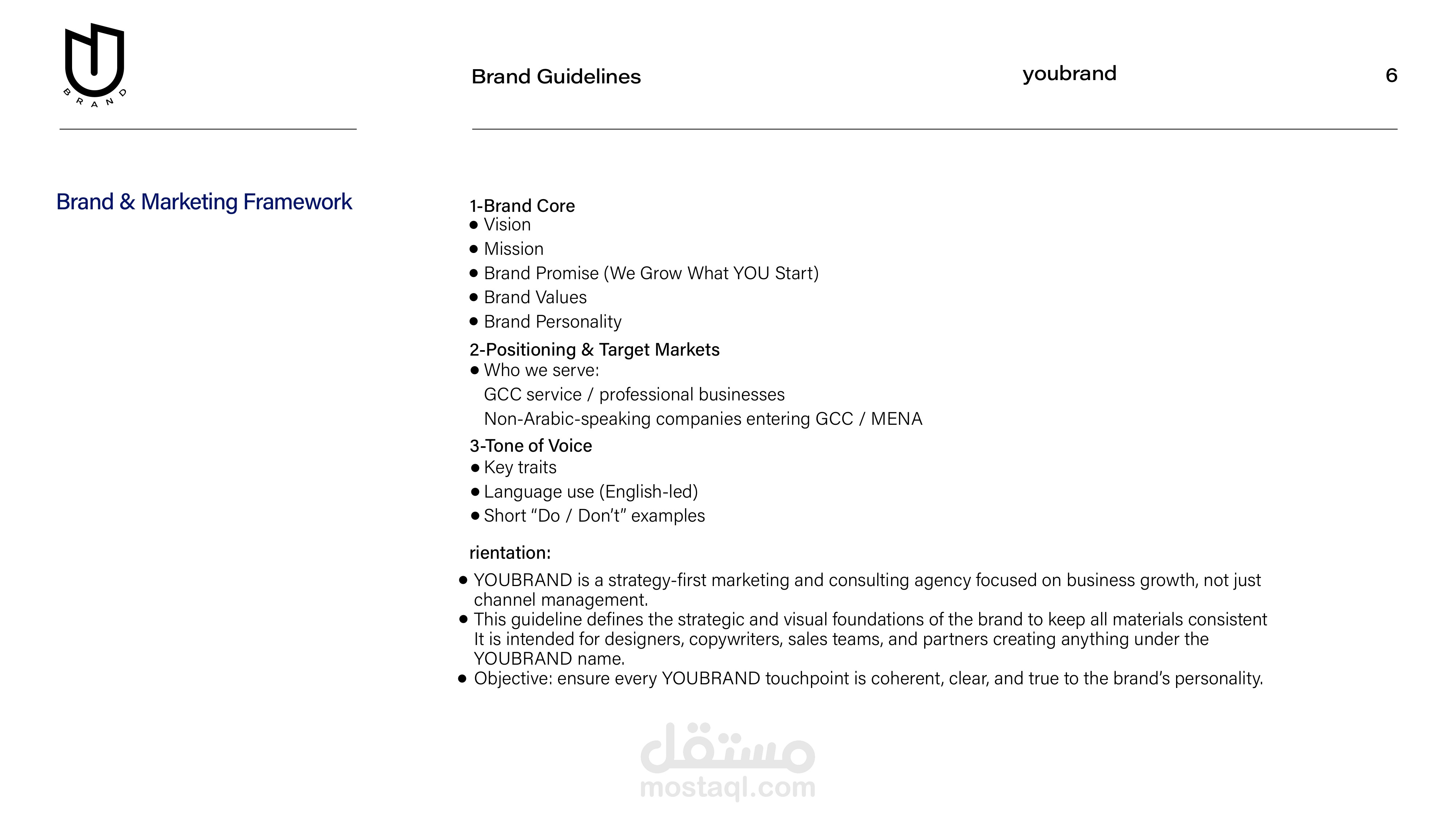 تم في هذا المشروع تطوير دليل تسويق وهوية علامة تجارية متكامل لشركة YOUBRAND، وكالة تسويق وعلاقات عامة تعمل بمنهج “Strategy-First Marketing & Growth Partner” وتستهدف السوق الخليجي والشركات العالمية الراغبة في دخول المنطقة.