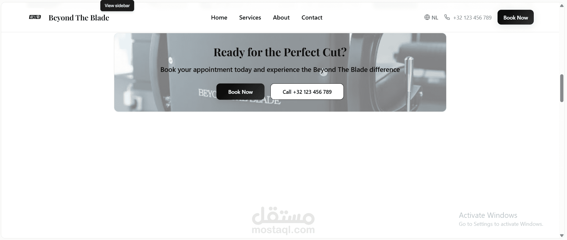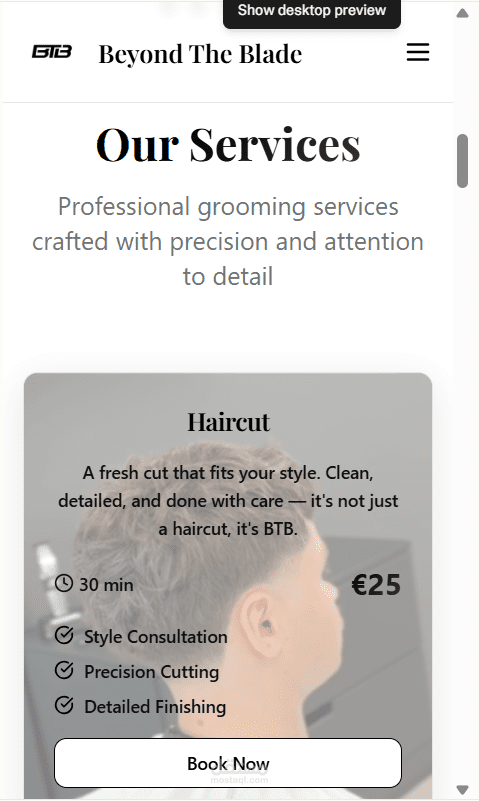 تمّ تصميم وتطوير موقع Beyond The Blade، وهو صالون حلاقة فاخر يقع في مدينة ميخلن – بلجيكا. يعتمد الموقع على أسلوب بصري أنيق يعكس هوية العلامة التجارية، ويقدّم تجربة رقمية سلسة تركز على الاحتراف، الجودة، والراحة أثناء تصفّح خدمات الصالون.