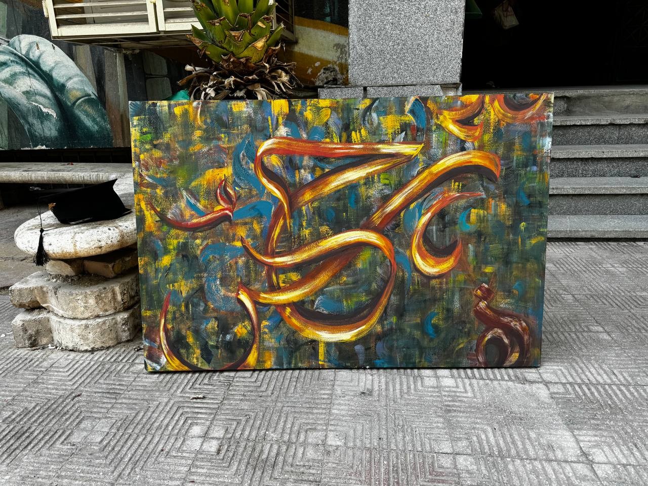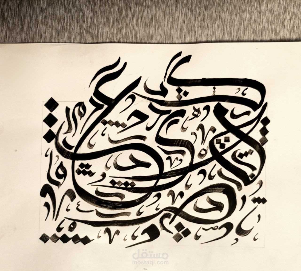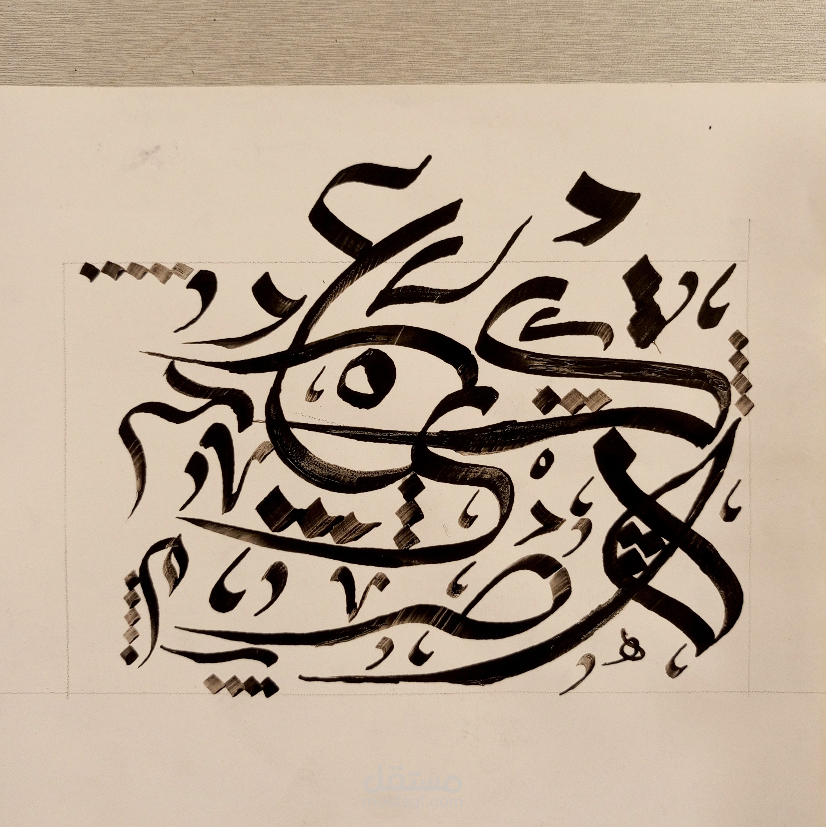 اللوحة تتميز بتوازن بين الفراغ والتعبئة، مما يمنحها أناقة ووضوحًا يجعلها جذابة لأي مكان تُعرض فيه، سواء كان مساحة داخلية عصرية أو معرض فني تقليدي. التفاصيل الدقيقة والاهتمام بالتناغم بين الخط والزخرفة يجعل العمل الفني ينبض بالحياة، ويعكس إحساسًا عميقًا بالهوية والثقافة العربية بأسلوب معاصر وراقي.