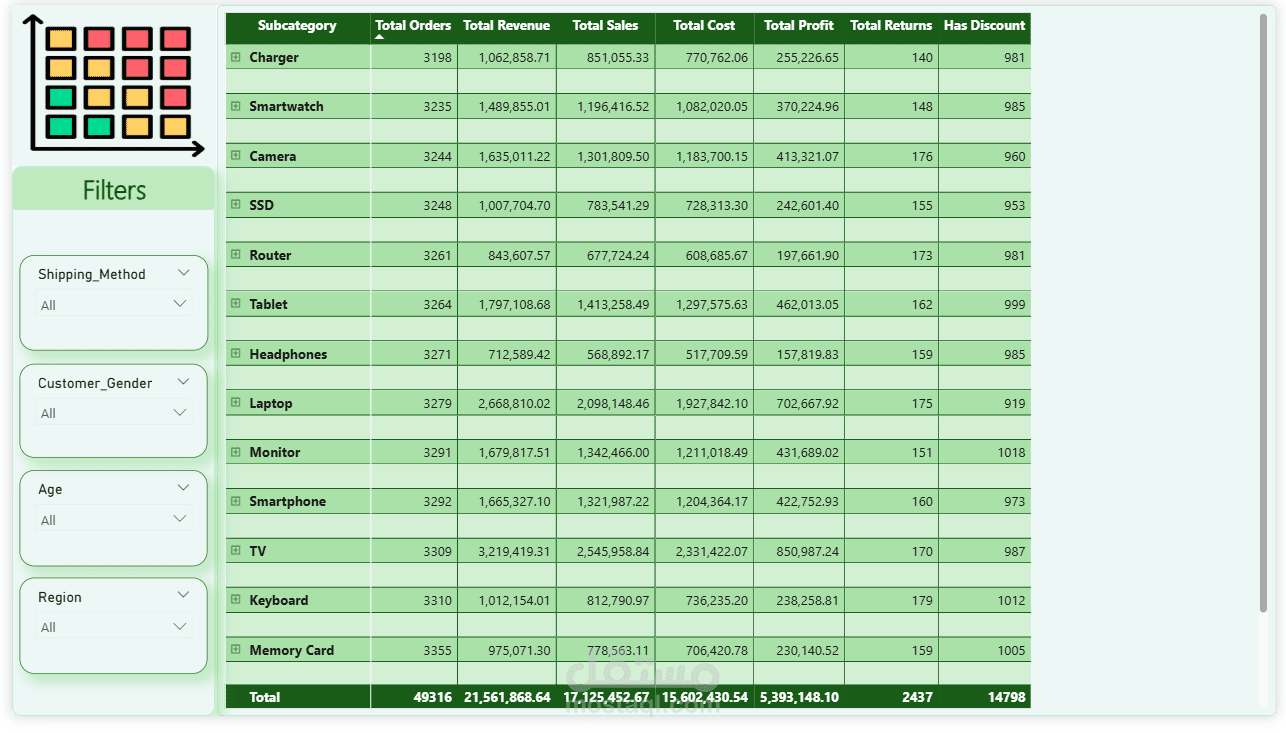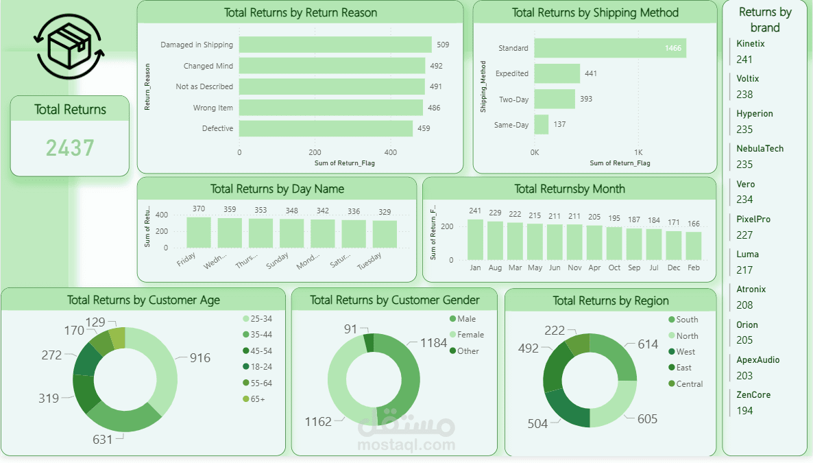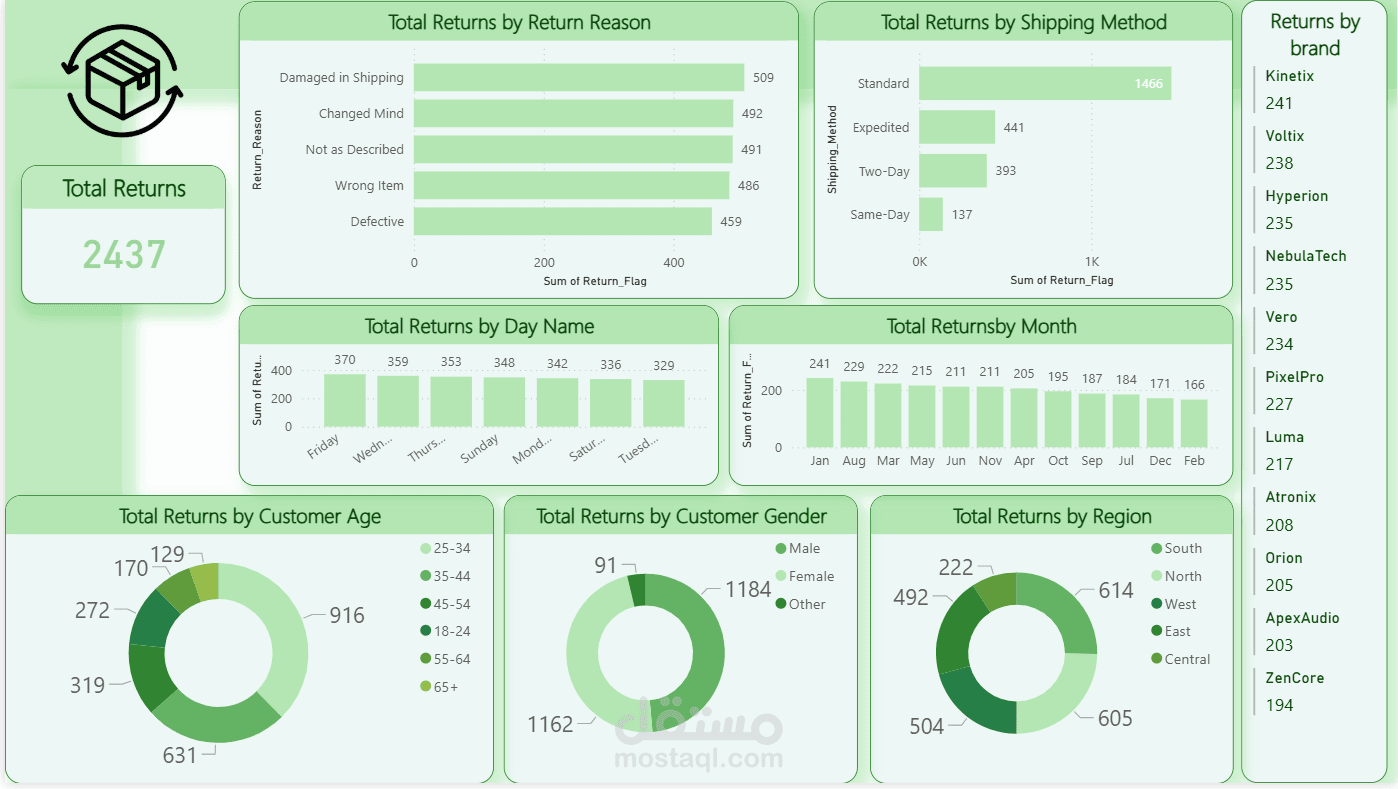 In this project, I analyzed sales and return data for an electronics store using Power BI with the goal of extracting deep insights that support data-driven decision-making. The analysis included a mix of order, customer, product, brand, shipping, and return data, presented through interactive dashboards.