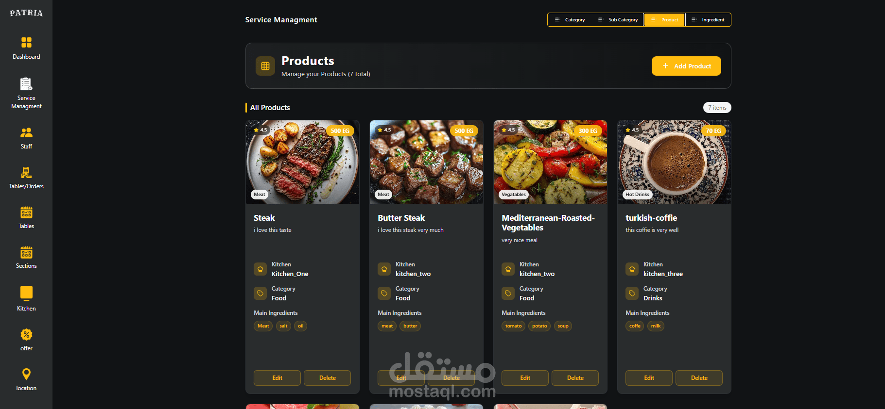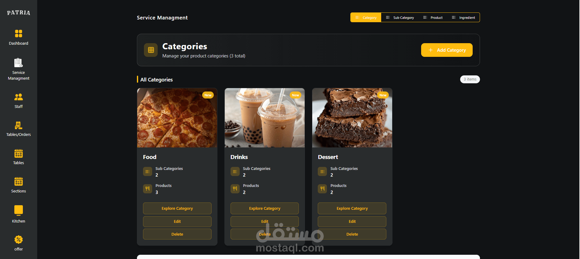 إضافة وتعديل وحذف الأصناف، مع تنظيمها في أقسام (وجبات رئيسية، ساندويتشات، مشروبات…)، لتظهر بشكل مرتب وواضح للزبون.