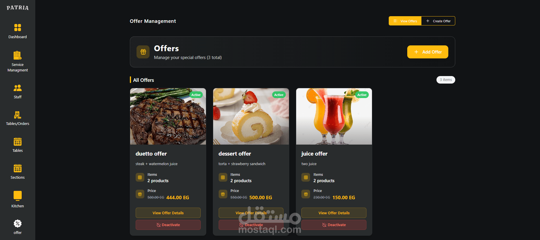 من خلال الـ Dashboard يمكن إنشاء عروض خاصة (خصومات، وجبات مدمجة، عروض مؤقتة) مع تحديد تاريخ البداية والنهاية، وتظهر العروض تلقائيًا داخل تطبيق/واجهة الزبون.