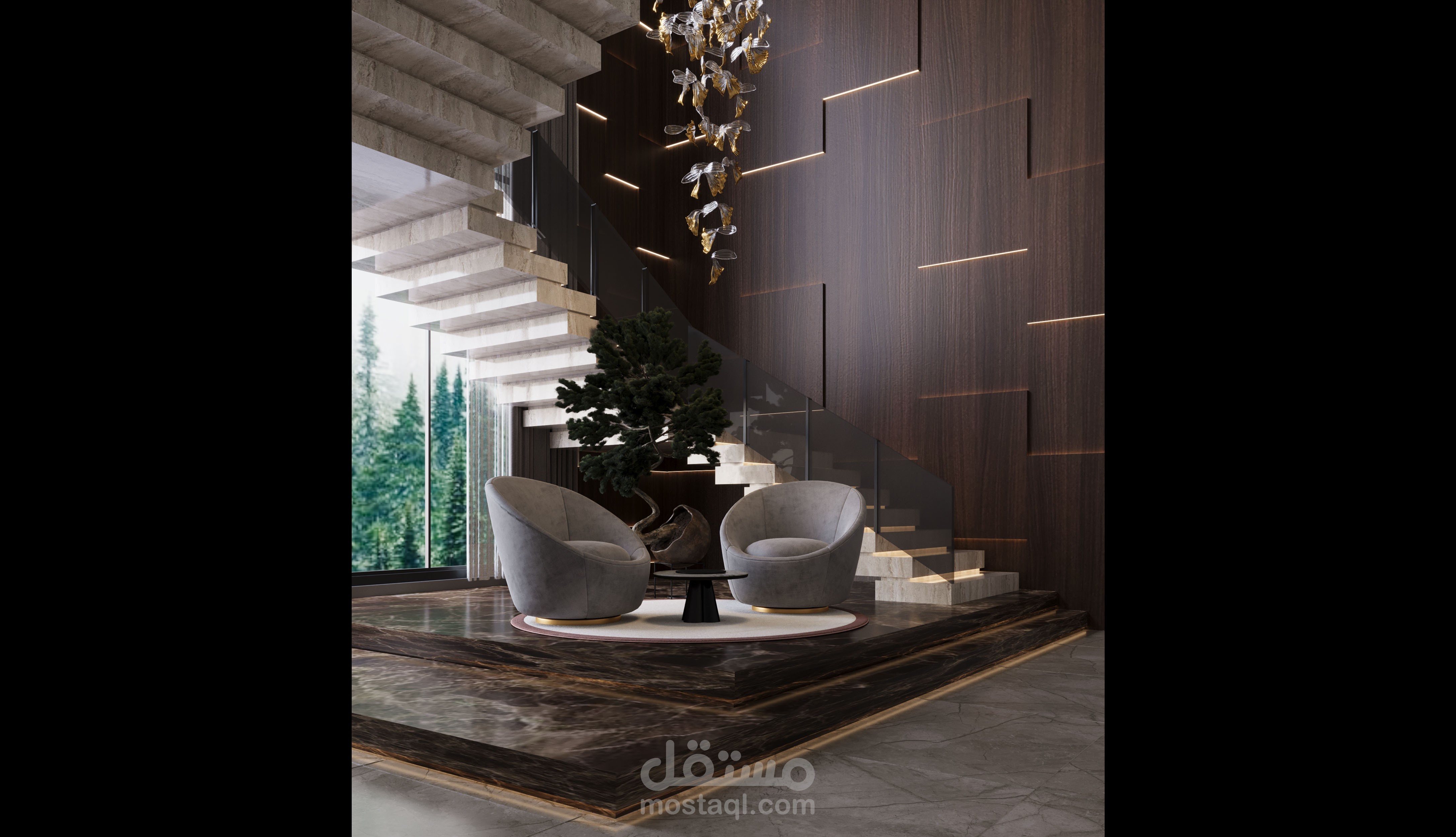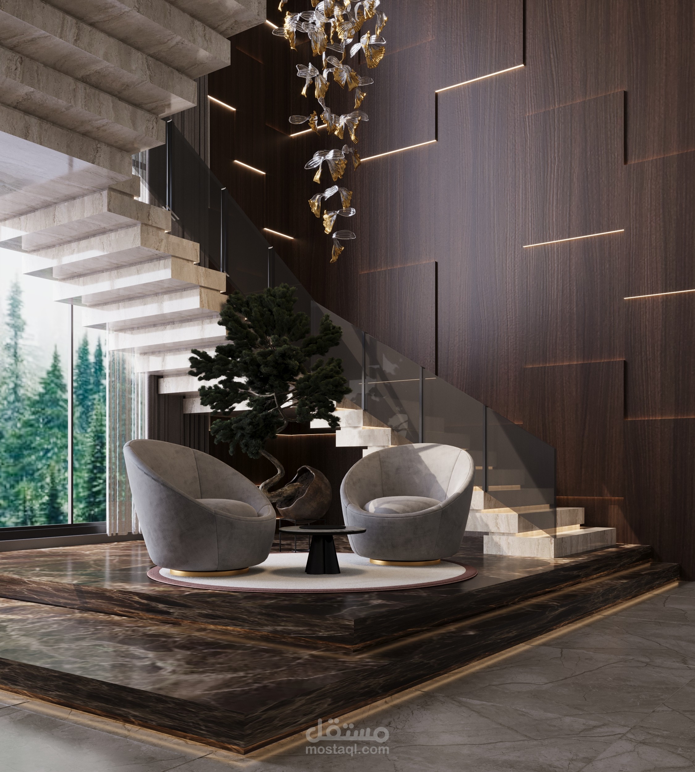 تم تصميم هذا الدرج على النظام الحديث حيث تم رفع اول درجتين على كامل مساحة الدرج واستخلال المساحة في ركن جلوس لطيف مع بعض العناصر الزينة تم اضافة اضاءة مخفية تحت الدرجات التي تعطيها الفخامة واستخدام ترية طولية تعطي التصميم لمسة من الفخامة والجمال