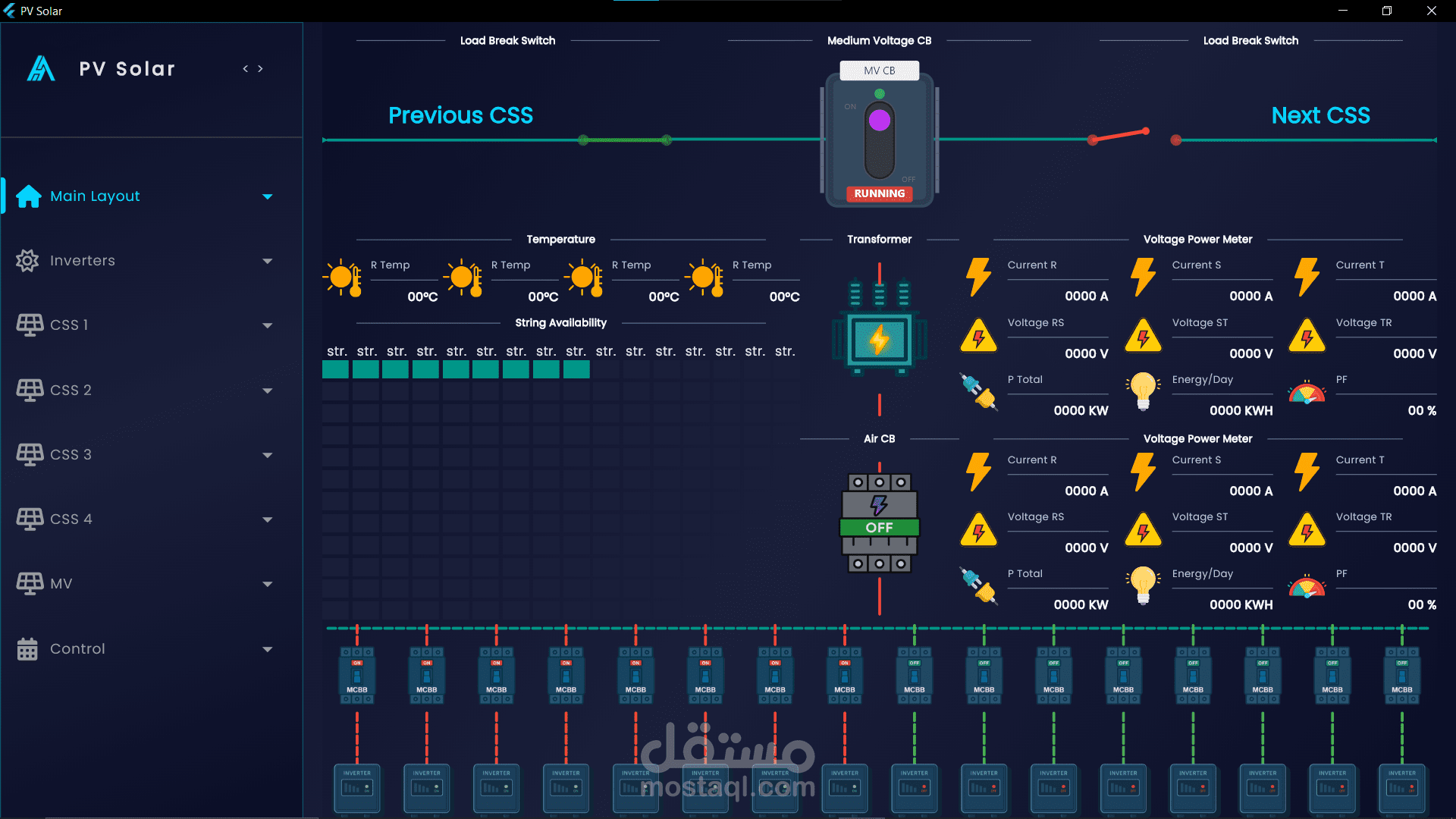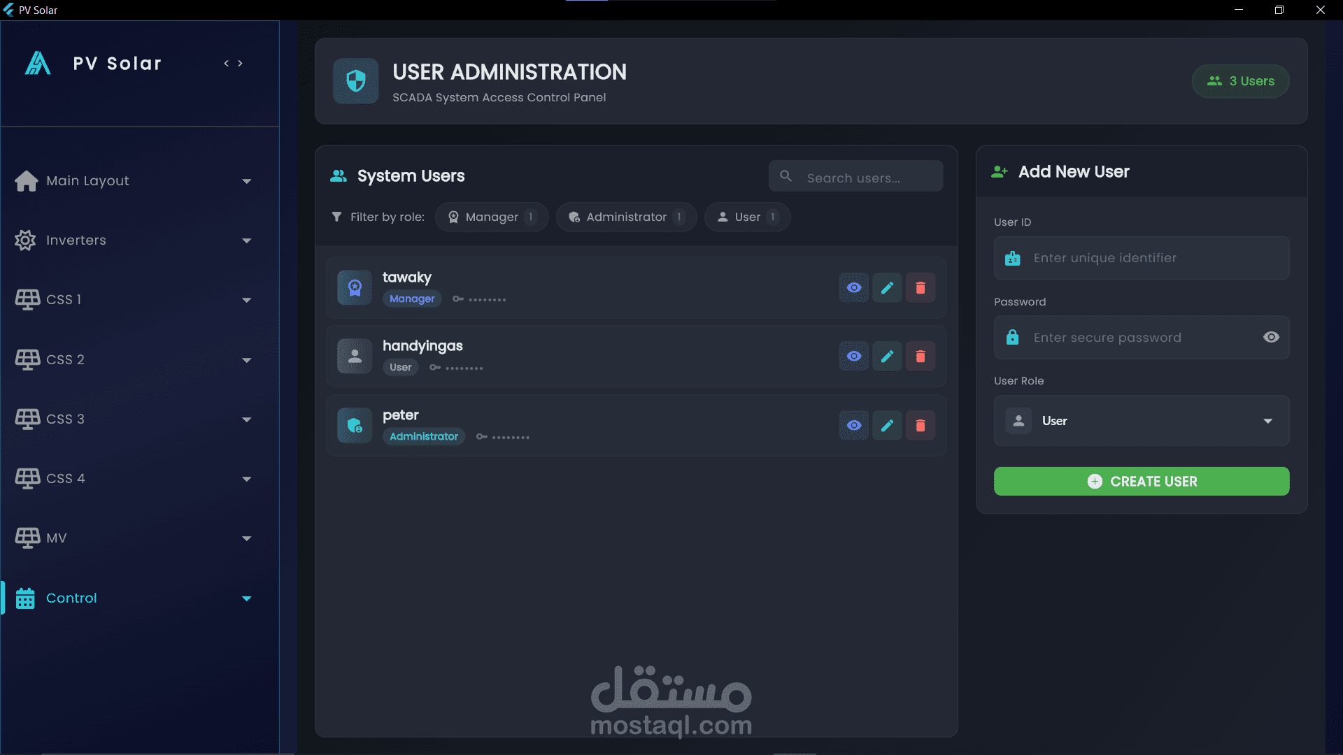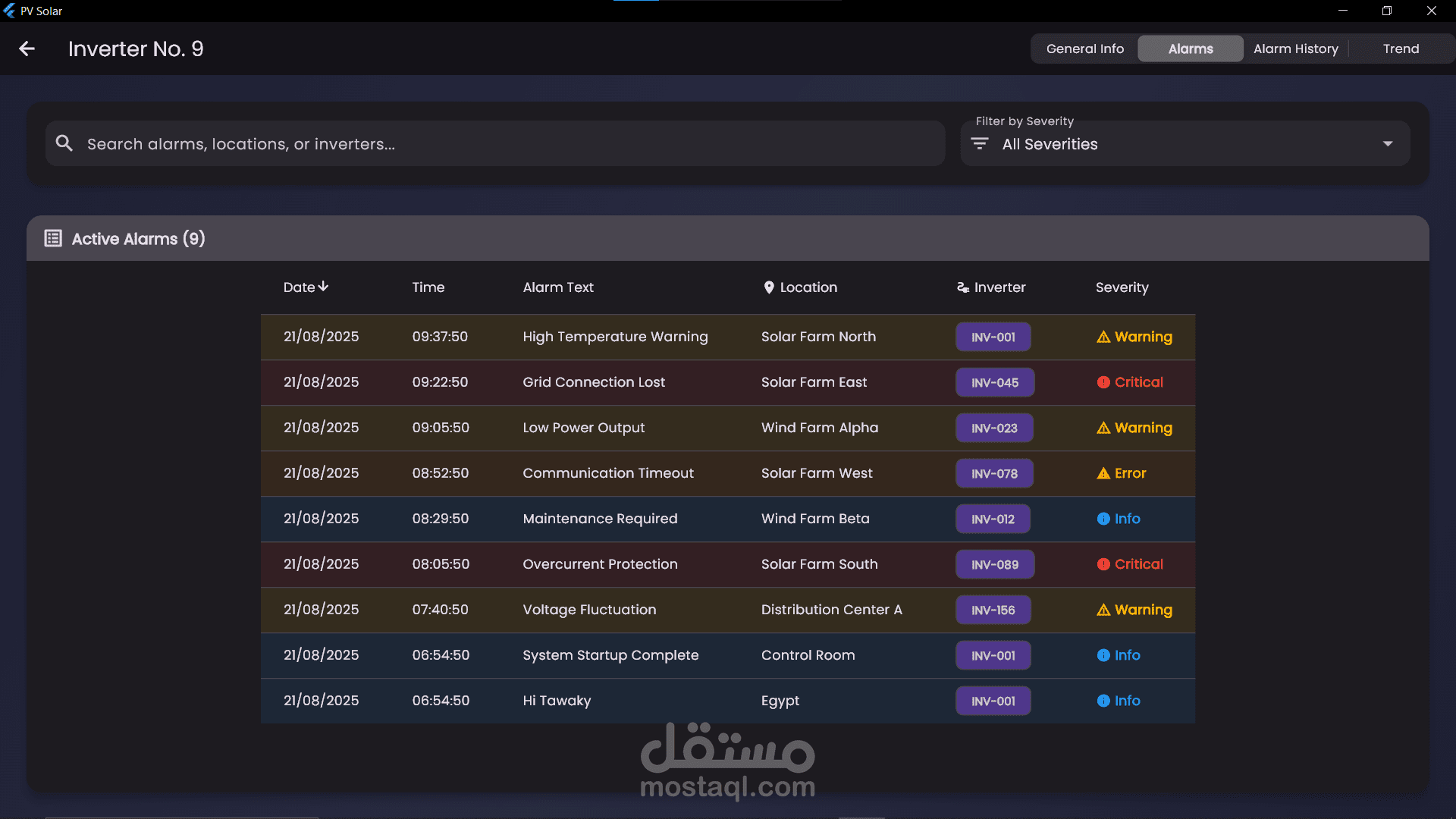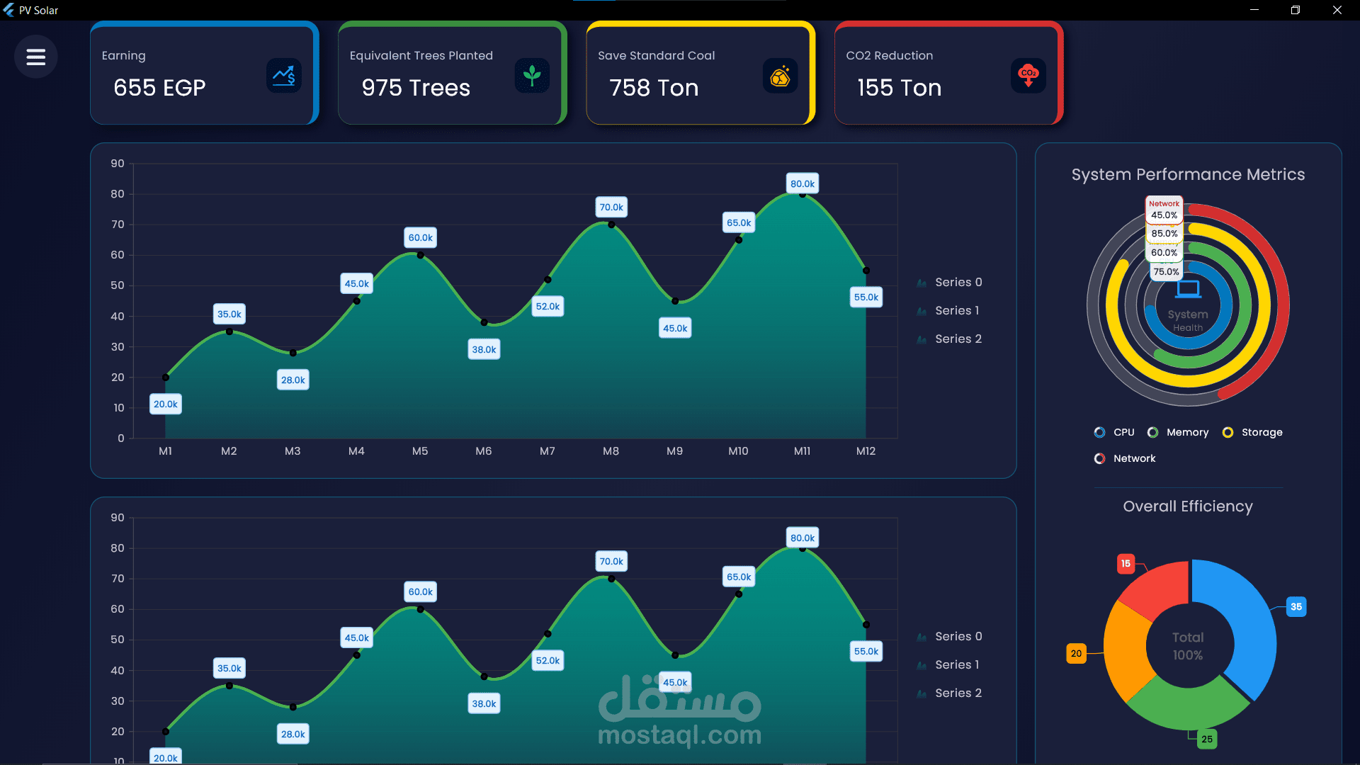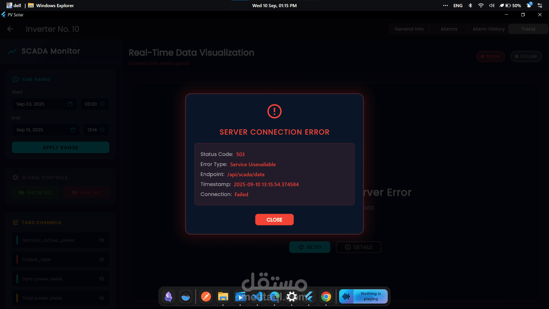 قمت بقيادة تطوير نظام متكامل لمراقبة وتشغيل محطات الطاقة الشمسية في الوقت الحقيقي. الهدف من النظام كان توفير لوحة تحكم ذكية تسمح للمسؤولين بمتابعة أداء المحطة لحظة بلحظة، والتحكم في المعدات، ومعرفة أي أعطال أو تنبيهات فور حدوثها.