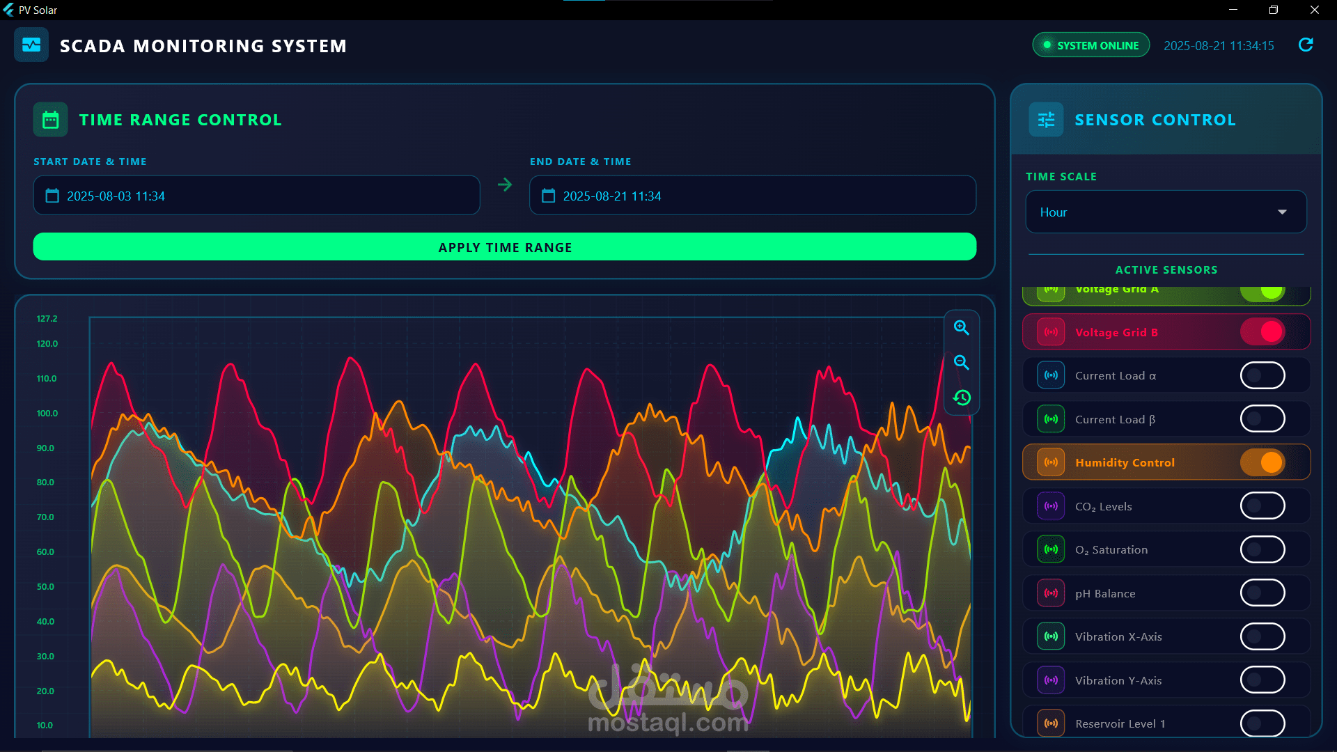 ولتحسين تجربة المستخدم، قمت بتطوير واجهة رسومية تفاعلية بالكامل باستخدام Flutter، تشمل رسوم بيانية لحظية وتاريخية، مع إمكانية عمل تكبير وتحريك واستعراض بيانات متعددة في نفس اللحظة، حتى مع وجود آلاف القراءات في الثانية.