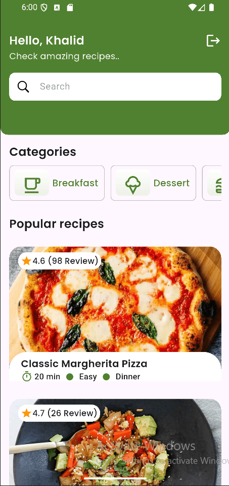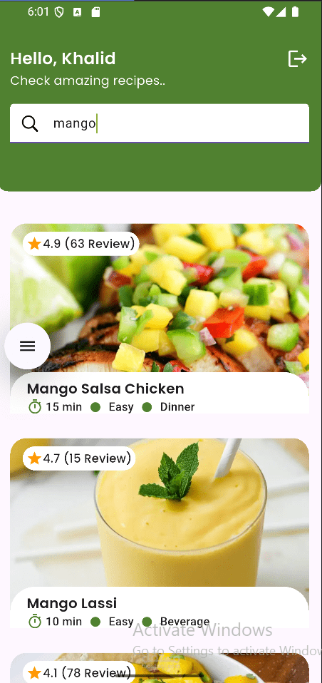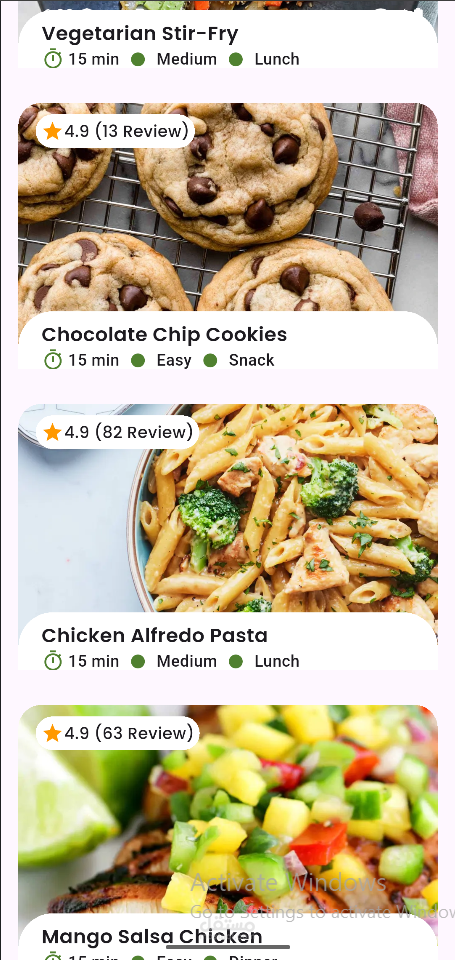 • Includes a search bar to find recipes dynamically.