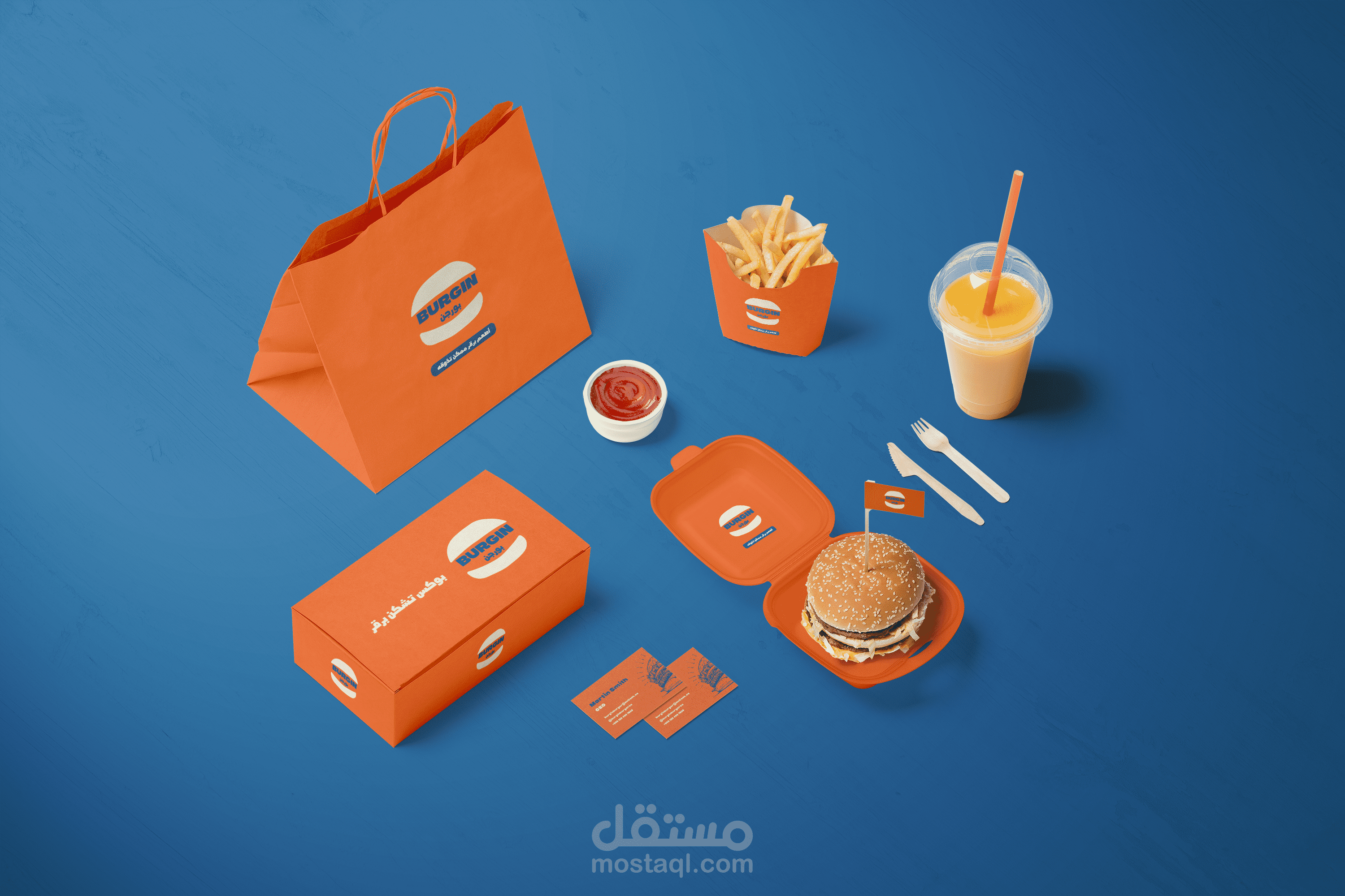 هوية بصرية لمطعم برغر إفتراضي تضم الشعار الخطوط الألوان تصميم الباكجنغ والعبوات وتصميم بعض بوستات السوشيال ميديا