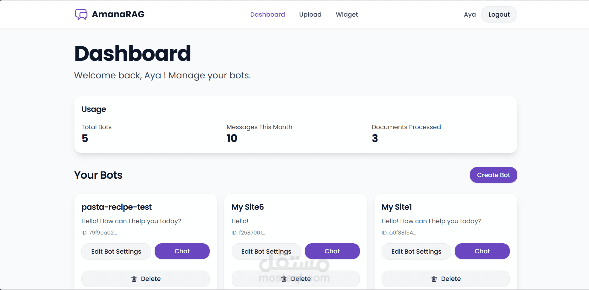 قمت بتطوير منصة متكاملة لإنشاء وإدارة البوتات (Chatbots Platform) باستخدام Next.js / React / Prisma / PostgreSQL، بحيث تتيح للمستخدمين تجربة الخدمة بسهولة وتكاملها مع مواقع خارجية عبر سكربت جاهز. المنصة تشمل واجهة تفاعلية لإنشاء البوت بخطوات بسيطة، نظام إدارة كامل للبوتات، دعم حفظ وإدارة البوتات بعد التسجيل، بالإضافة إلى إعدادات CORS لتمكين دمج البوتات في أي موقع خارجي. كما تم بناء REST API متكامل مع معالجة أخطاء واضحة، وتحديث قاعدة البيانات لدعم البوتات الدائمة المرتبطة بالمستخدمين. المشروع يحقق تجربة سلسة واحترافية، ويزيد من معدل التفاعل والتحويل من الزوار إلى مستخدمين فعليين، مع مرونة عالية في إدارة البوتات وتكاملها مع مختلف المواقع.
