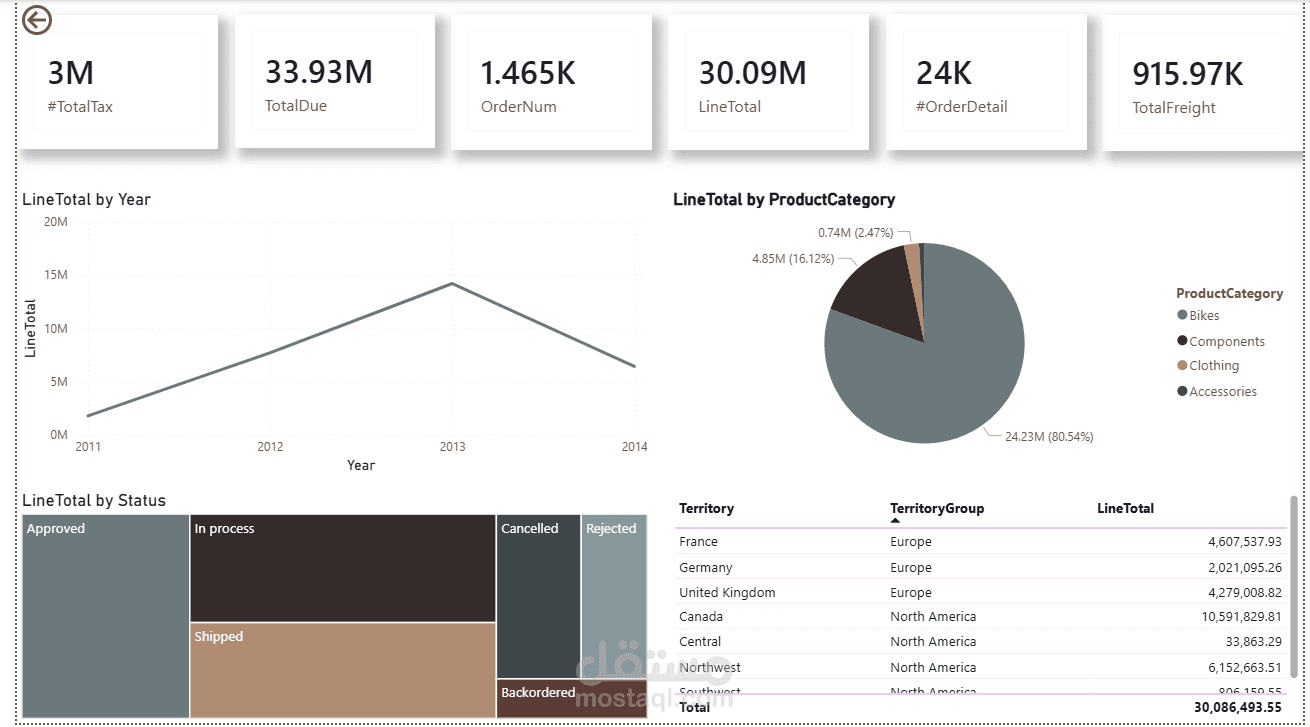 إنشاء لوحة معلومات مبيعات احترافية على Power BI. حل تفاعلي يعرض: تحليل الإيرادات، قوائم المنتجات الأكثر مبيعاً، تقييم الأداء الجغرافي، وتقديم مُلخصات إدارية لدعم النمو الاستراتيجي