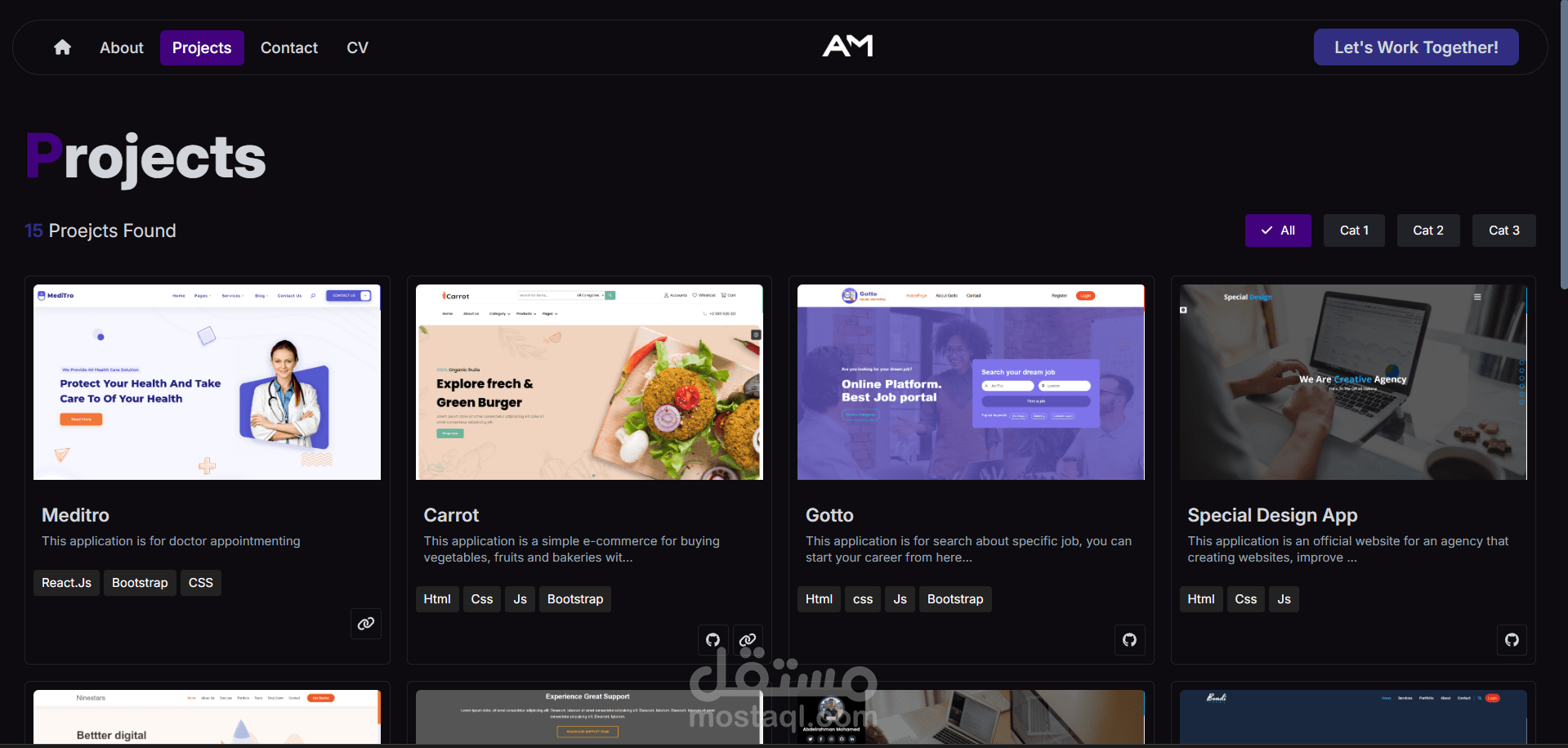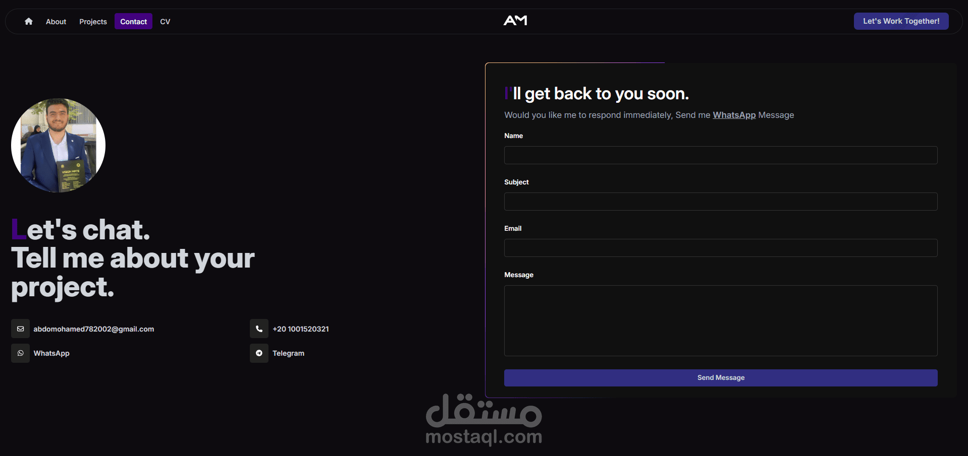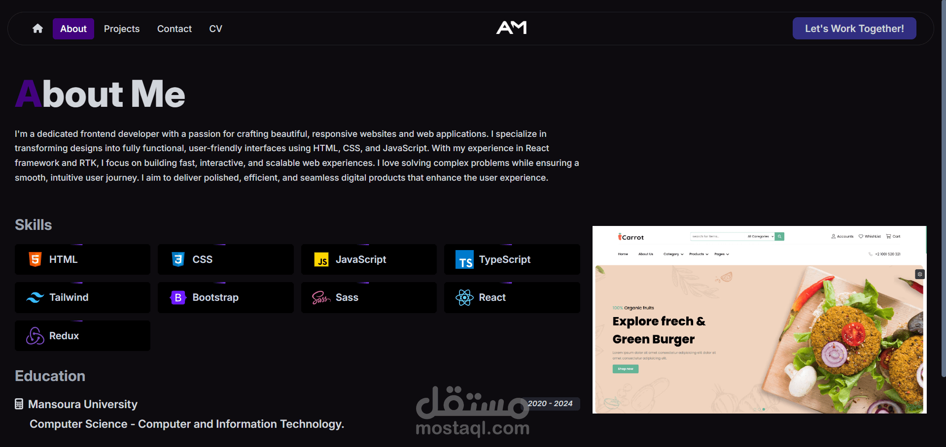 هذا موقع محفظة أعمال (بورتفوليو) شخصى . هدفه هو عرض مهاراتى وخبراتى ومشاريعى بطريقة احترافية للتسهيل على أصحاب العمل أو العملاء المحتملين .