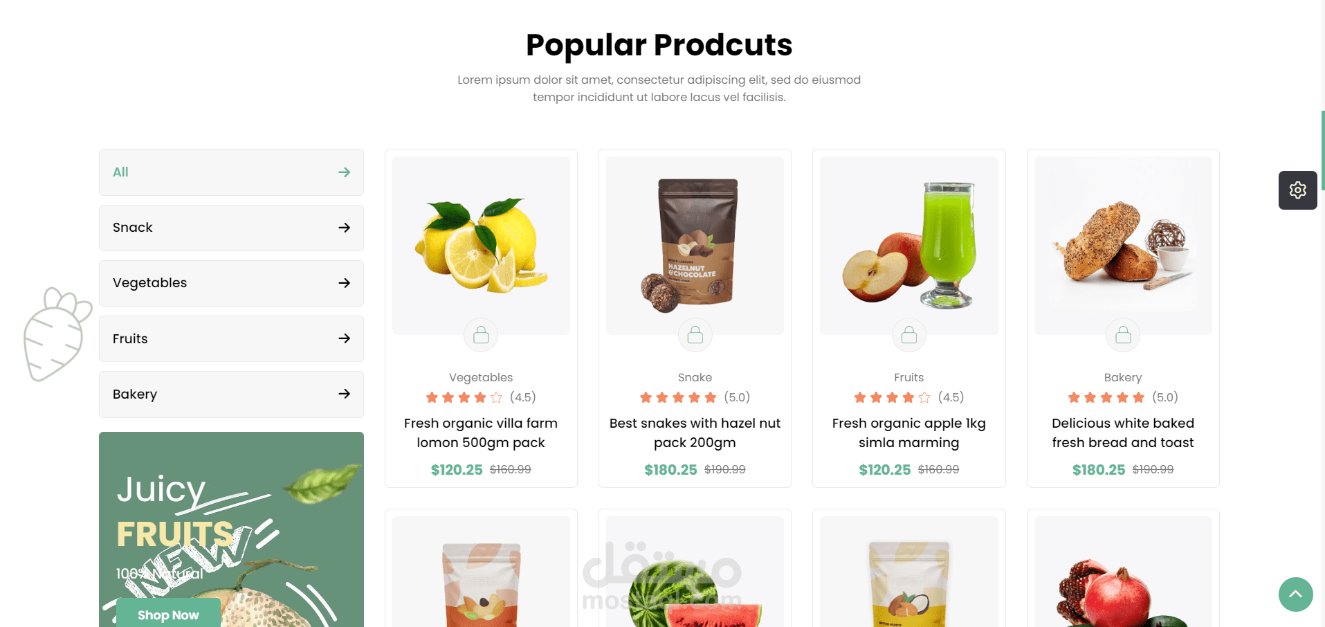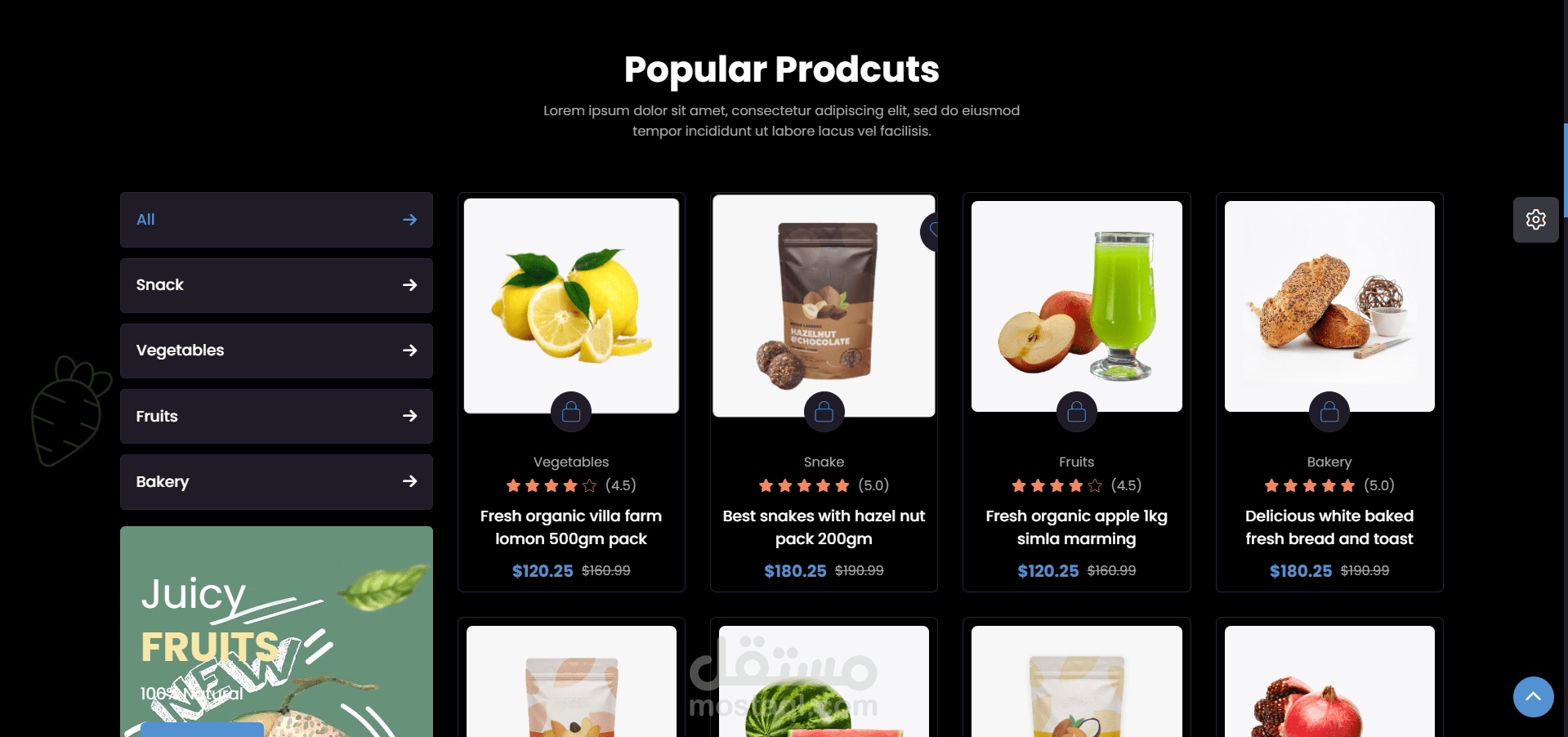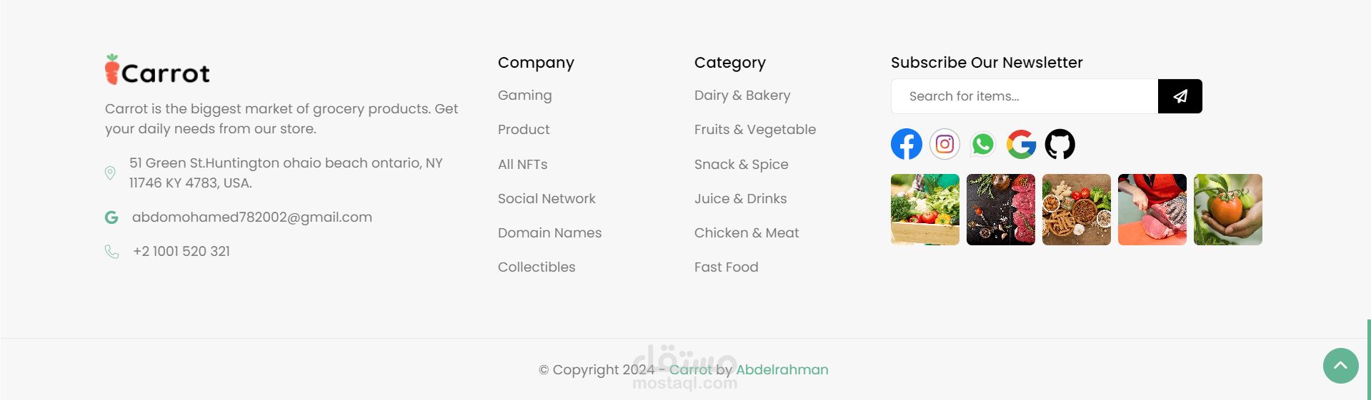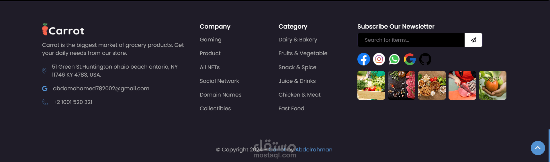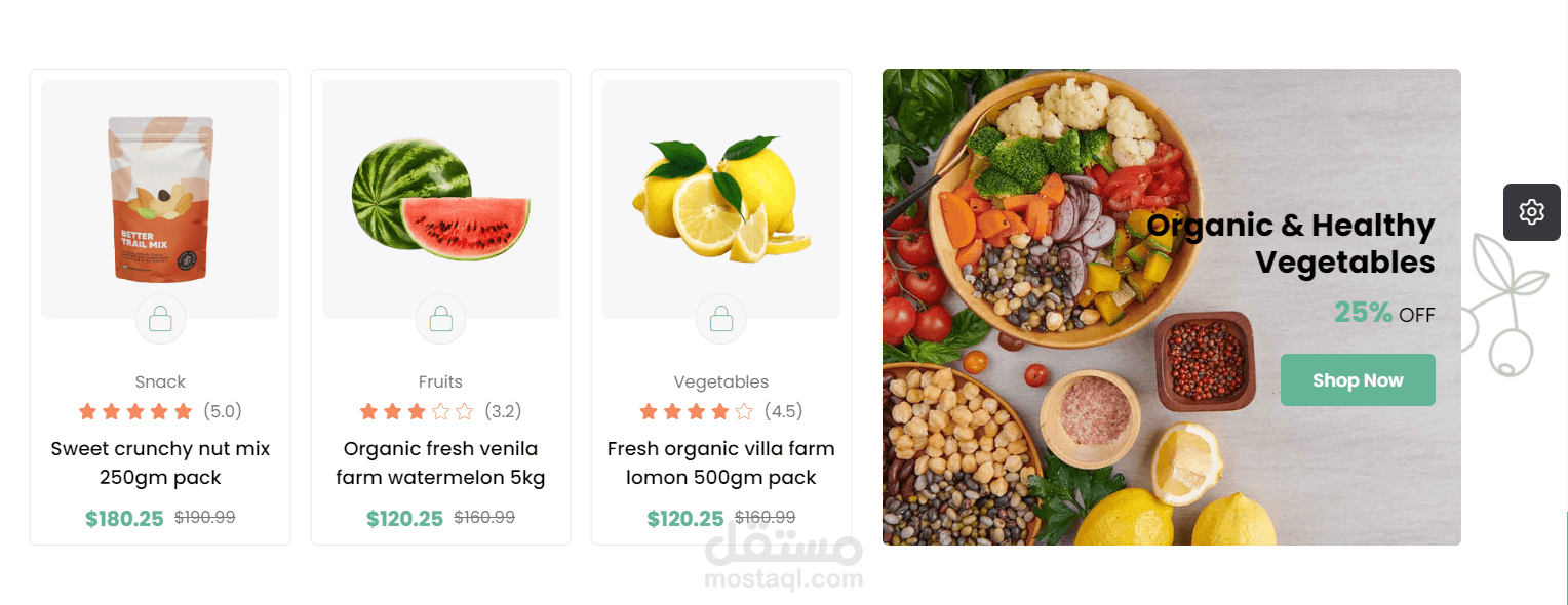 تم تصميم الموقع ليكون بمثابة سوق عبر الإنترنت يركز على المنتجات الطازجة والعضوية. إنه مشروع واجهة أمامية (Front-End) متكامل الميزات ومتجاوب (Responsive)، ويعرض مجموعة متنوعة من منتجات البقالة ووظائف التسوق. يتميز التصميم بألوانه الزاهية ويركز على العرض المرئي للمنتجات. كما يمكن للمستخدم أن يتحكم فى ألوان الموقع و جعله على الوضع الداكن ( dark mode ) .