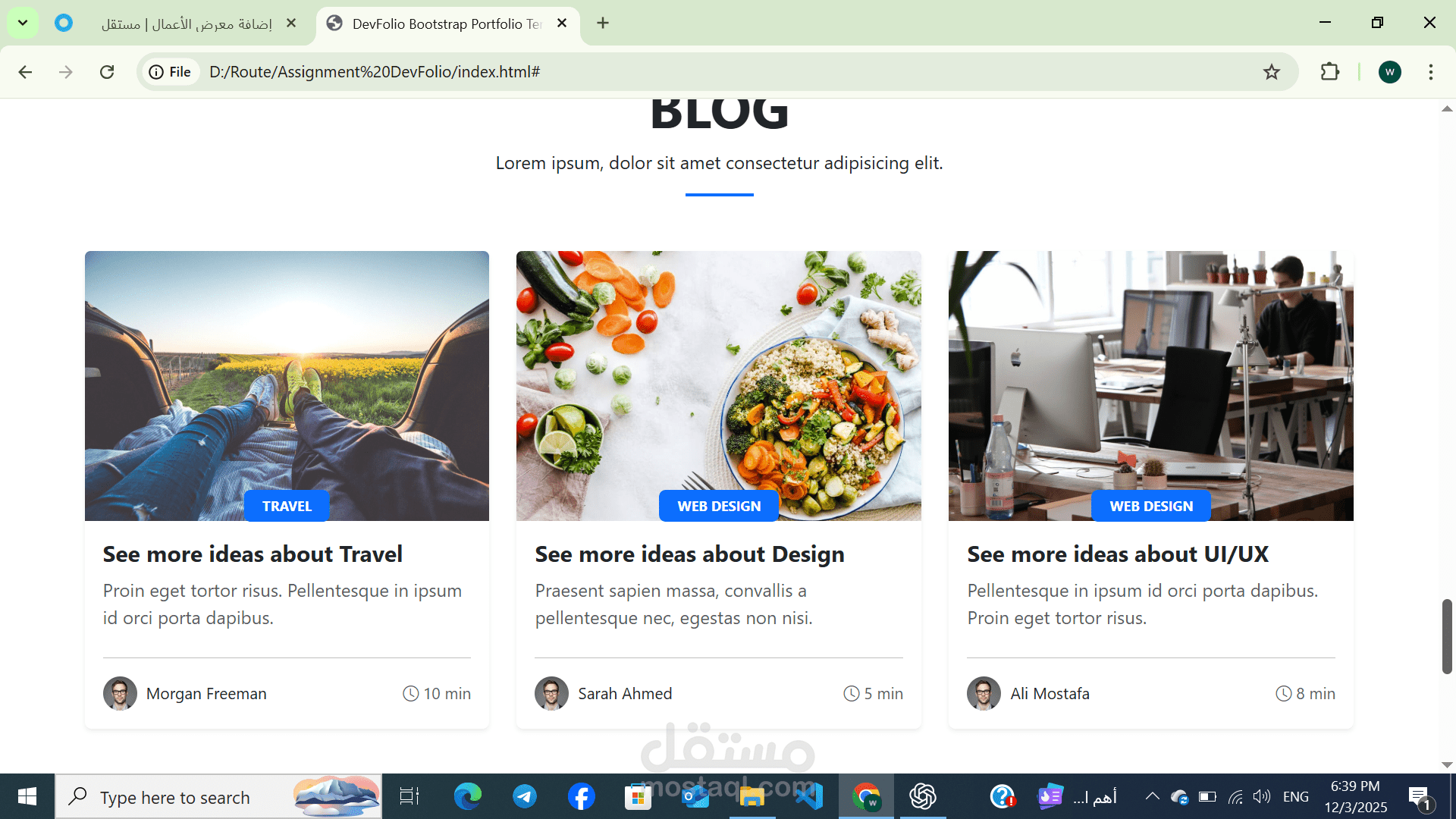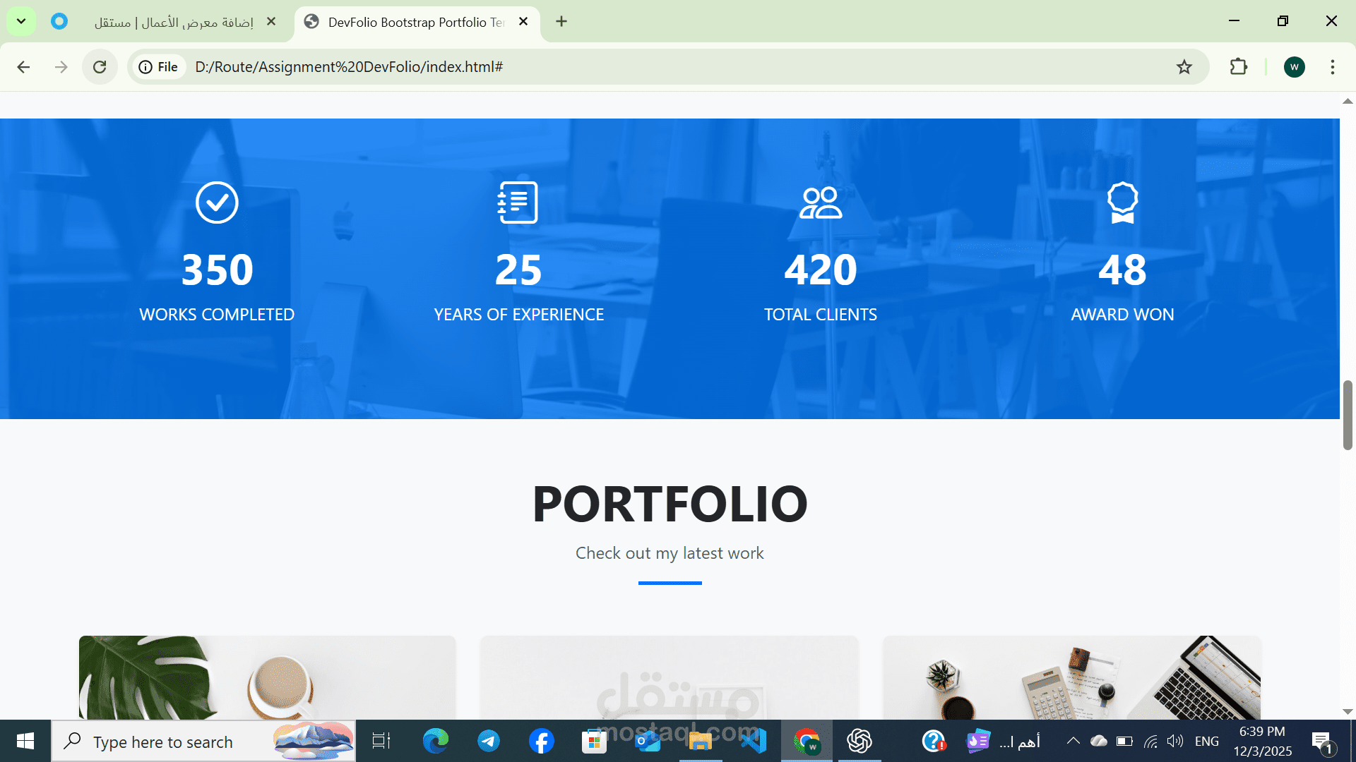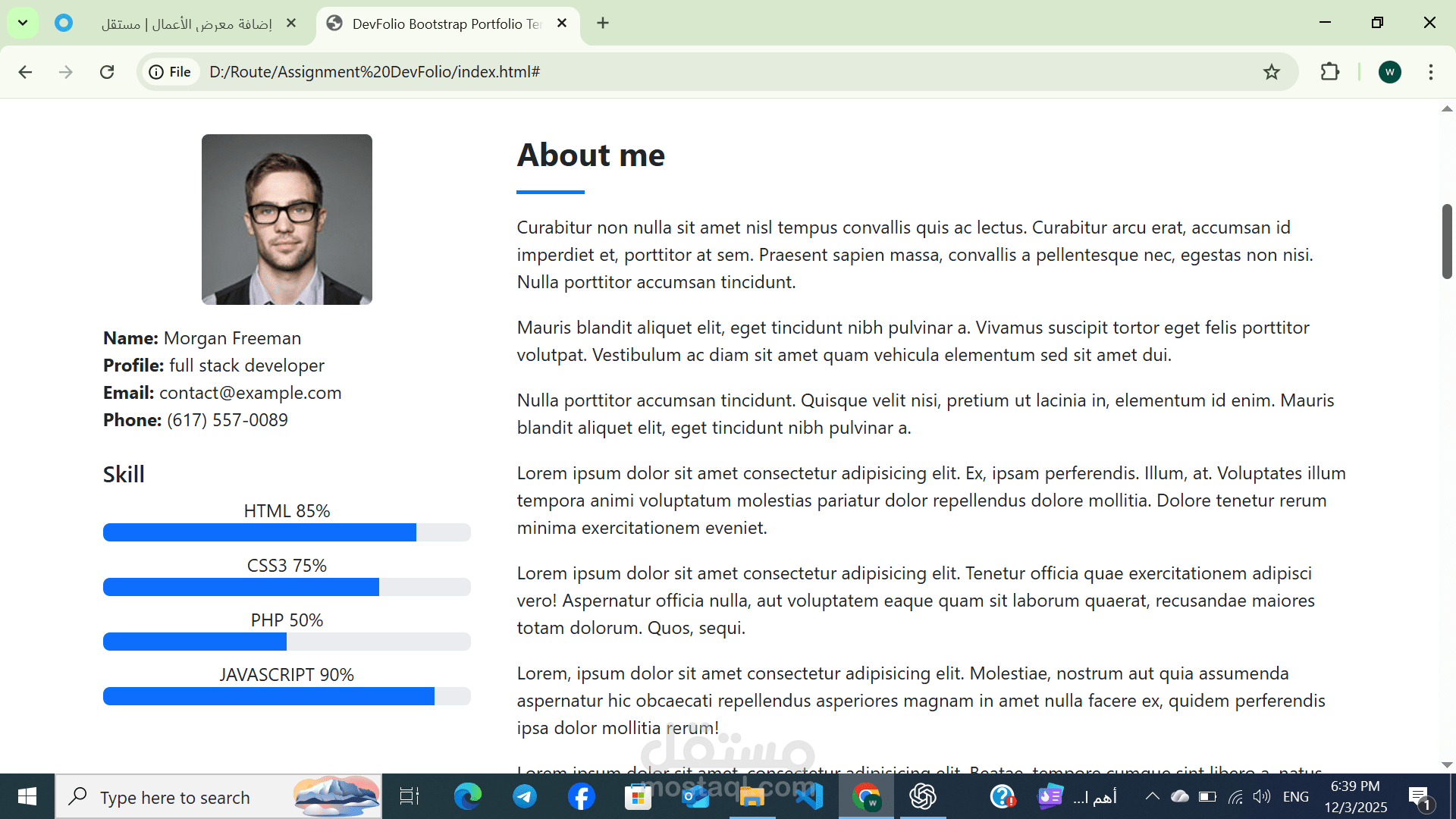 مشروع Devfolio هو موقع بورتفوليو شخصي تم تصميمه باستخدام Bootstrap بهدف عرض مهاراتي ومشاريعي بشكل احترافي ومرتب. يحتوي الموقع على أقسام أساسية مثل: نبذة عني، المهارات، الأعمال، الشهادات، وطرق التواصل.