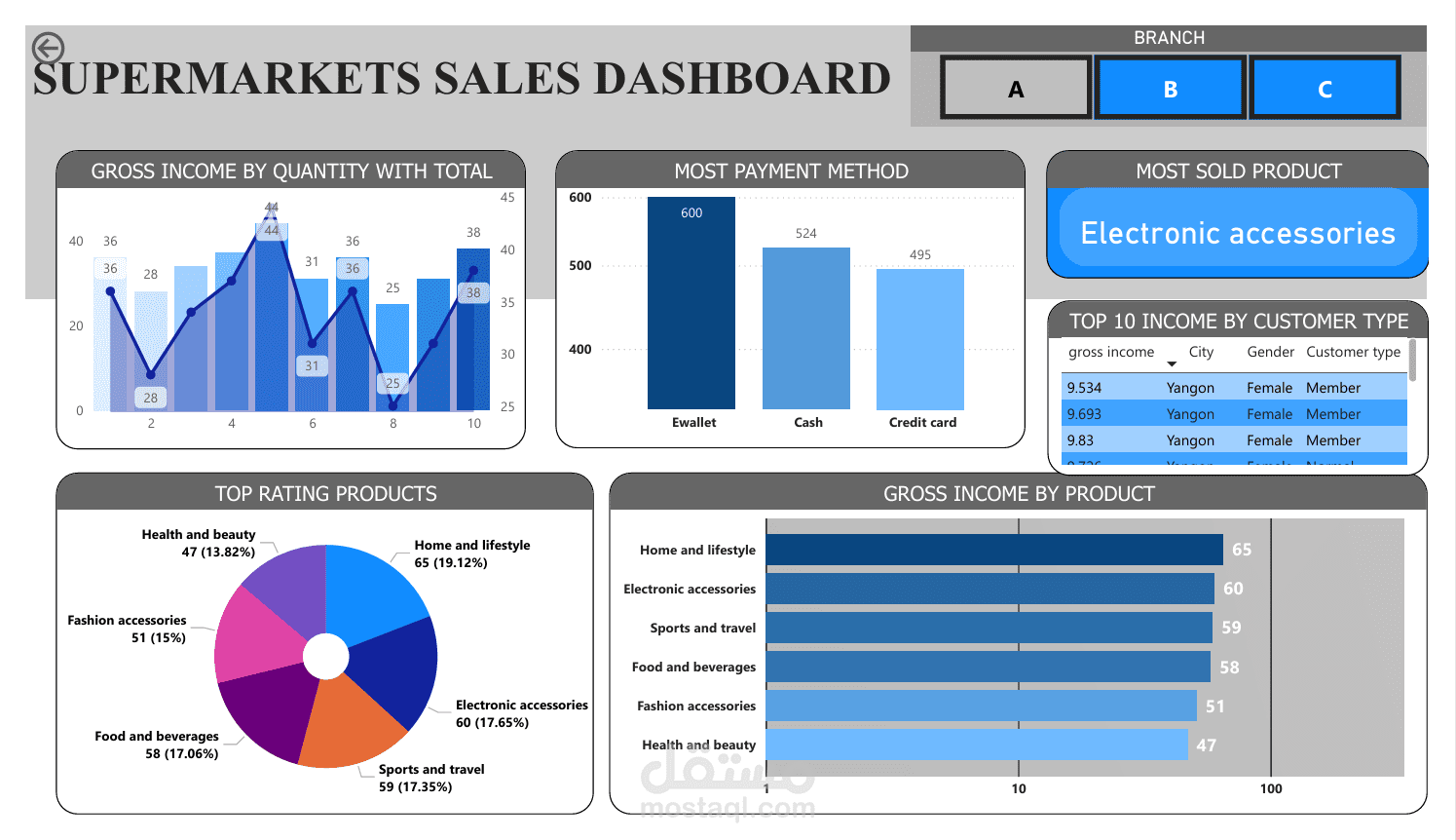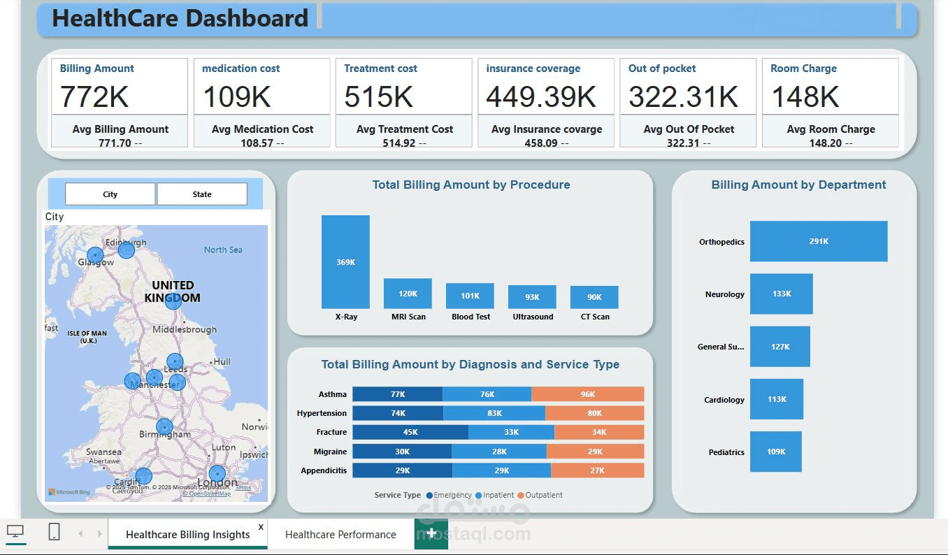 لوحة تحكم تحليلية متقدمة لقطاع الرعاية الصحية، تركز على الجوانب المالية (الفواتير والتكاليف) والكفاءة التشغيلية للأقسام الطبية. تساعد الإدارة في تتبع مصادر الدخل وتكاليف العلاج.