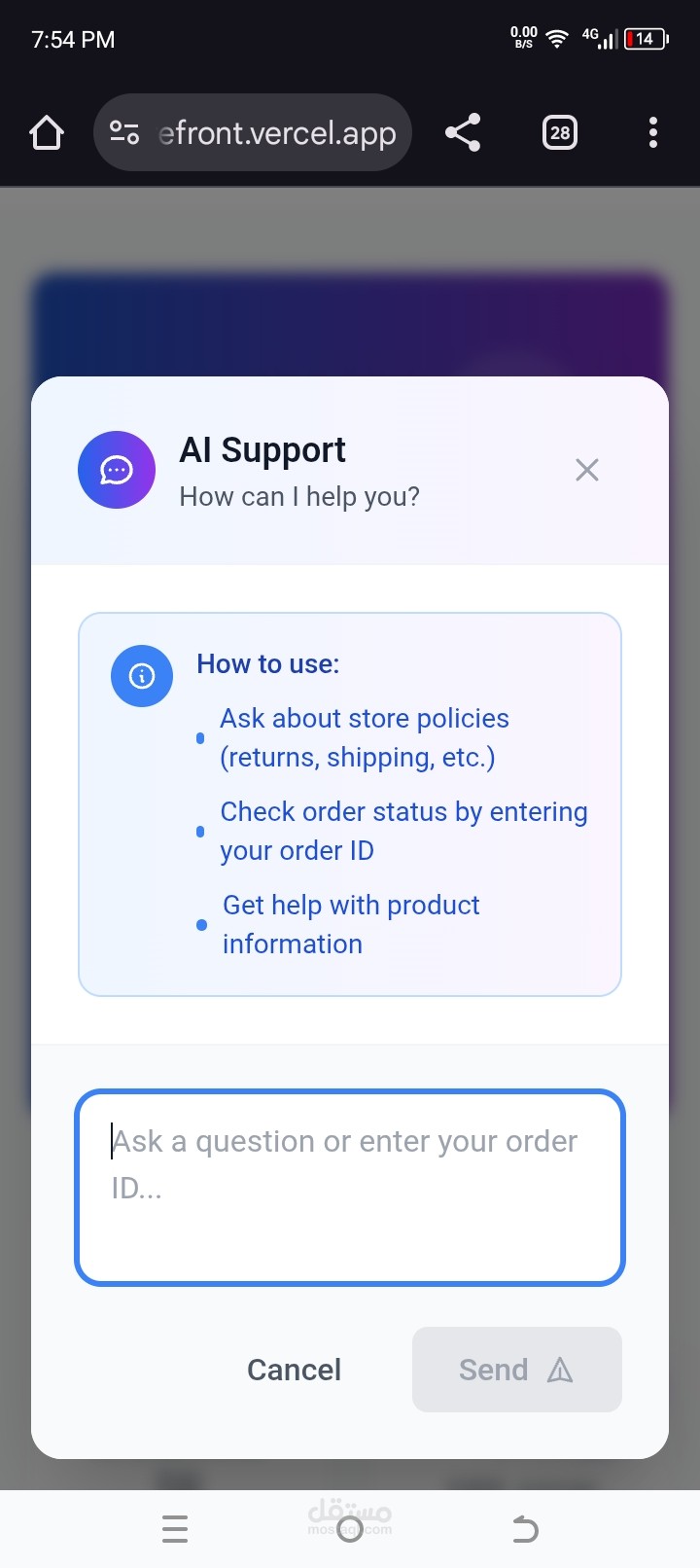 مساعد ذكي (AI Automation): قمت بدمج نموذج ذكاء اصطناعي (Hugging Face API) لعمل "مساعد شخصي" داخل المتجر. هذا المساعد يفهم نوايا المستخدم (Intent Classification)، ويجيب على الأسئلة الشائعة، ويتحدث باللغتين العربية والإنجليزية، مما يقلل الحاجة للدعم البشري.