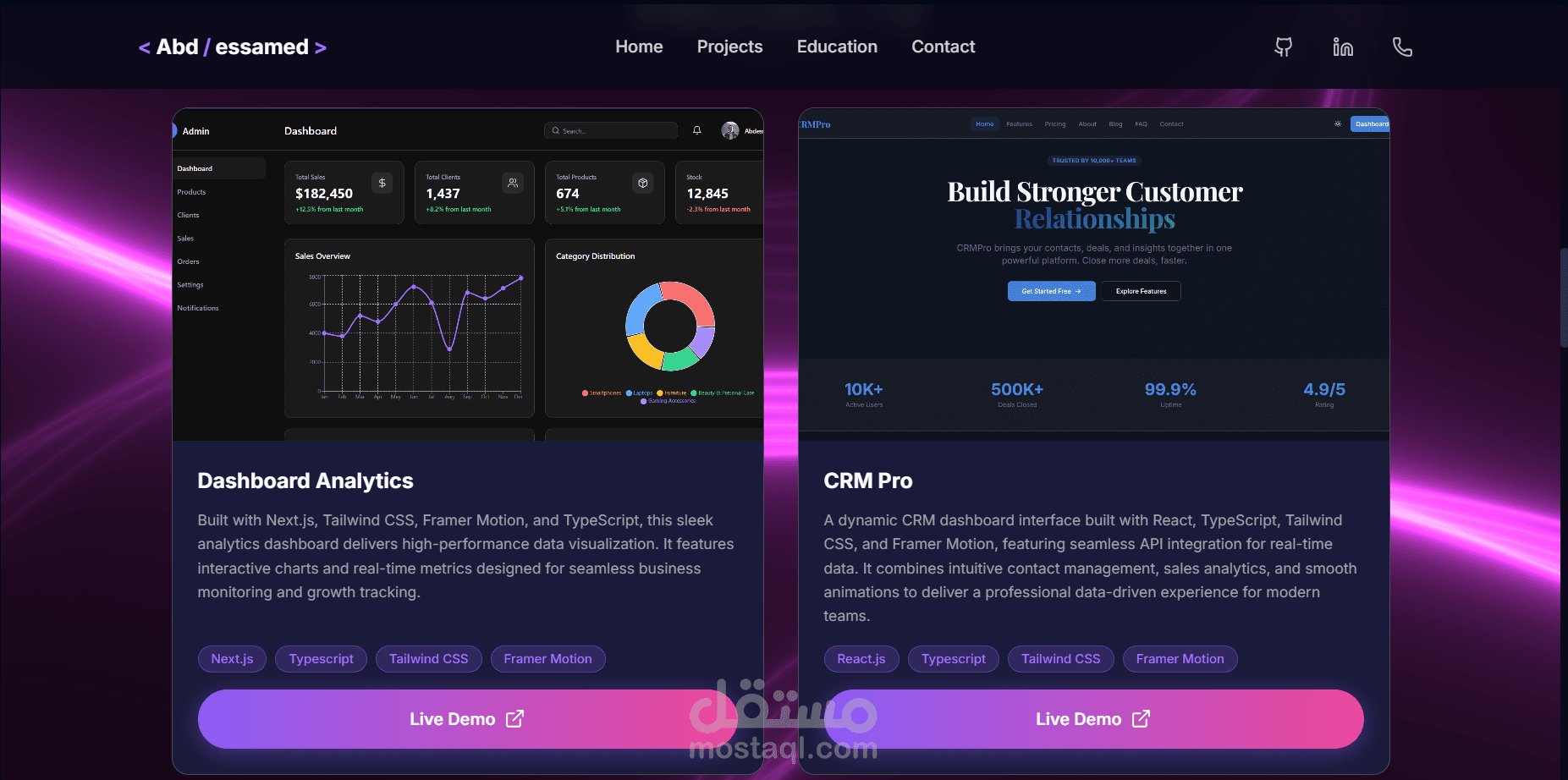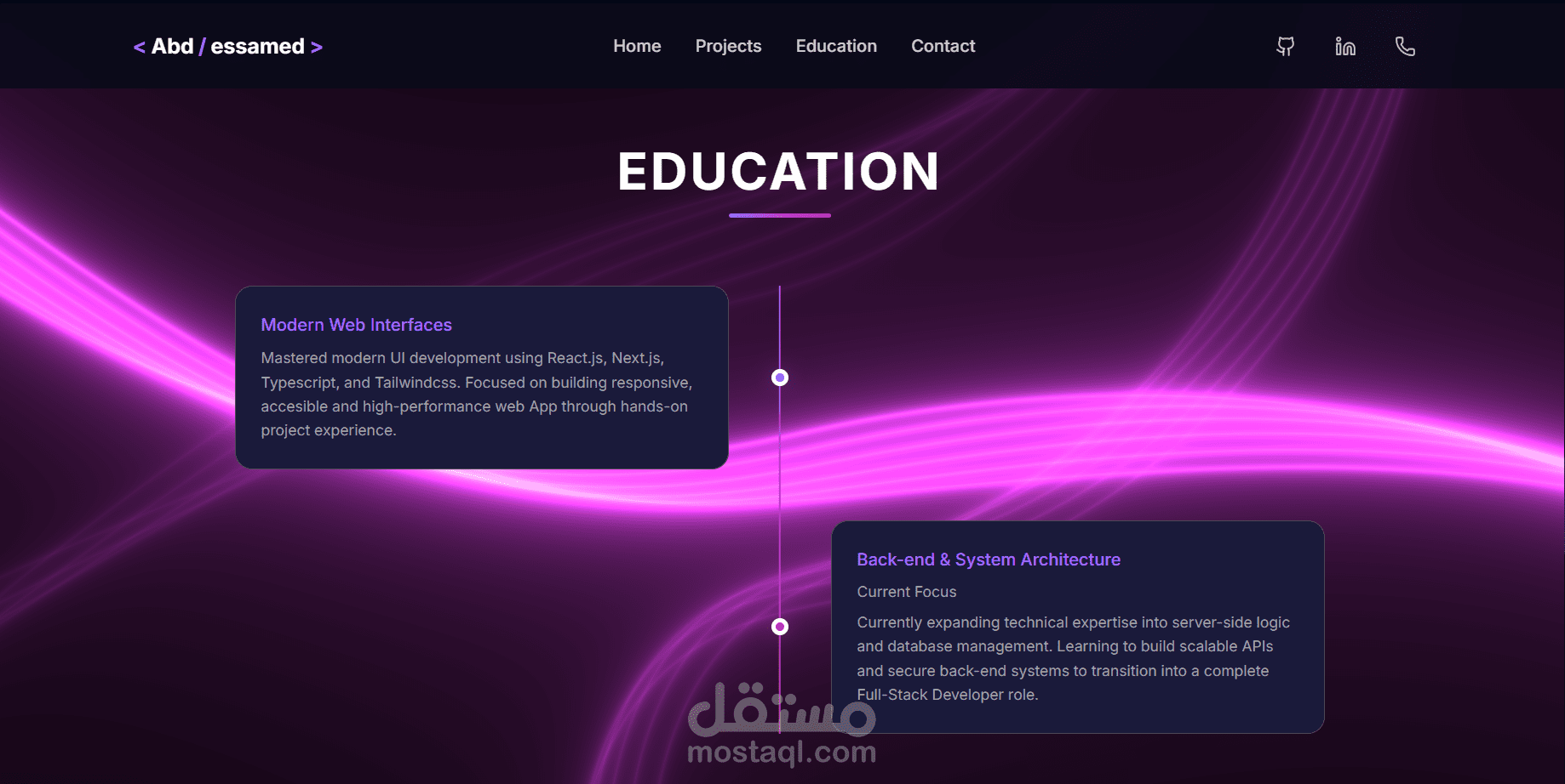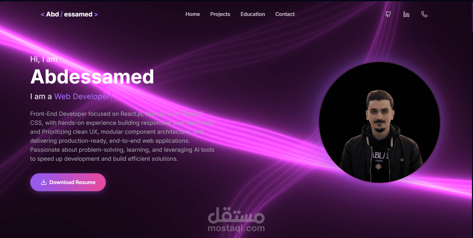 موقع شخصي حديث مبني باستخدام React.js و Typescript و TailwindCSS، و تتميز بانتقالات سلسة وتصميم متجاوب.