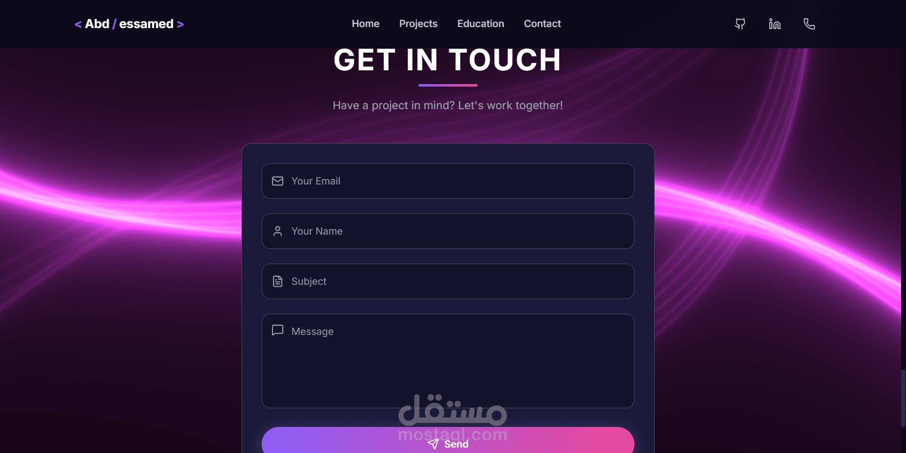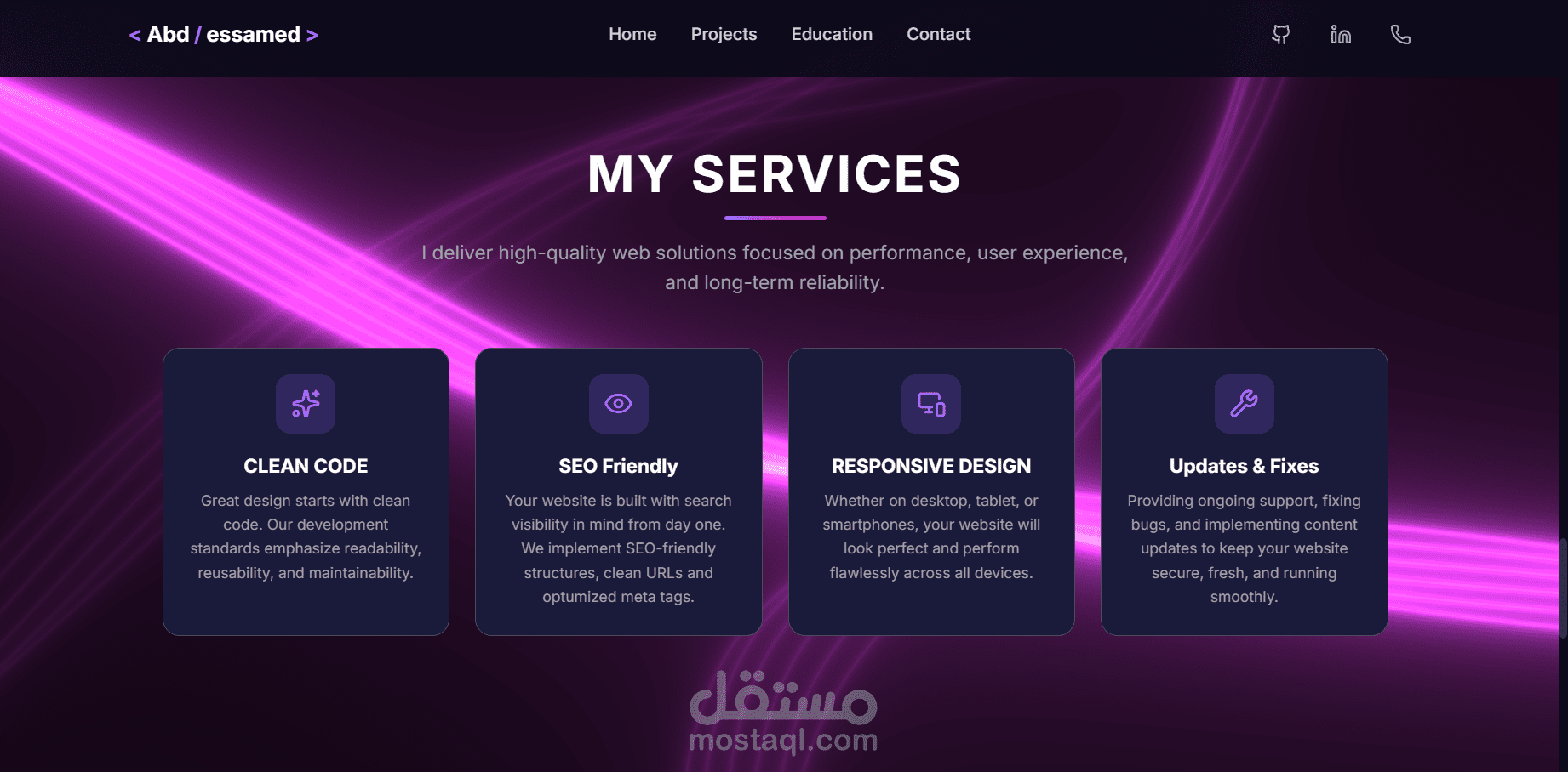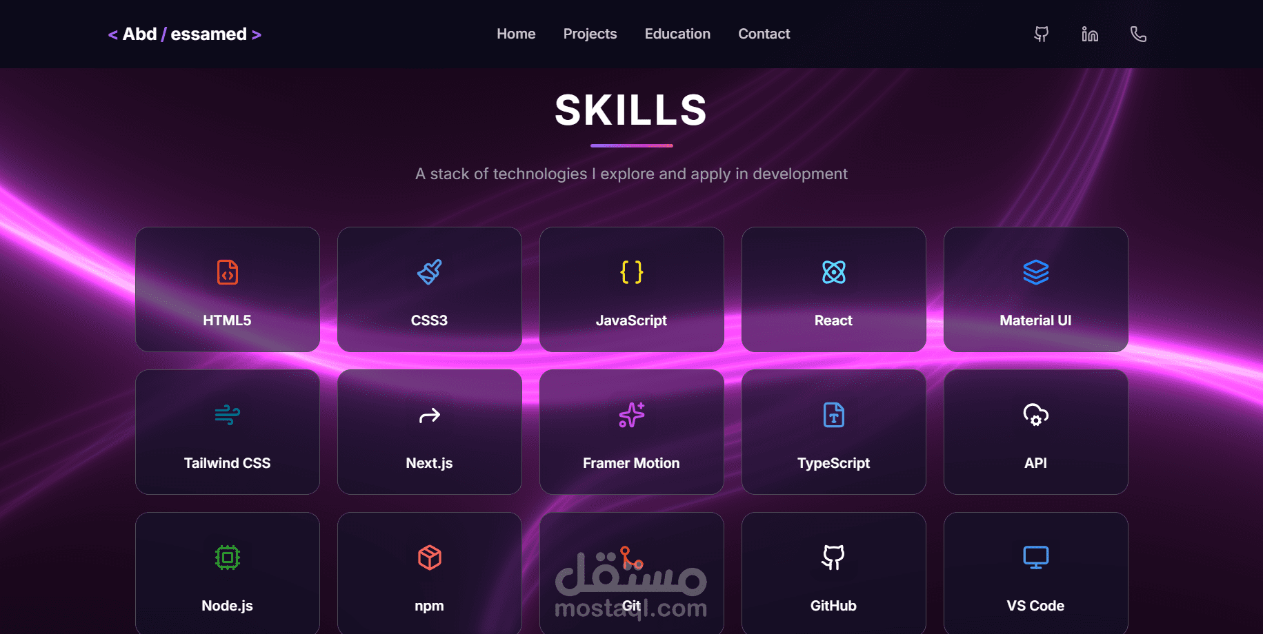 موقع شخصي حديث مبني باستخدام React.js و Typescript و TailwindCSS، و تتميز بانتقالات سلسة وتصميم متجاوب.
