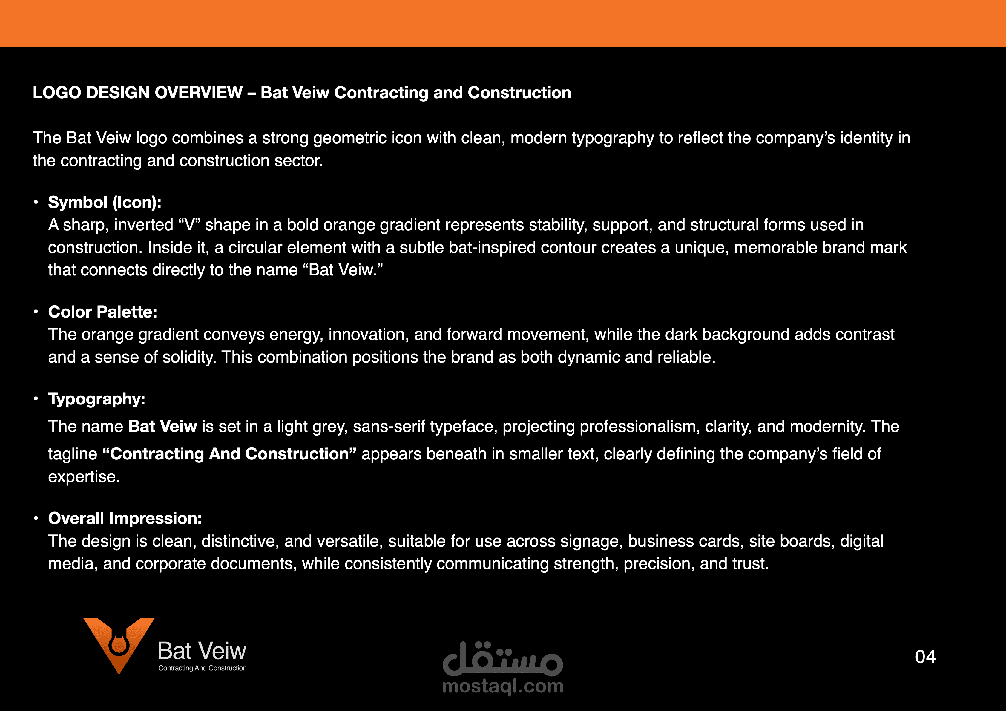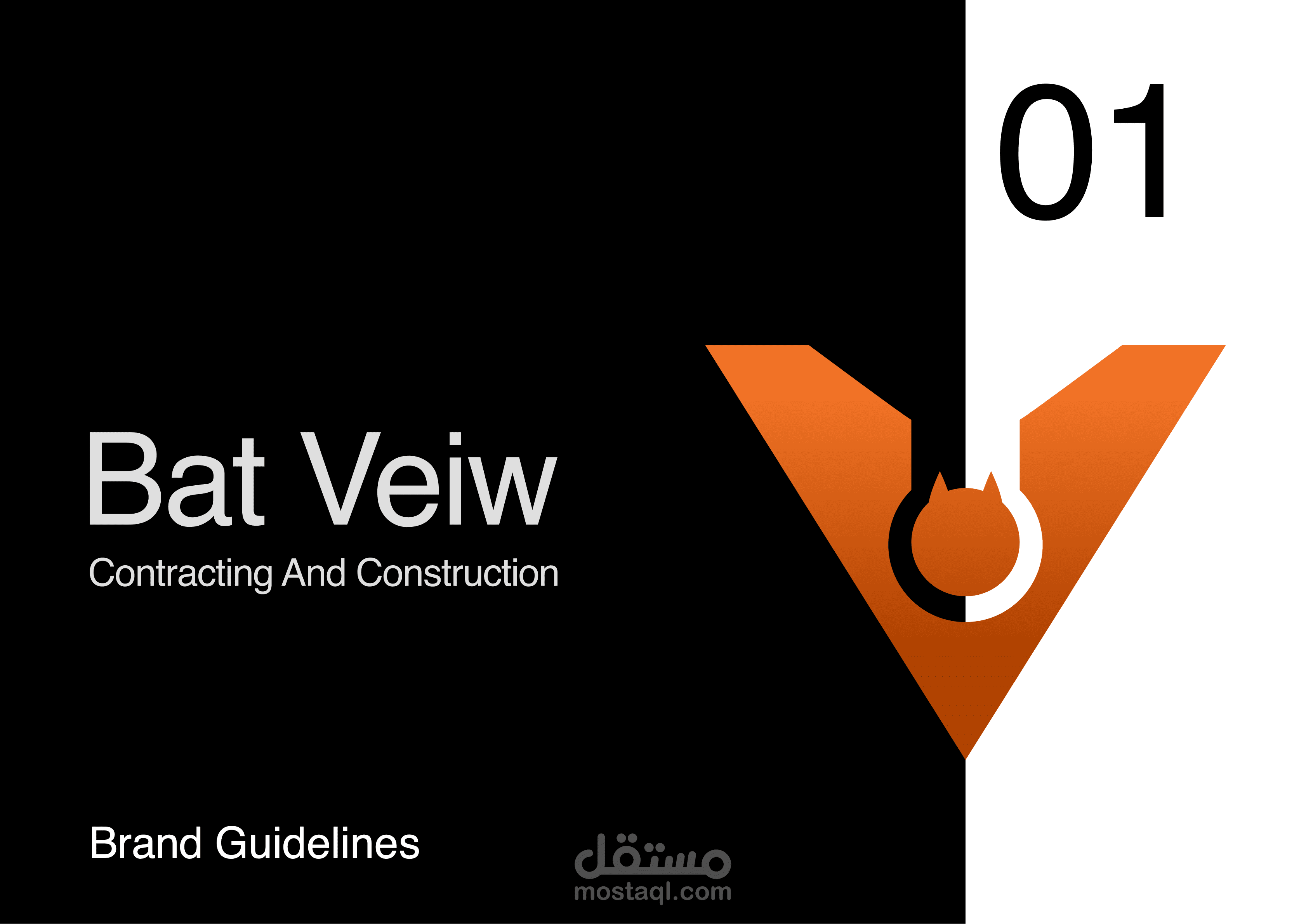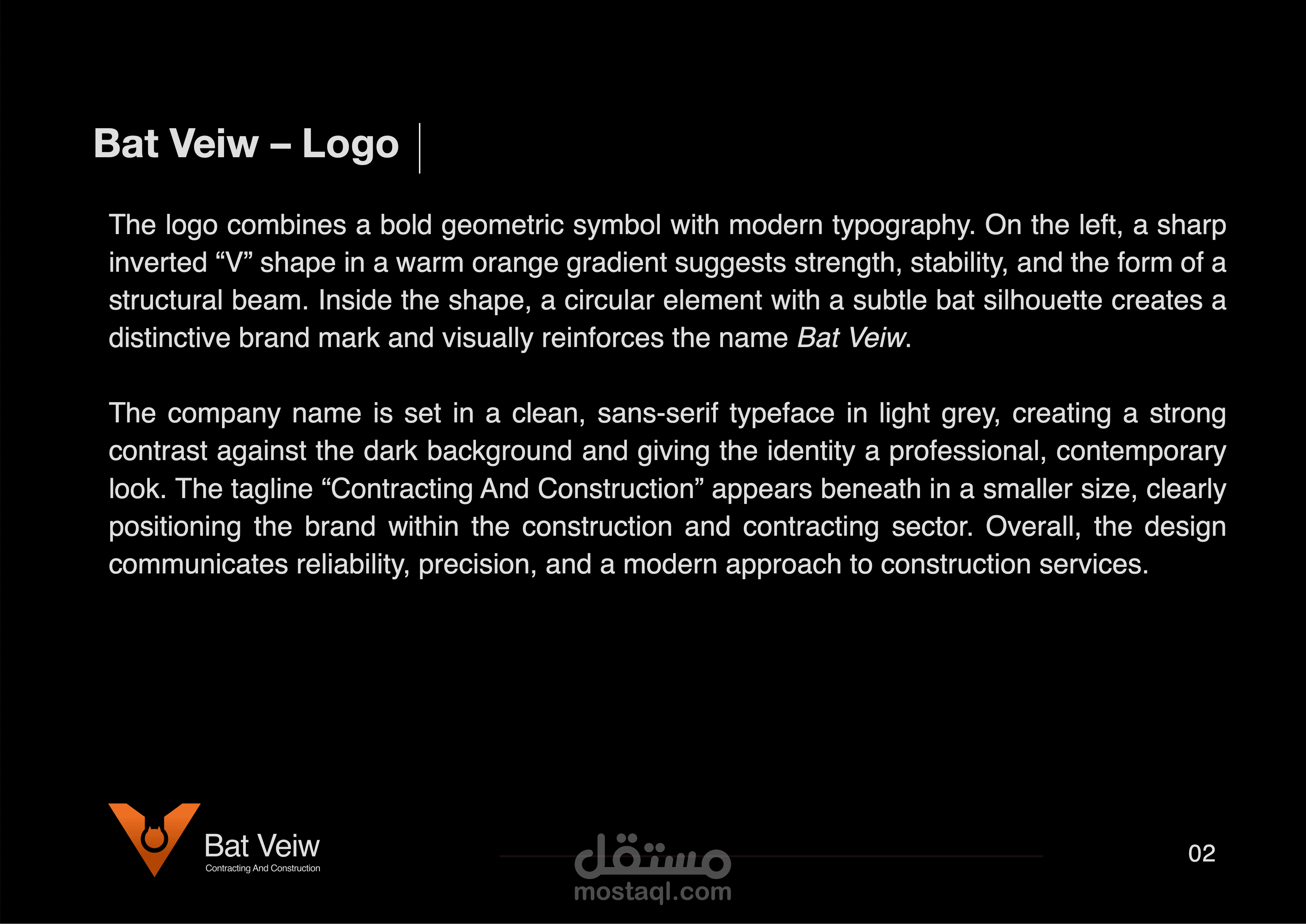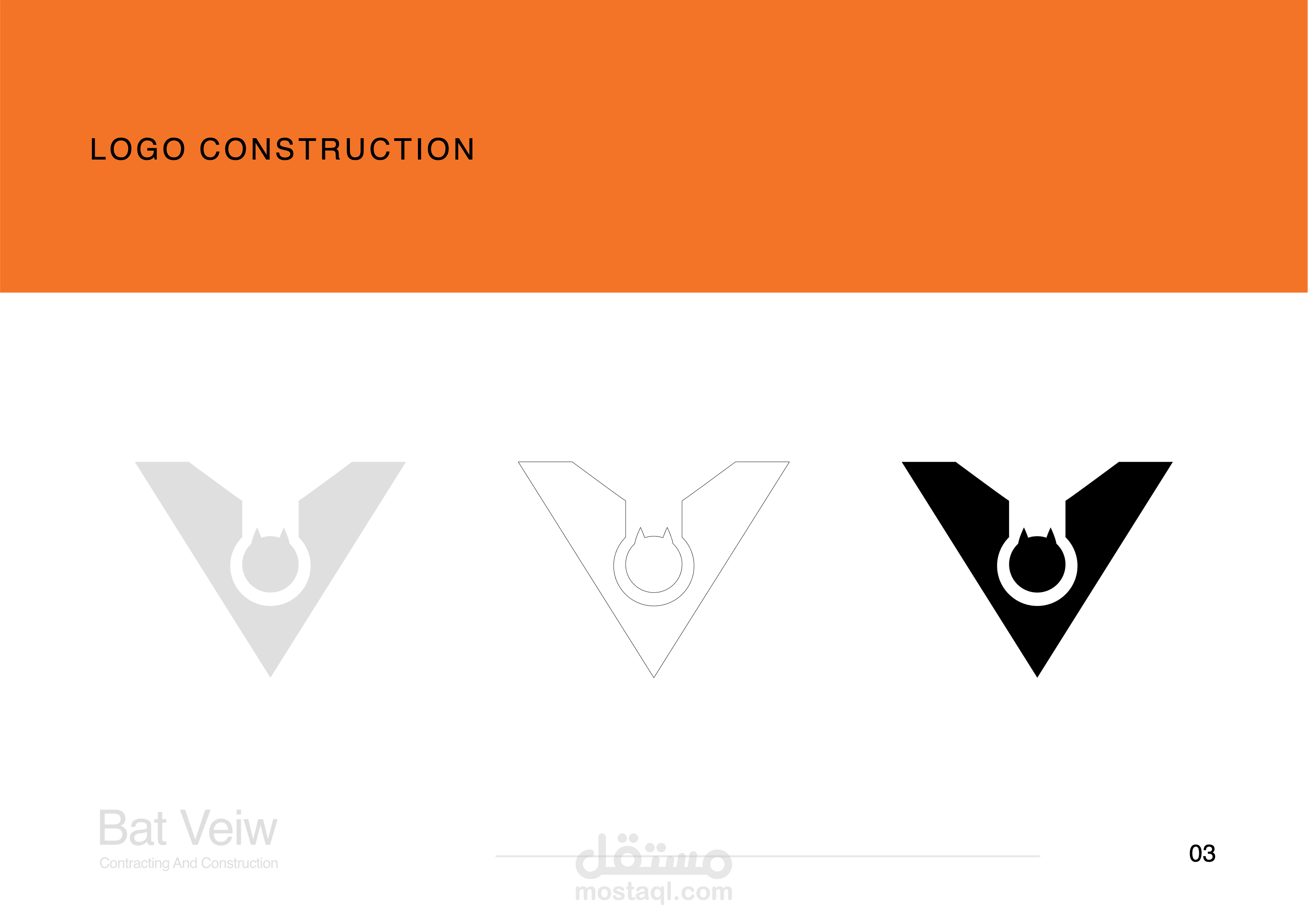 تم ابتكار رمز هندسي على شكل حرف V مقلوب بلون برتقالي متدرّج، يرمز إلى الدعائم الإنشائية والاستقرار، ويتوسطه شكل دائري يوحي بعالم البناء والمعدات الثقيلة، مع لمحة تجريدية لرمز “الخفاش” المرتبط باسم الشركة، مما يخلق علامة مميزة وسهلة التذكر.
