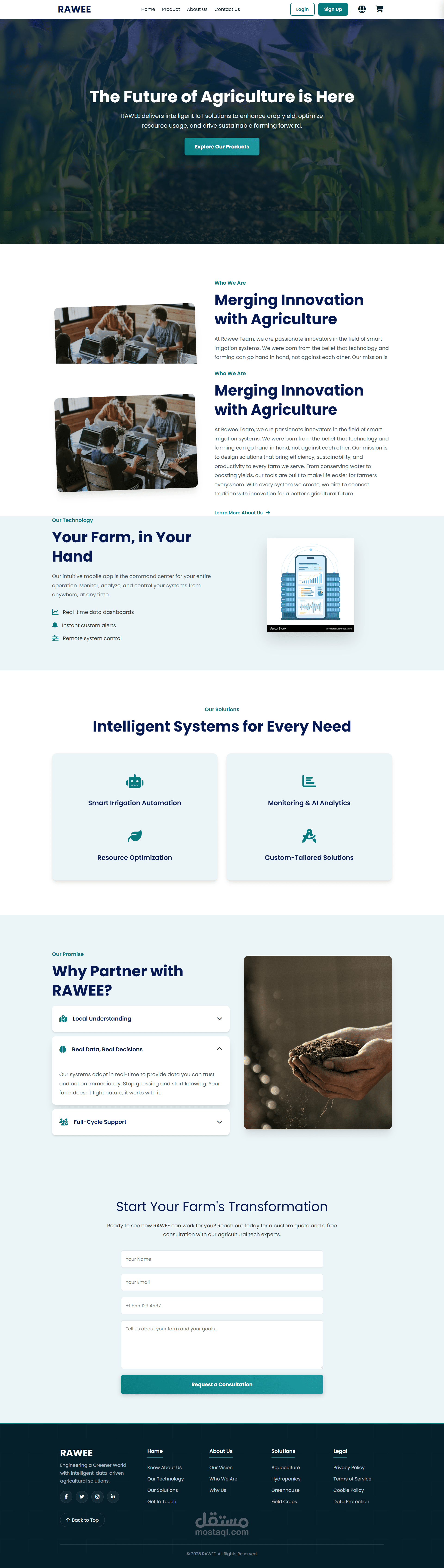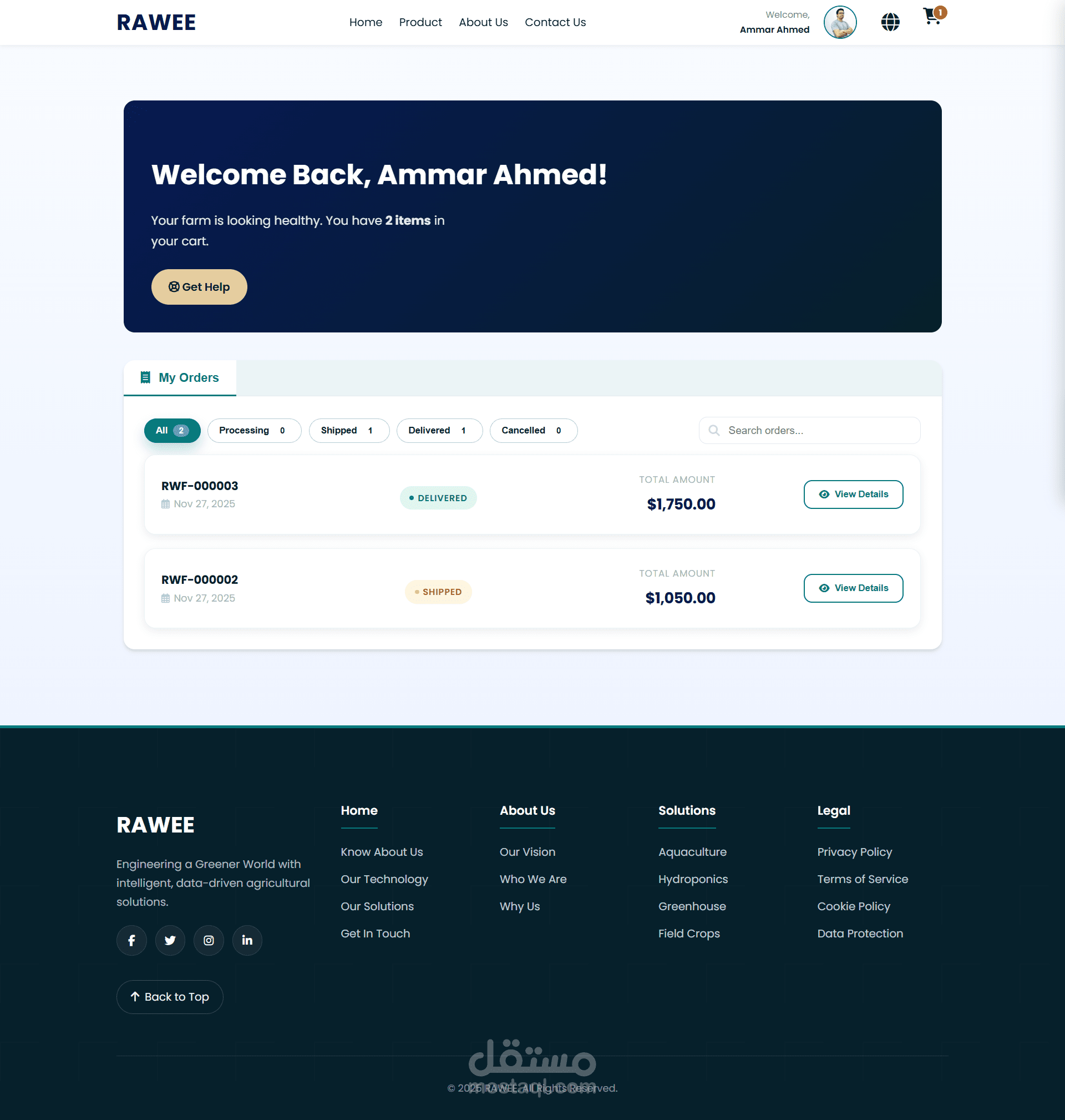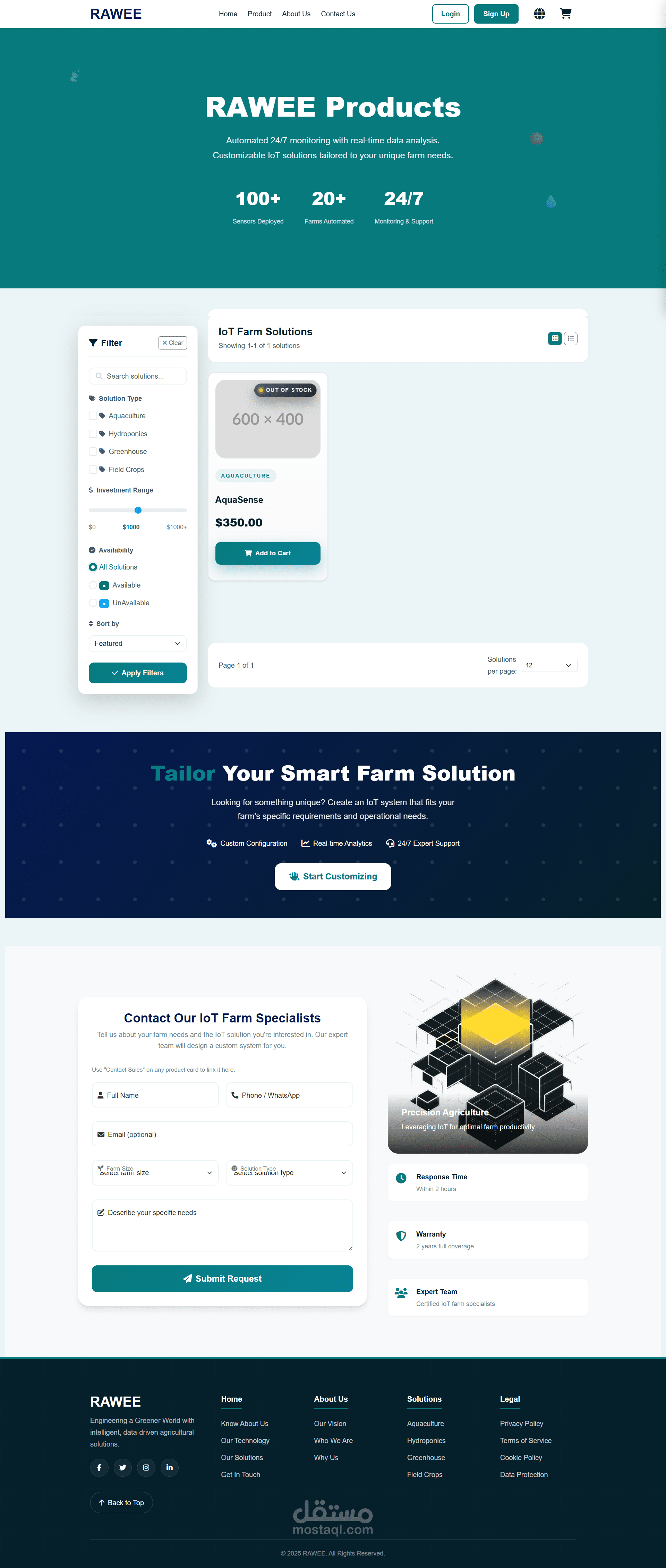 في مشروع RAWEE للزراعة الذكية، شاركت في تطوير منصة إلكترونية متكاملة تربط حلول إنترنت الأشياء (IoT) بالواجهة الرقمية للشركة، بهدف توحيد تجربة المستخدم والإدارة عبر الموقع ولوحة التحكم. ركز التطوير على بناء نظام مرن وقابل للتوسع يجمع بين عرض خدمات الشركة وإدارة المستخدمين والمنتجات والطلبات ضمن بيئة واحدة متناسقة.