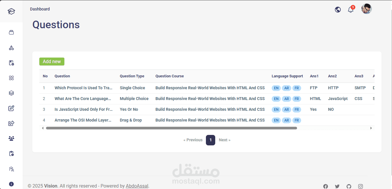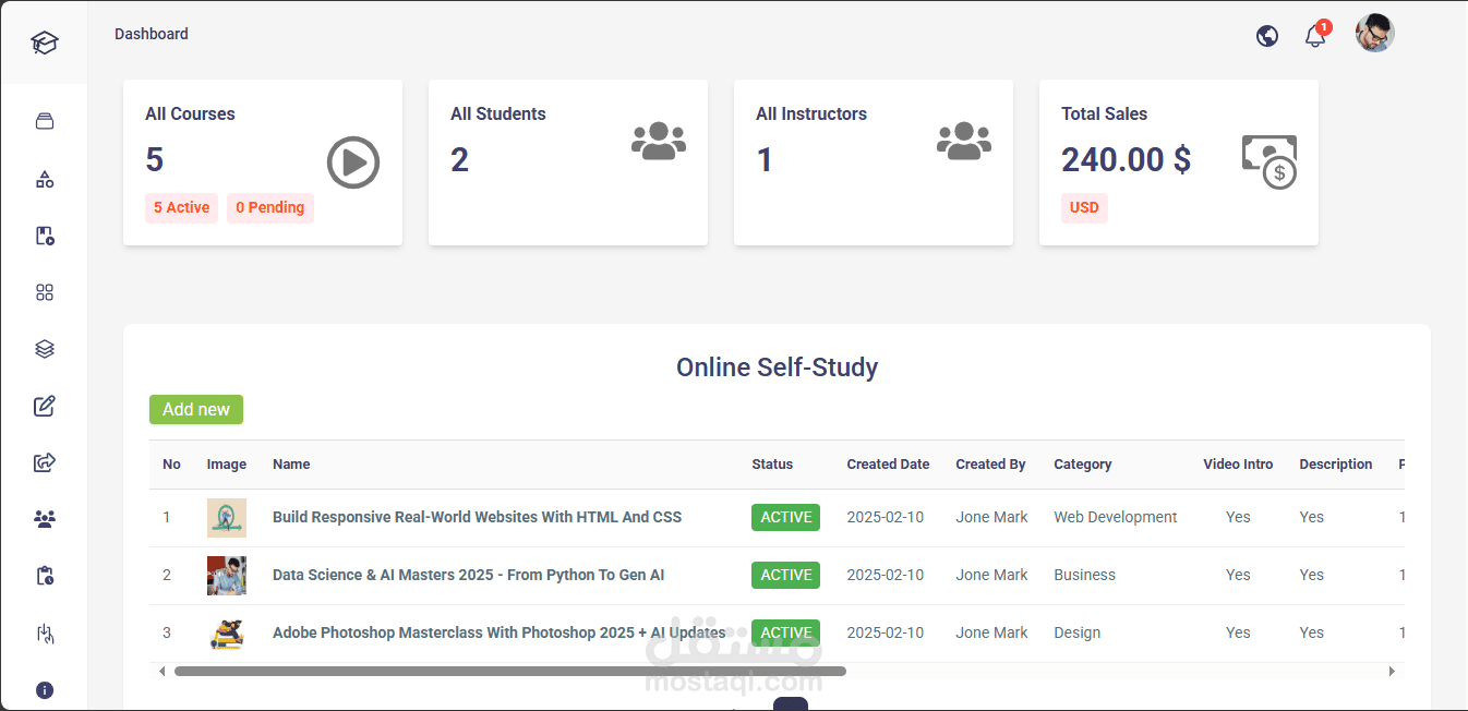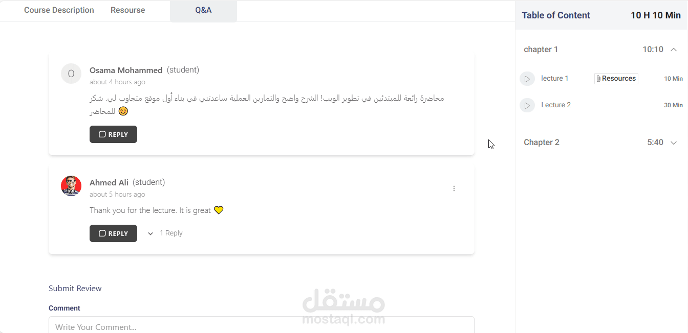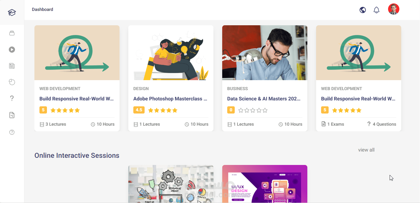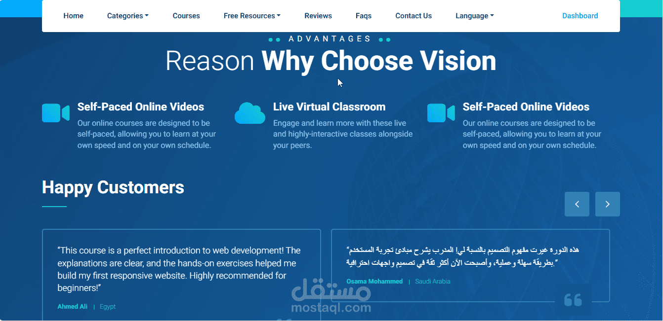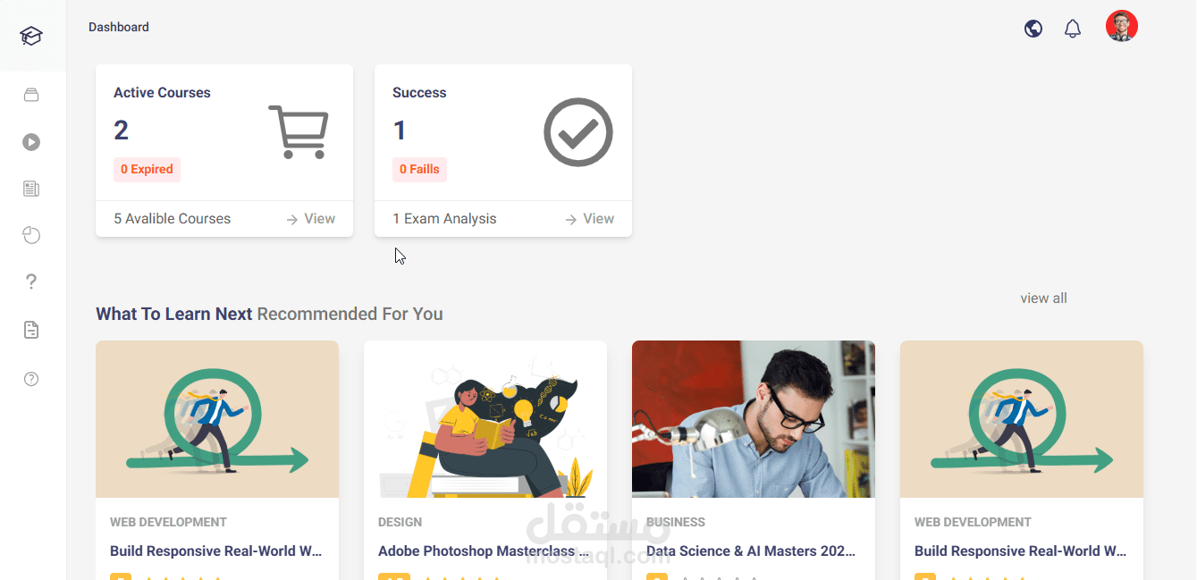 منصة احترافية لإدارة التعلم عبر الإنترنت، تربط المعلمين والطلاب والإداريين في نظام متكامل وسهل الاستخدام، ليقوموا بتنزيل دوراتهم التدريبية و الكورسات من محاضرات وامتحانات وملفات مرفقة تخص المادة التعليمية او المحاضرة مع نظام تتبع للامتحانات والتقيم، مع تصميم متجاوب ودعم الوضع الداكن.