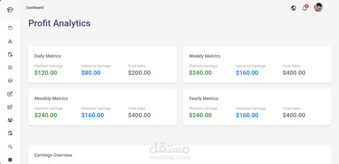لوحة تحكم المسؤول (إدارة المستخدمين، الدورات، الأرباح، والتحليلات).