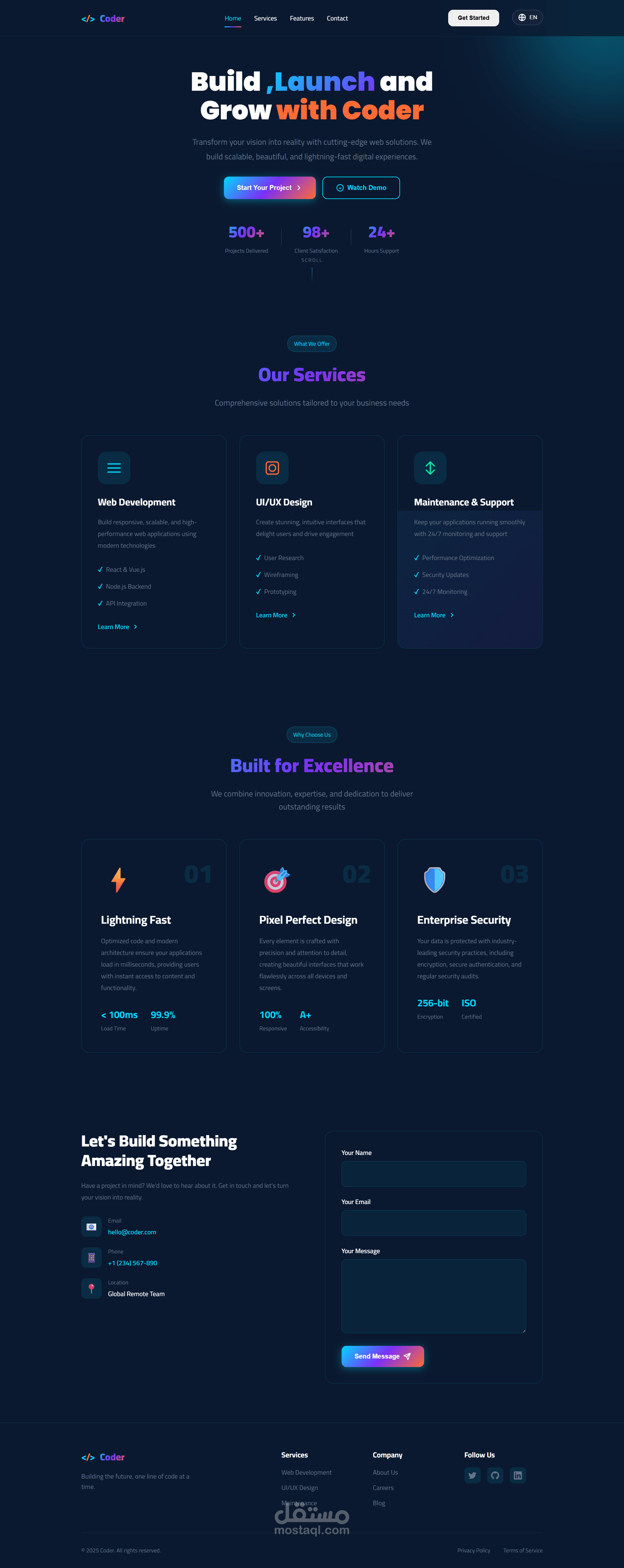- قسم خدمات شامل يعرض تطوير الويب، تصميم UI/UX، والصيانة والدعم.