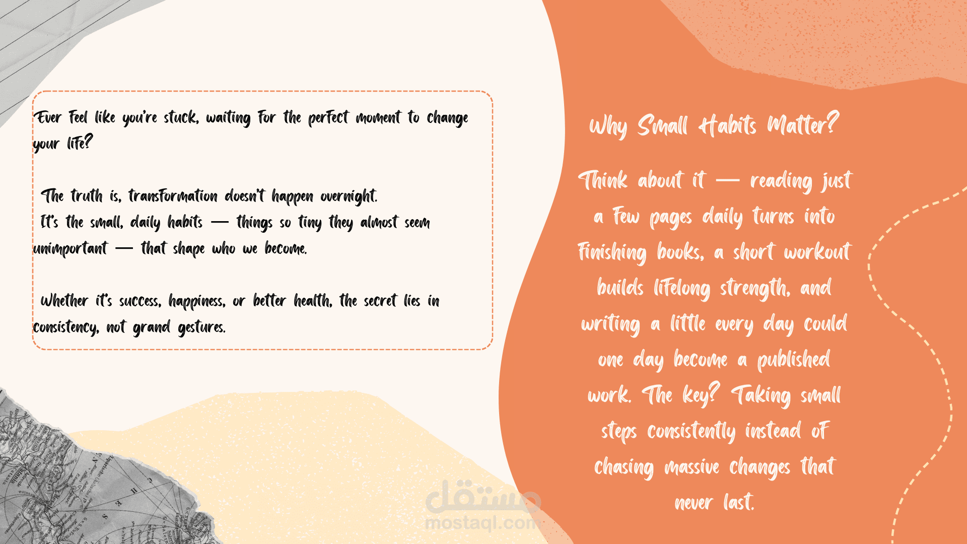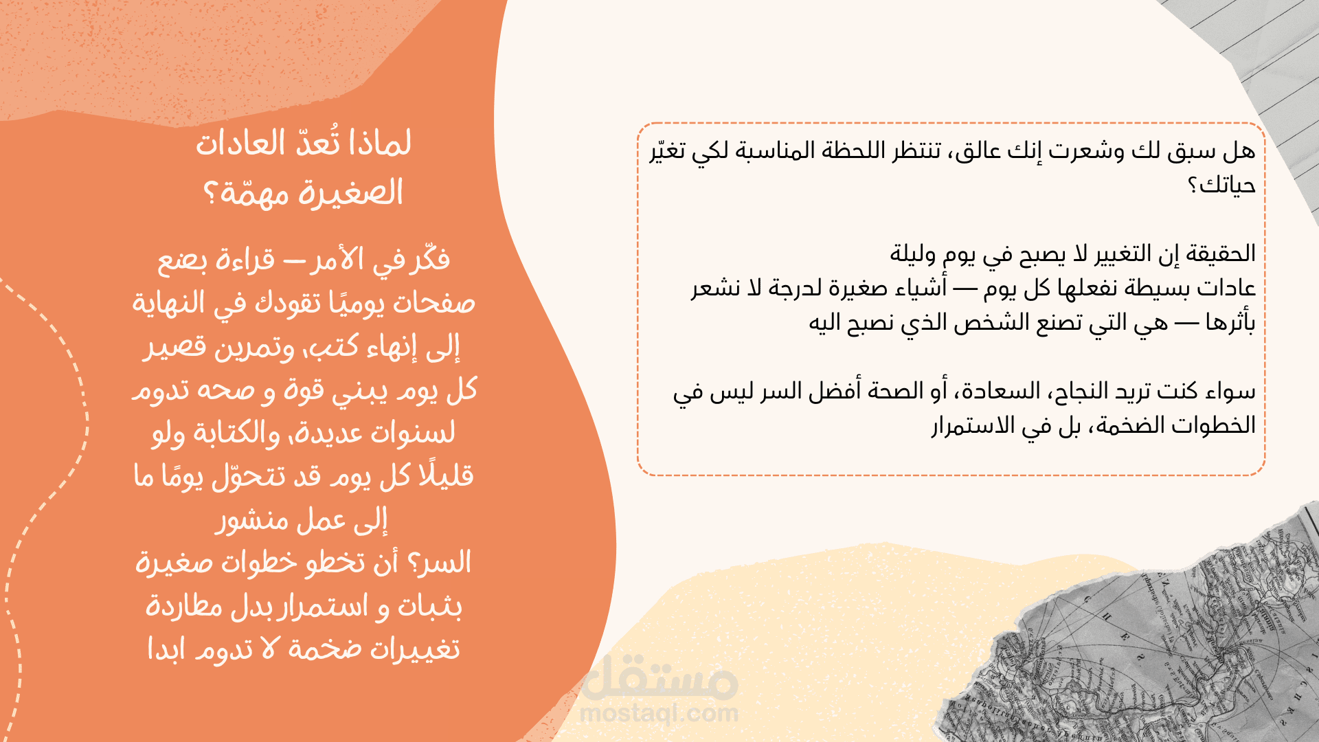 هذا العمل عبارة عن ترجمة مقالة مكتوبة بالأنجليزيه للكاتب Sidharth Barman تتحدث عن العادات الصغيرة وأثرها على حياتك. (التصميم تصميمي باستخدام كانفا)