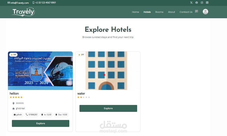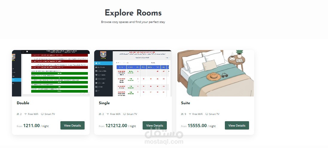 عرض الفنادق والغرف المتاحة (HotelsController, RoomsController).